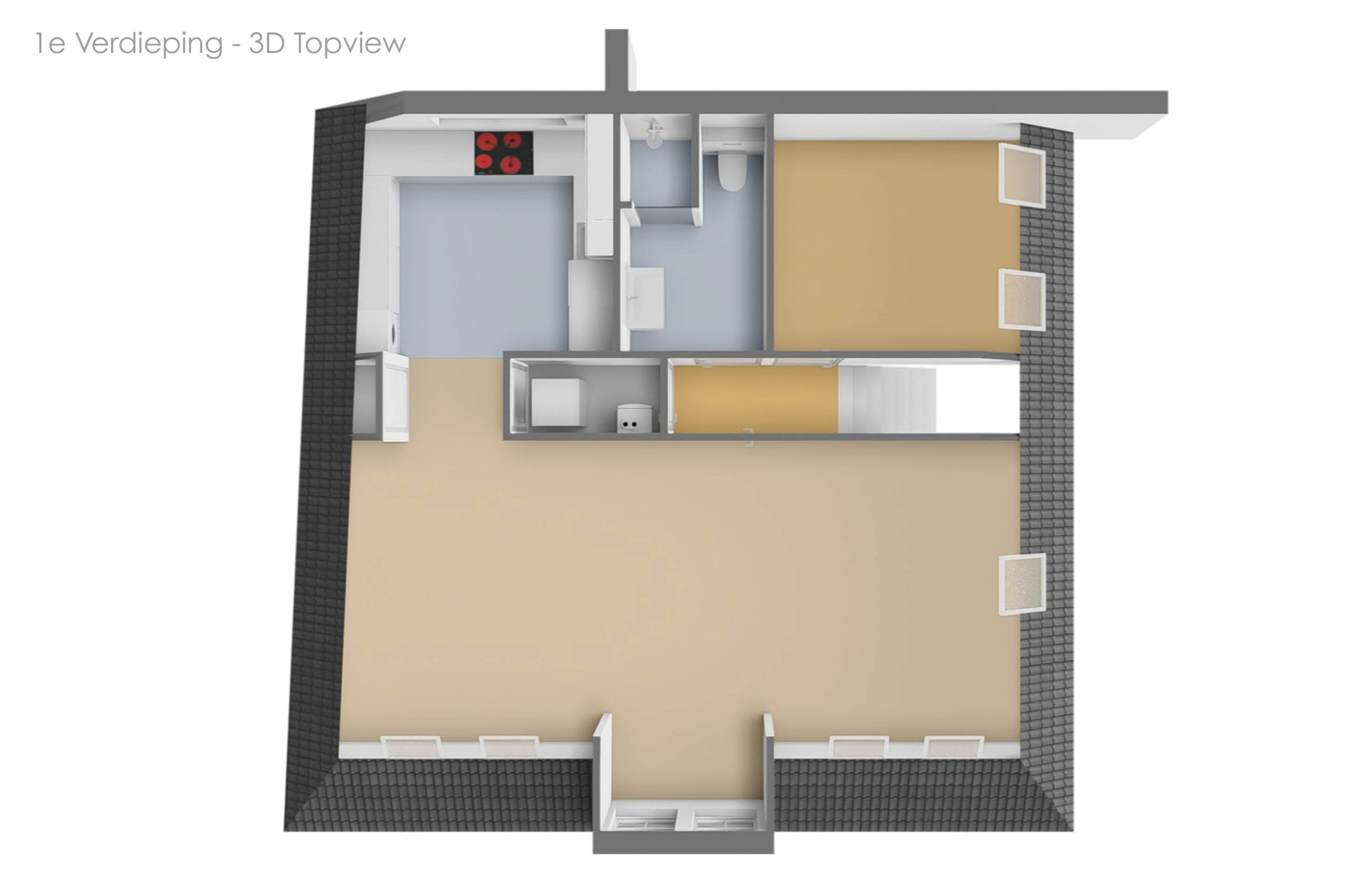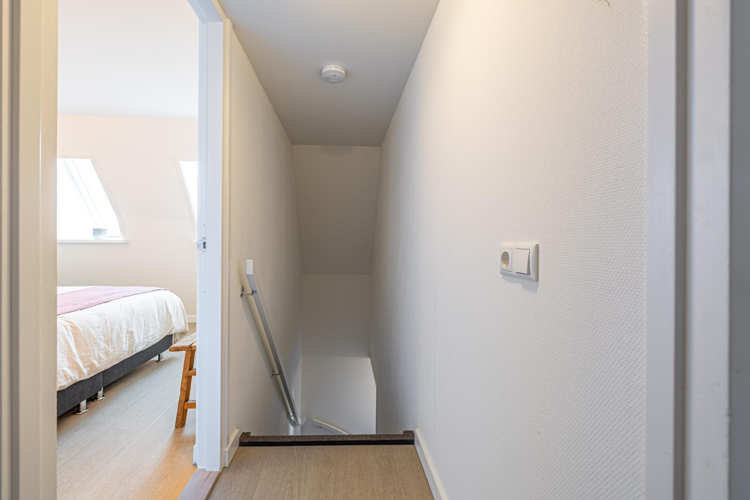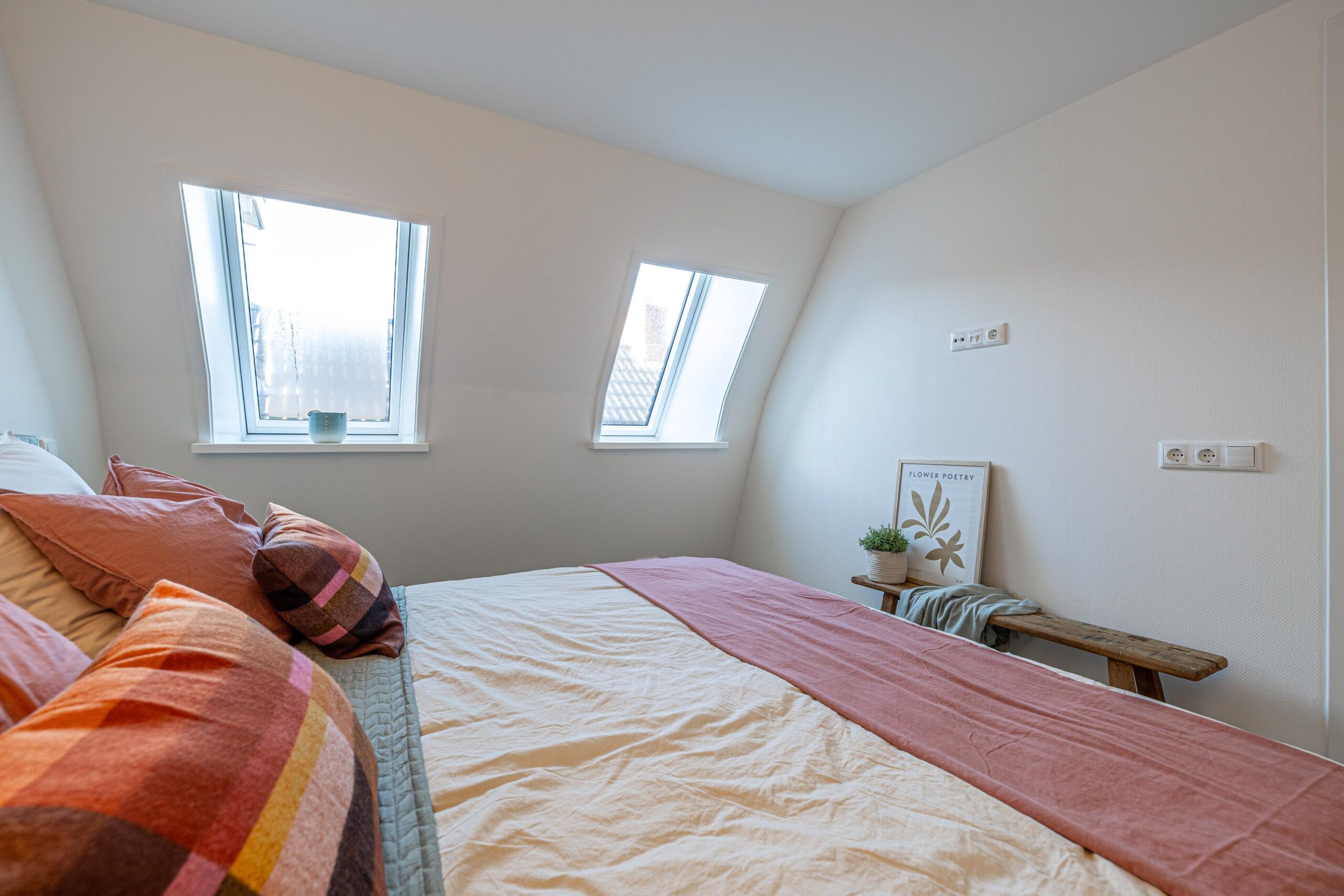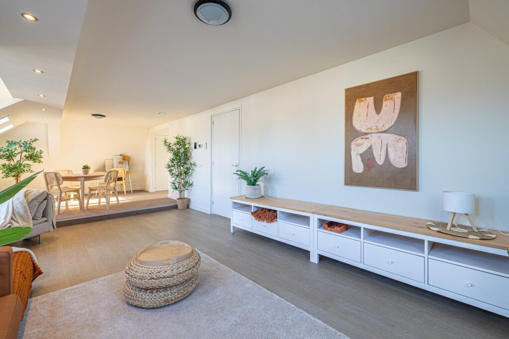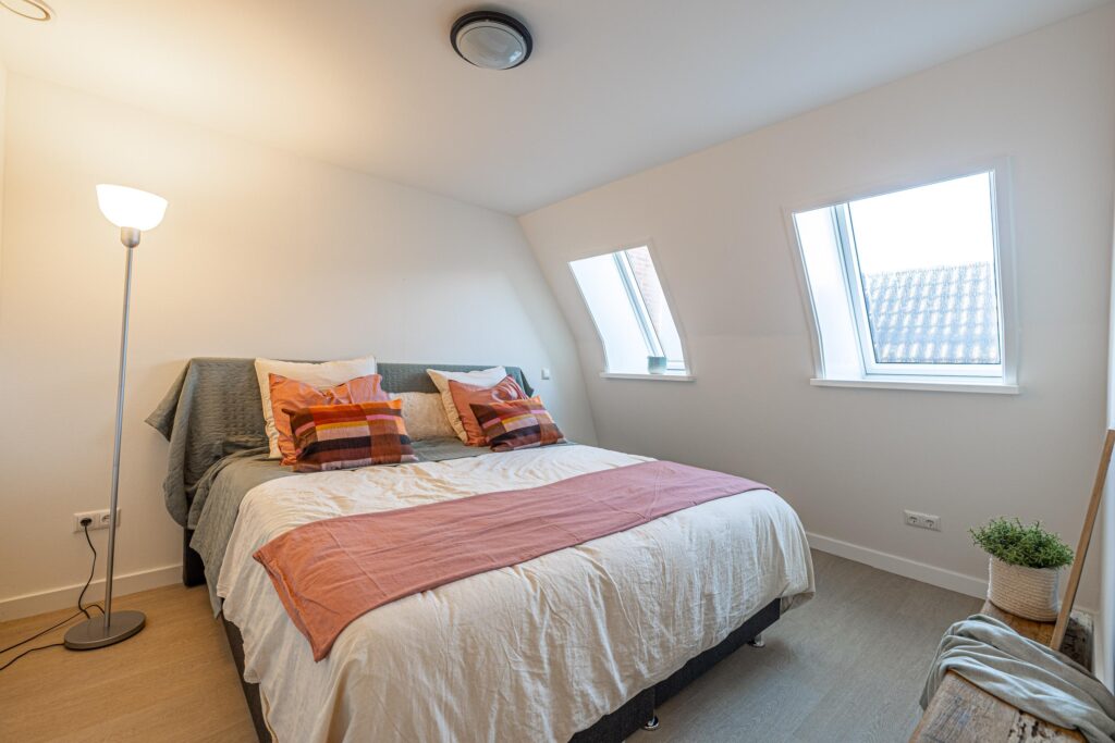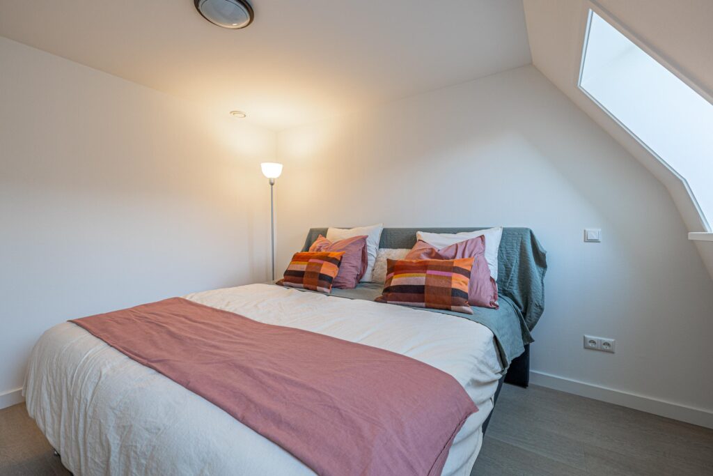 Via de zijkant van het pand is de bovenwoning bereikbaar. Op de begane grond heb je een eigen en separate ingang met eigen stroom- en watermeter. Op de verdieping heeft de woning een kleine hal/overloop met toegang tot de royale woonkamer. Door de vele dakramen en het royale dakkapel heb je hier veel lichtinval. De woonkamer is tevens ruim genoeg om eenvoudig een wand te plaatsen, waardoor een extra (slaap)kamer kan worden gerealiseerd. Vanuit de woonkamer met eethoek stap je door naar de moderne keuken, die in 2025 is geplaatst en is uitgerust met diverse inbouwapparatuur. Tevens bevindt zich hier een aansluiting voor de wasmachine. Het appartement beschikt verder over één ruime slaapkamer en een fraaie, luxe badkamer met toilet, wastafel en inloopdouche. De technische ruimte bevind zich te midden van het appartement. Hier zijn de binnenunit van de lucht-water warmtepomp (Bosch) met een 50 liter buffervat, evenals de omvormer en de WTW-unit gesitueerd. Op het platte dak bevinden zich de zonnepanelen en de buitenunit van de warmtepomp.