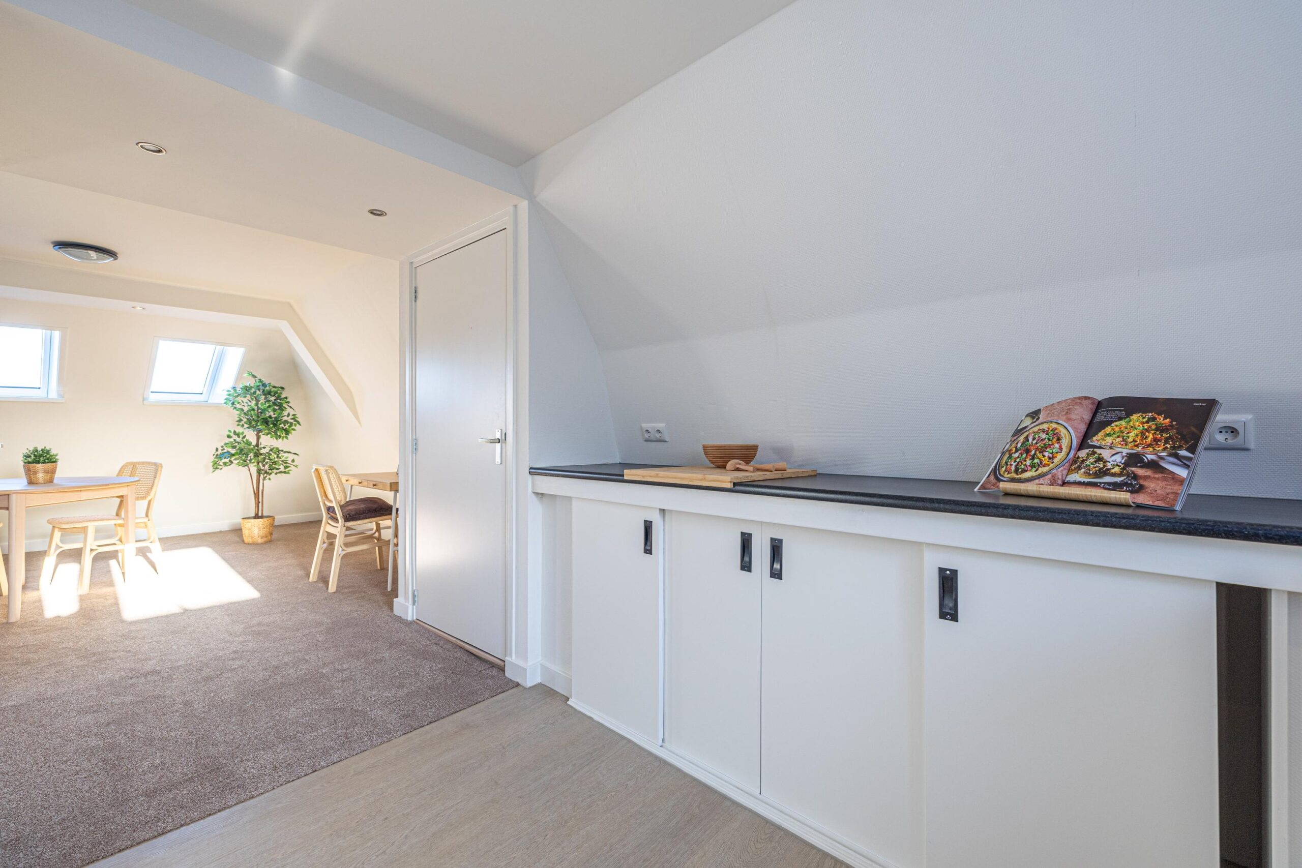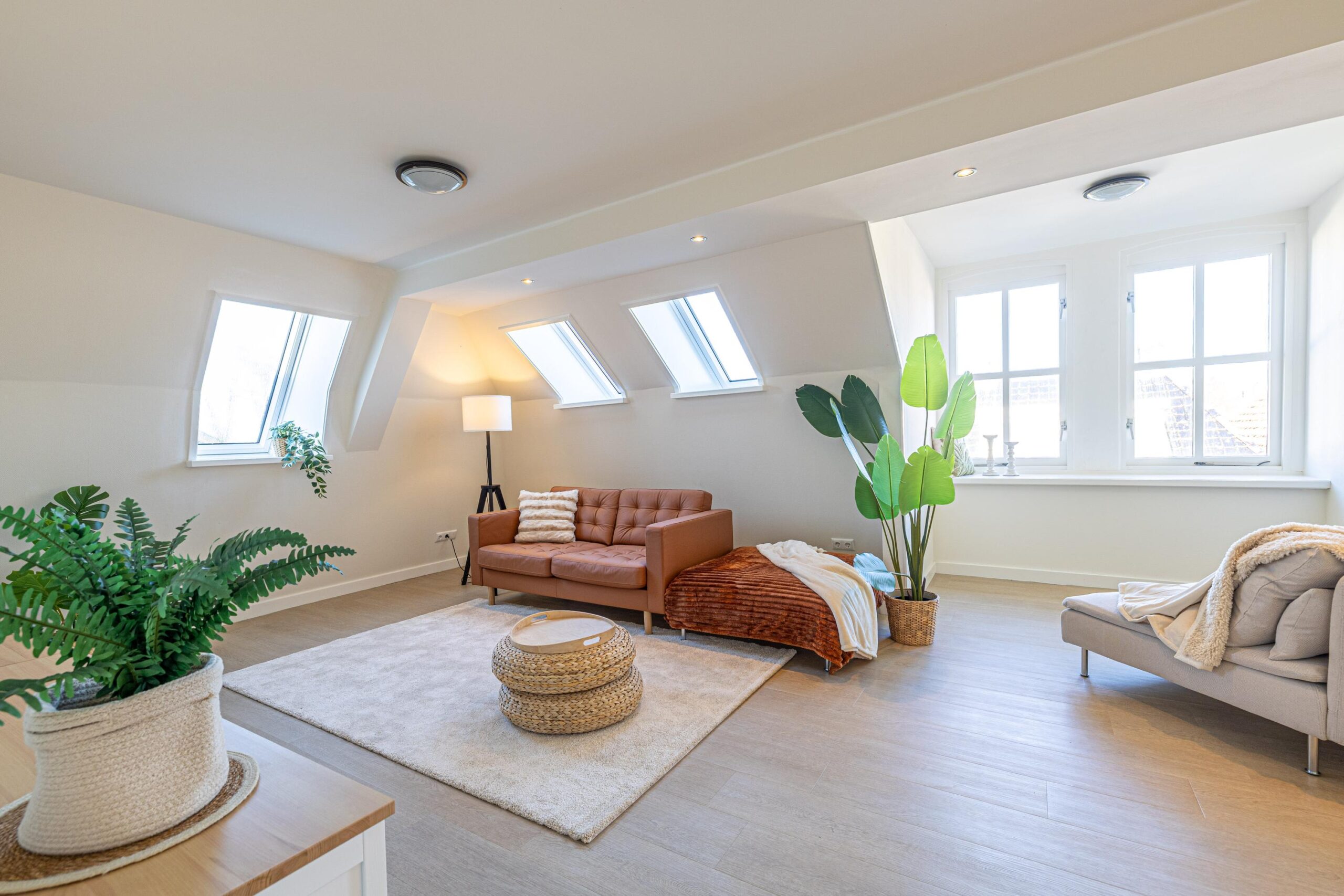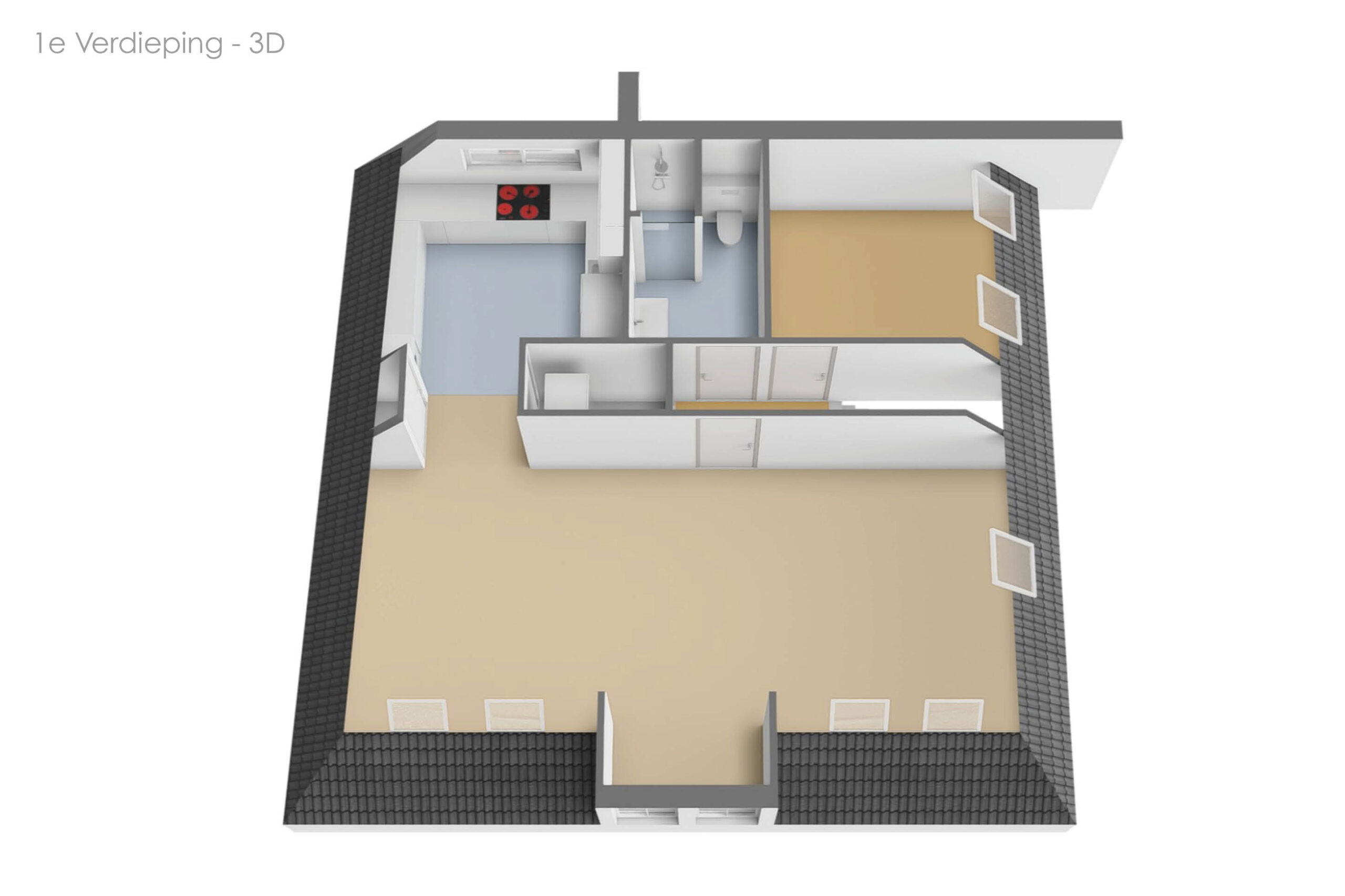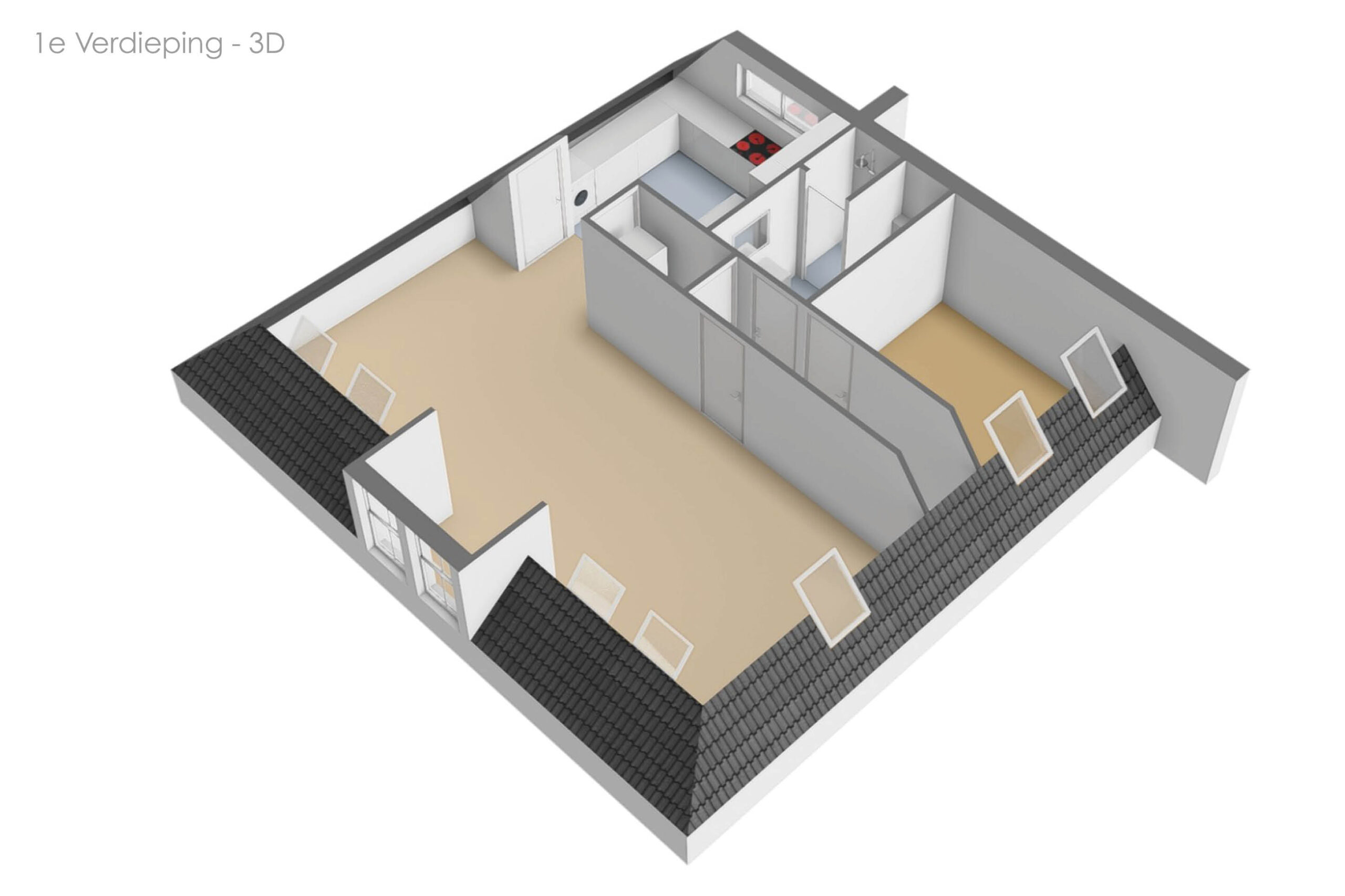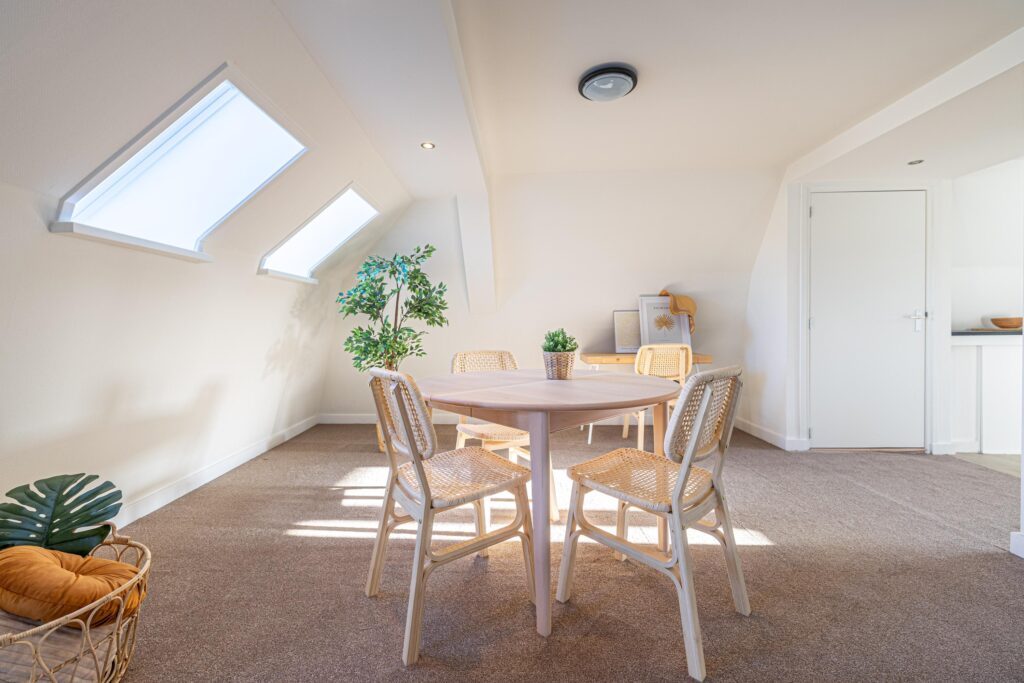 Via de zijkant van het pand is de bovenwoning bereikbaar. Op de begane grond heb je een eigen en separate ingang met eigen stroom- en watermeter. Op de verdieping heeft de woning een kleine hal/overloop met toegang tot de royale woonkamer. Door de vele dakramen en het royale dakkapel heb je hier veel lichtinval. De woonkamer is tevens ruim genoeg om eenvoudig een wand te plaatsen, waardoor een extra (slaap)kamer kan worden gerealiseerd. Vanuit de woonkamer met eethoek stap je door naar de moderne keuken, die in 2025 is geplaatst en is uitgerust met diverse inbouwapparatuur. Tevens bevindt zich hier een aansluiting voor de wasmachine. Het appartement beschikt verder over één ruime slaapkamer en een fraaie, luxe badkamer met toilet, wastafel en inloopdouche. De technische ruimte bevind zich te midden van het appartement. Hier zijn de binnenunit van de lucht-water warmtepomp (Bosch) met een 50 liter buffervat, evenals de omvormer en de WTW-unit gesitueerd. Op het platte dak bevinden zich de zonnepanelen en de buitenunit van de warmtepomp.