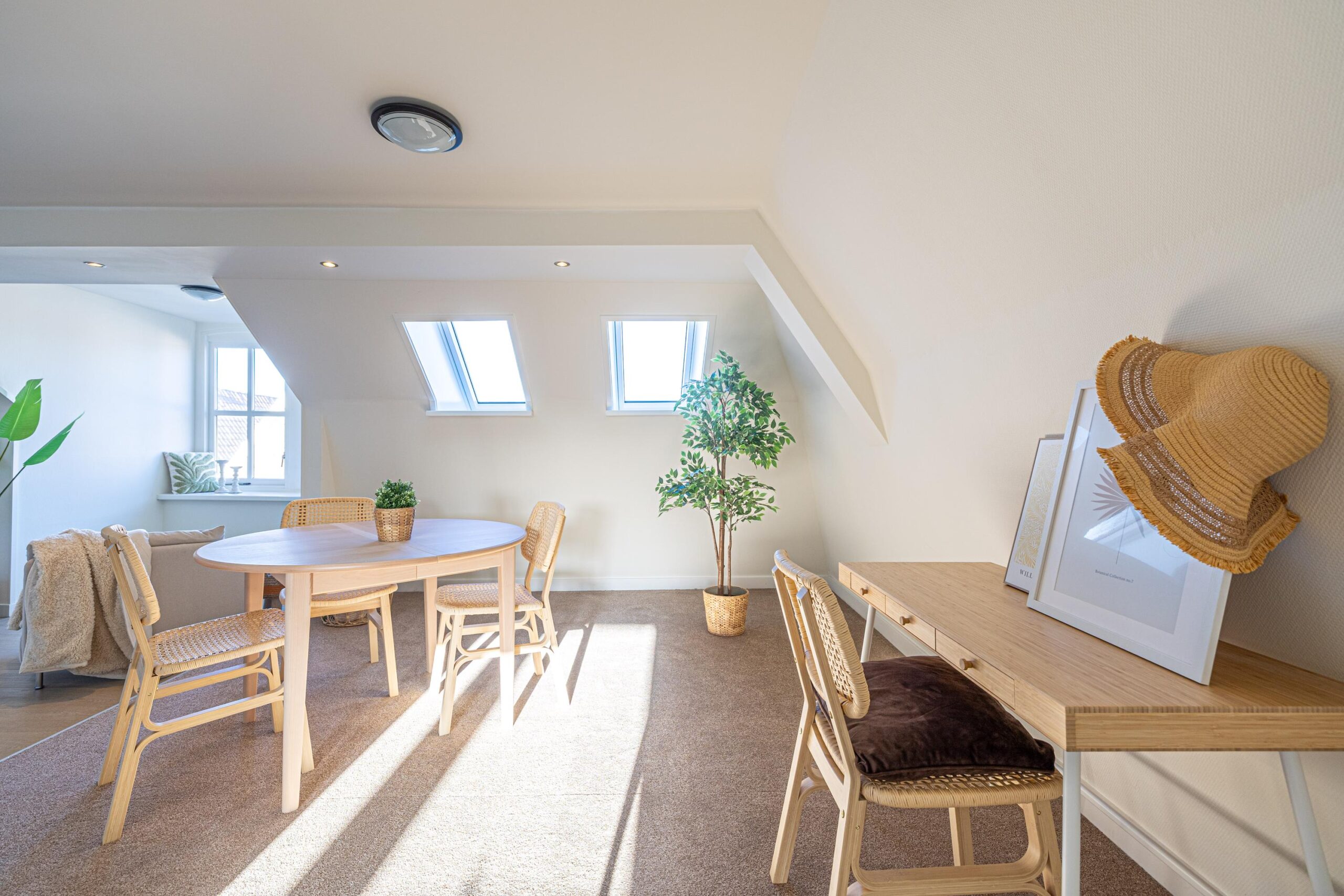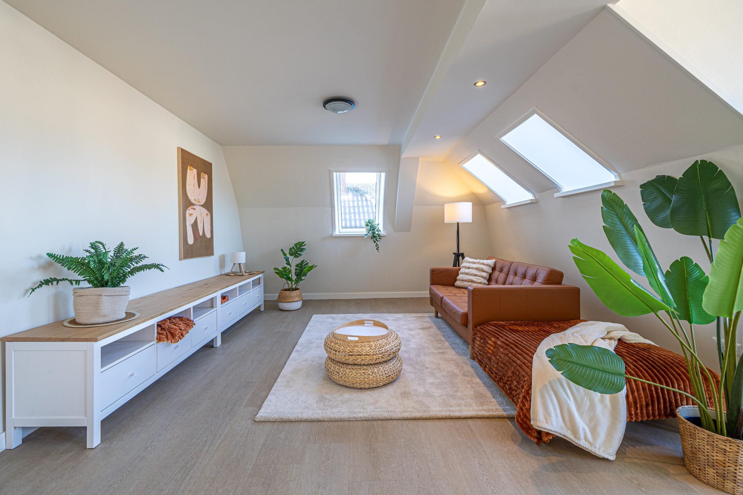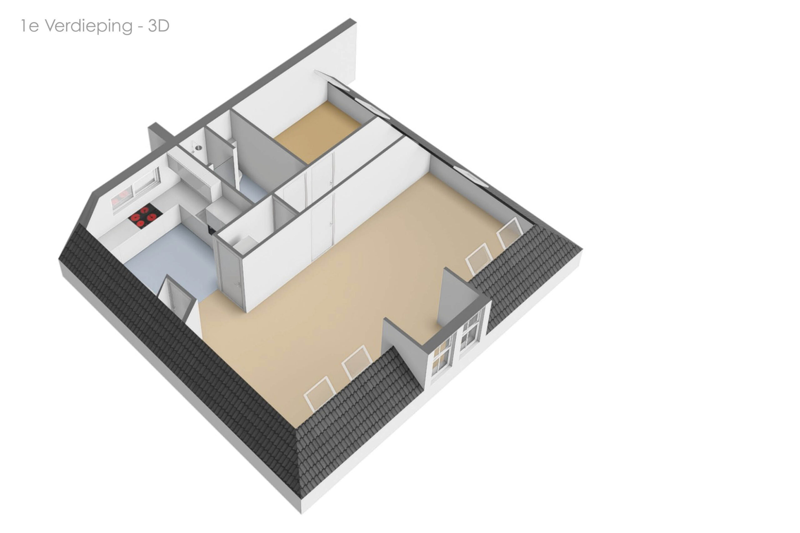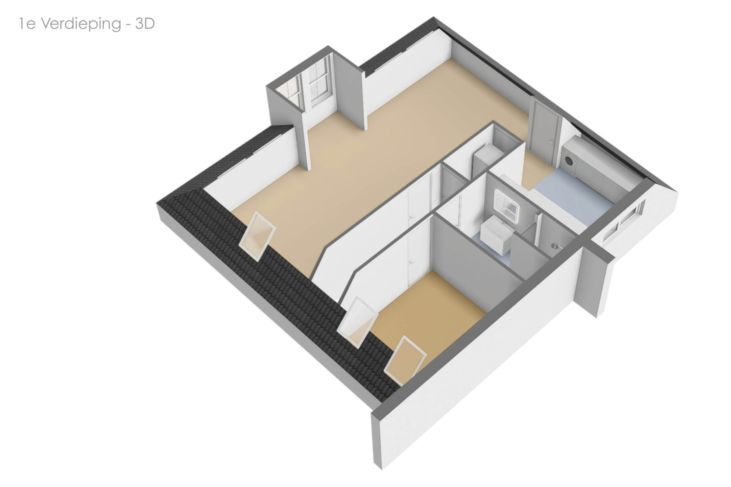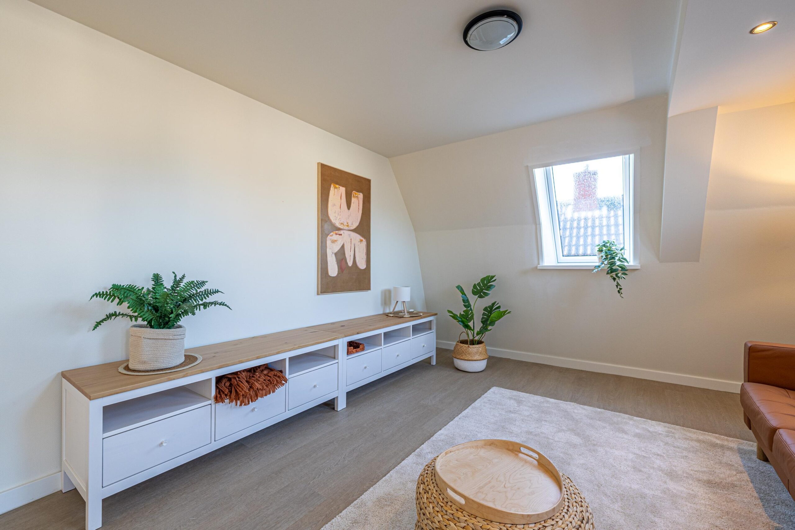 Via de zijkant van het pand is de bovenwoning bereikbaar. Op de begane grond heb je een eigen en separate ingang met eigen stroom- en watermeter. Op de verdieping heeft de woning een kleine hal/overloop met toegang tot de royale woonkamer. Door de vele dakramen en het royale dakkapel heb je hier veel lichtinval. De woonkamer is tevens ruim genoeg om eenvoudig een wand te plaatsen, waardoor een extra (slaap)kamer kan worden gerealiseerd. Vanuit de woonkamer met eethoek stap je door naar de moderne keuken, die in 2025 is geplaatst en is uitgerust met diverse inbouwapparatuur. Tevens bevindt zich hier een aansluiting voor de wasmachine. Het appartement beschikt verder over één ruime slaapkamer en een fraaie, luxe badkamer met toilet, wastafel en inloopdouche. De technische ruimte bevind zich te midden van het appartement. Hier zijn de binnenunit van de lucht-water warmtepomp (Bosch) met een 50 liter buffervat, evenals de omvormer en de WTW-unit gesitueerd. Op het platte dak bevinden zich de zonnepanelen en de buitenunit van de warmtepomp.