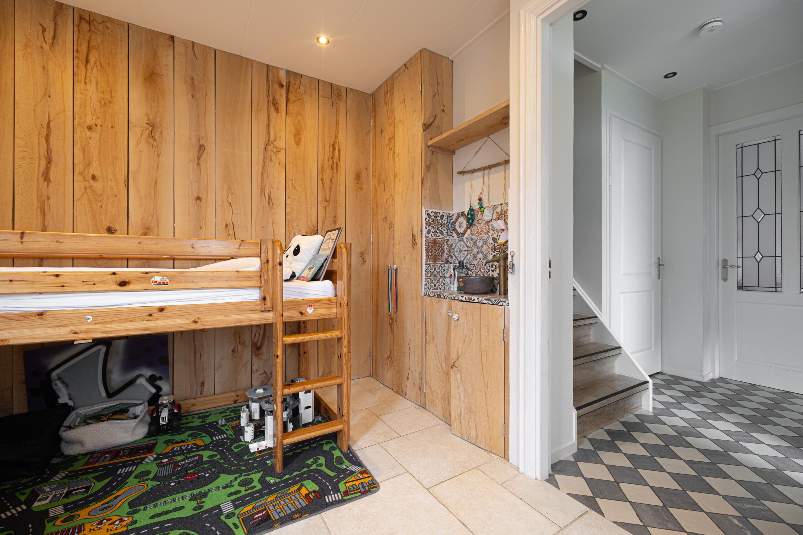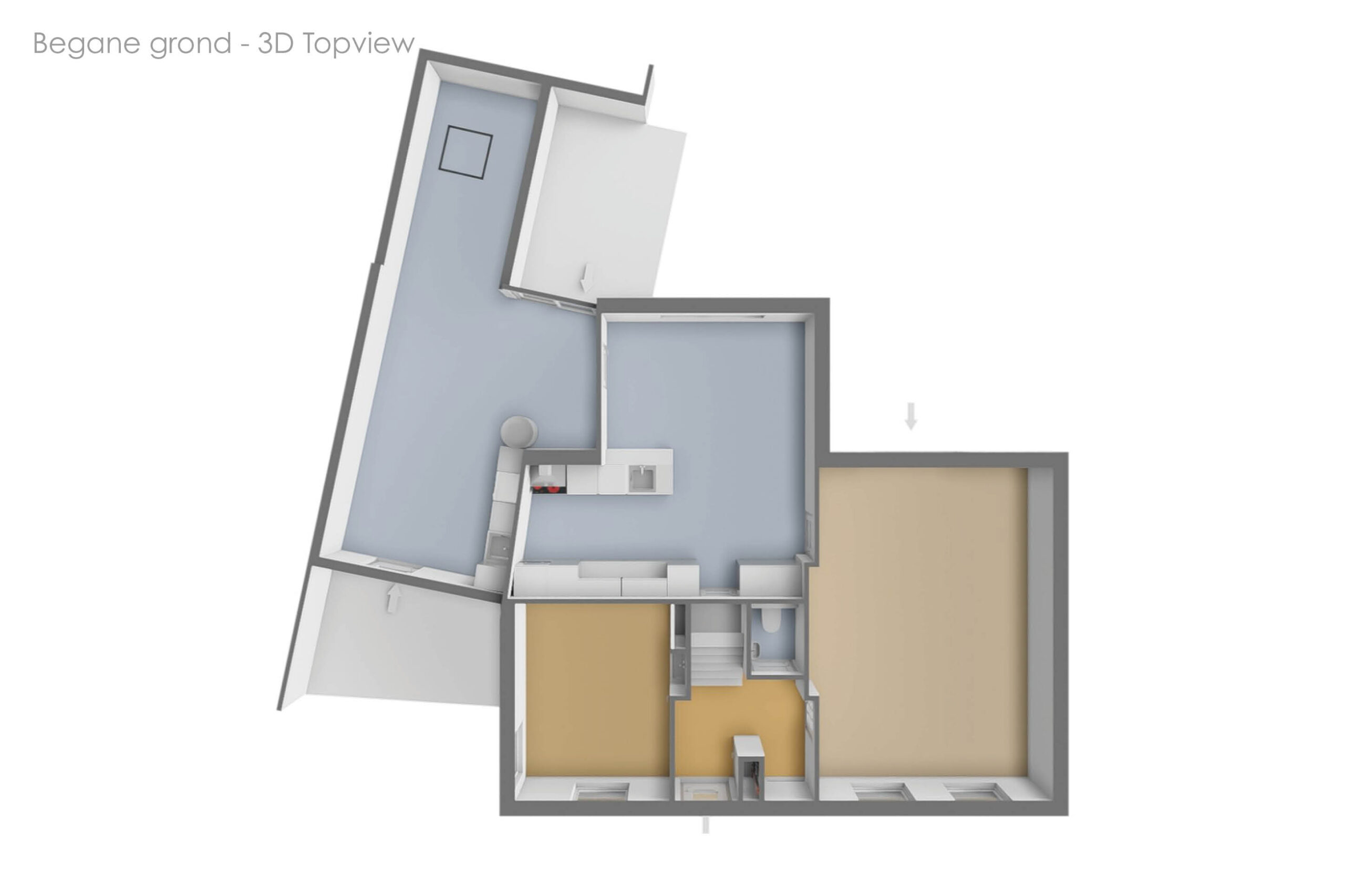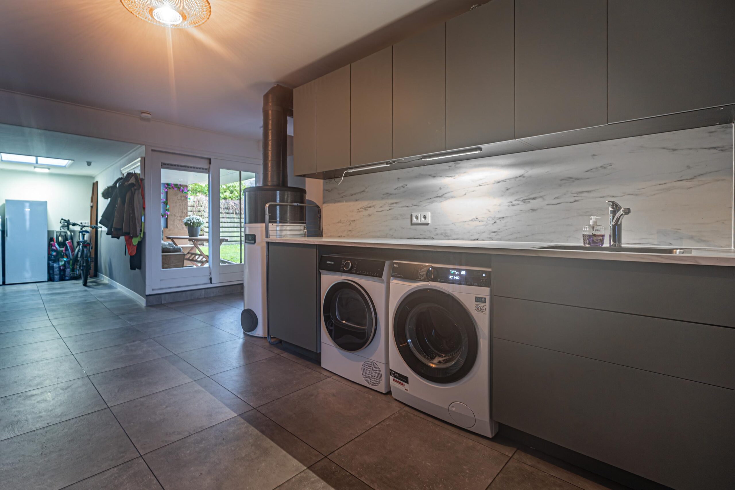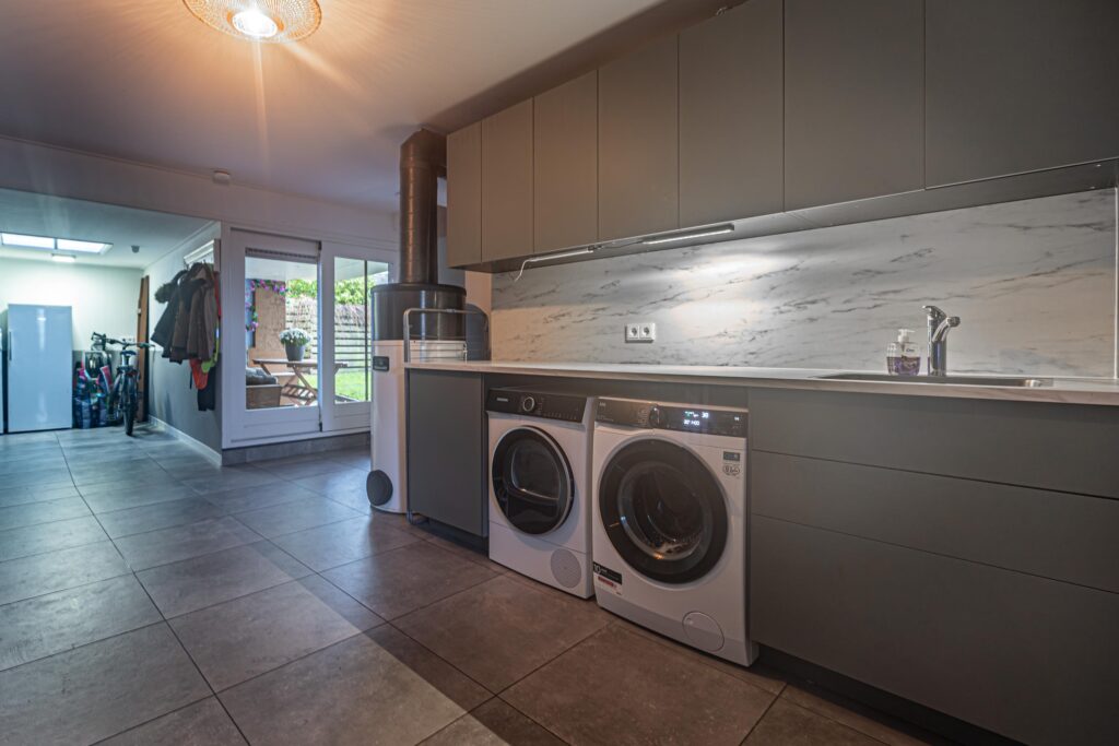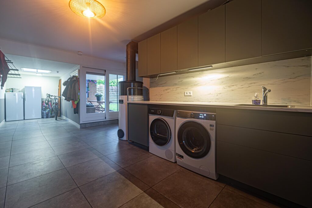 Via de hal bereik je de woonkamer, de fijne slaap-/werkkamer met wastafel en het toilet. De ruime en lichte woonkamer is voorzien van openslaande deuren naar de achtertuin. Vanuit de woonkamer bereik je de luxe woonkeuken met inbouwapparatuur en een kookeiland. Aangrenzend bevindt zich de royale bijkeuken, voorzien van een keukenblok met kastjes en aansluitingen voor witgoed. Daarnaast biedt deze ruimte plaats voor opslag van spullen en fietsen. Via de schuifpui heb je directe toegang tot de zonnige achtertuin. De begane grond is volledig voorzien van vloerverwarming, met uitzondering van het aangebouwde gedeelte bij de bijkeuken.