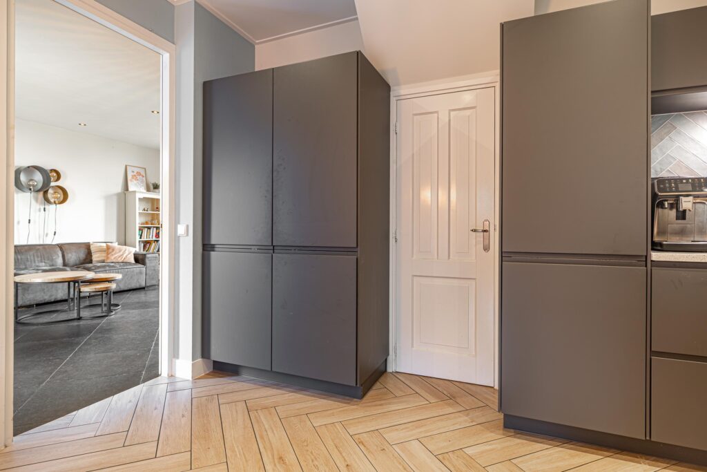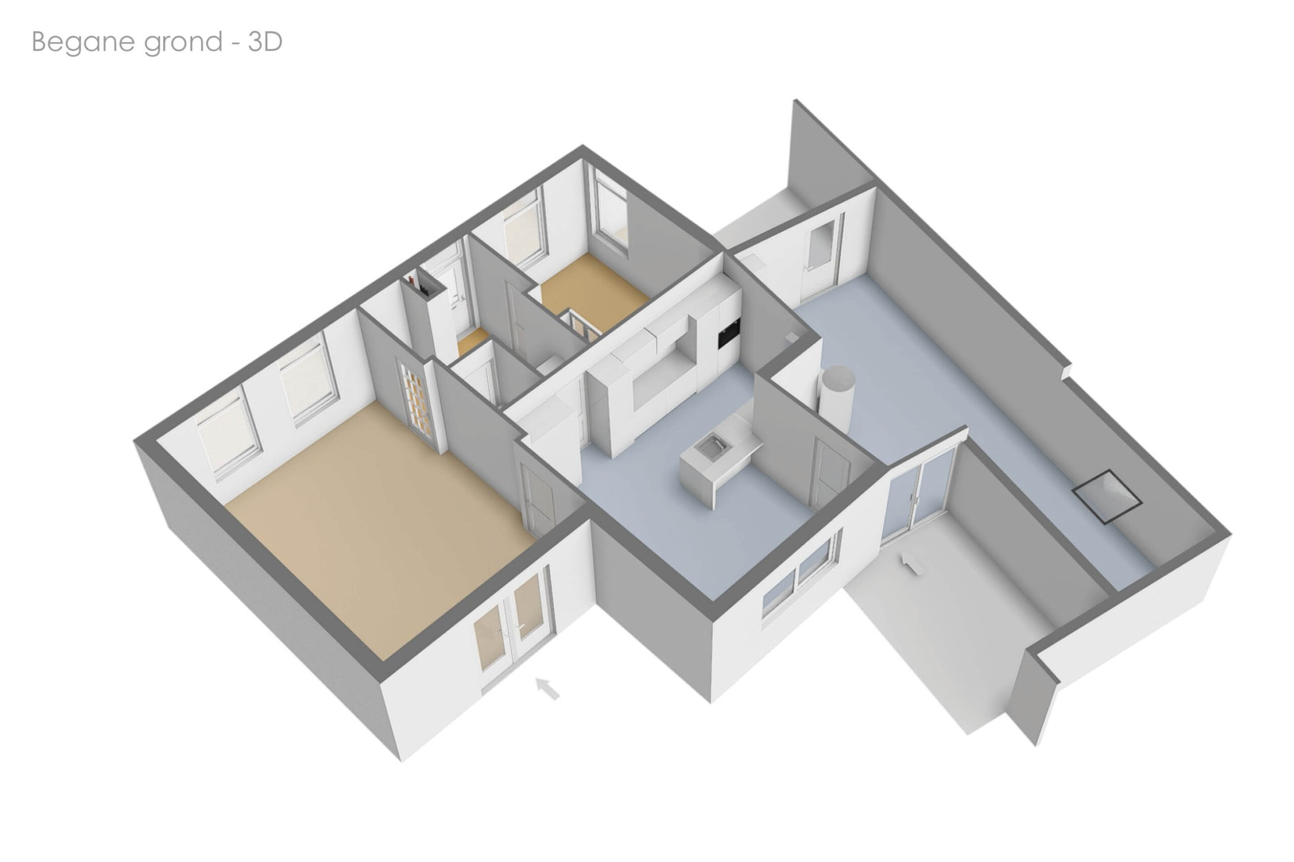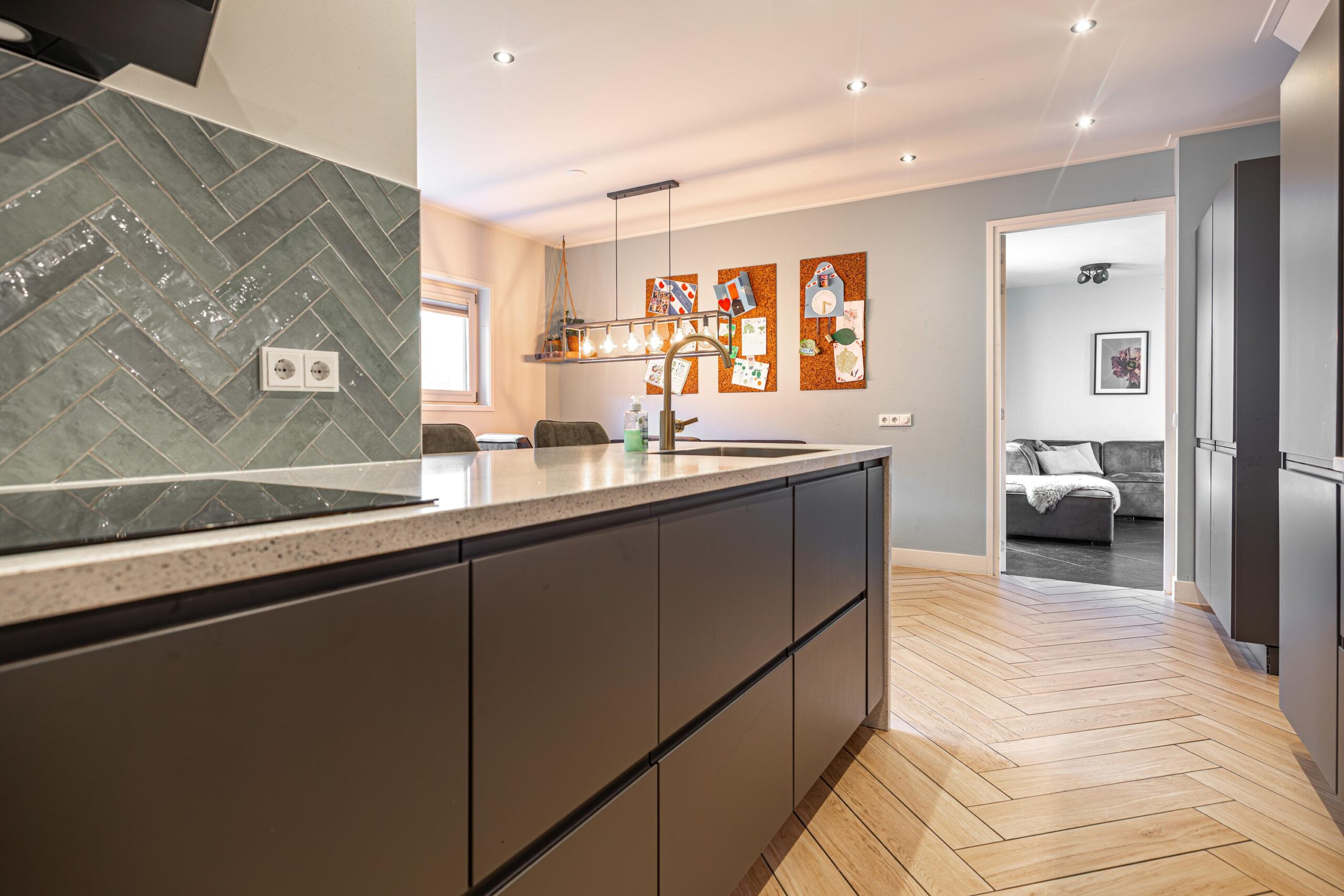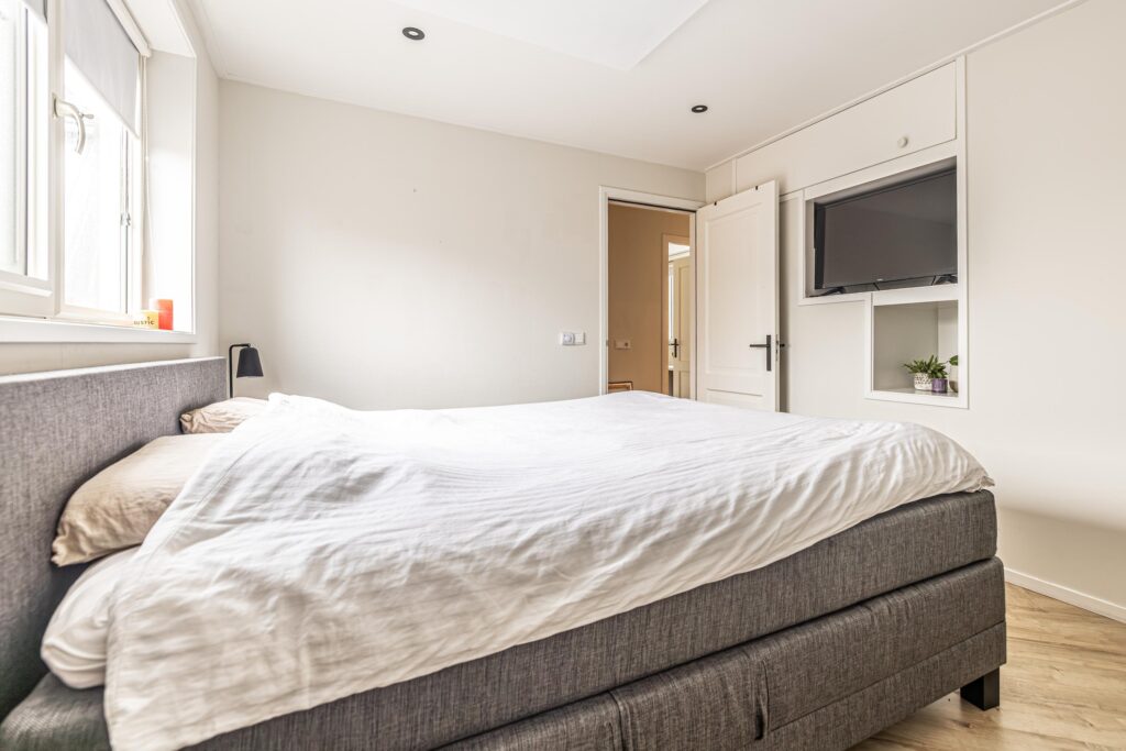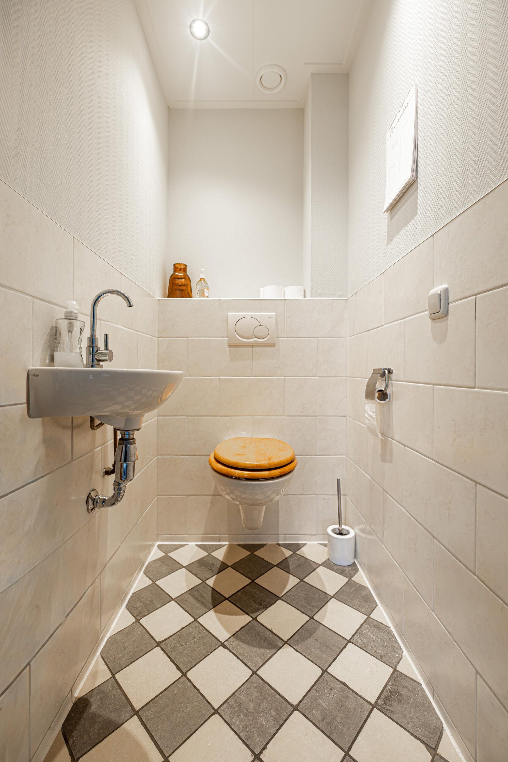 Via de hal bereik je de woonkamer, de fijne slaap-/werkkamer met wastafel en het toilet. De ruime en lichte woonkamer is voorzien van openslaande deuren naar de achtertuin. Vanuit de woonkamer bereik je de luxe woonkeuken met inbouwapparatuur en een kookeiland. Aangrenzend bevindt zich de royale bijkeuken, voorzien van een keukenblok met kastjes en aansluitingen voor witgoed. Daarnaast biedt deze ruimte plaats voor opslag van spullen en fietsen. Via de schuifpui heb je directe toegang tot de zonnige achtertuin. De begane grond is volledig voorzien van vloerverwarming, met uitzondering van het aangebouwde gedeelte bij de bijkeuken.