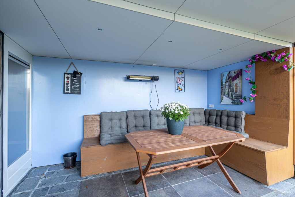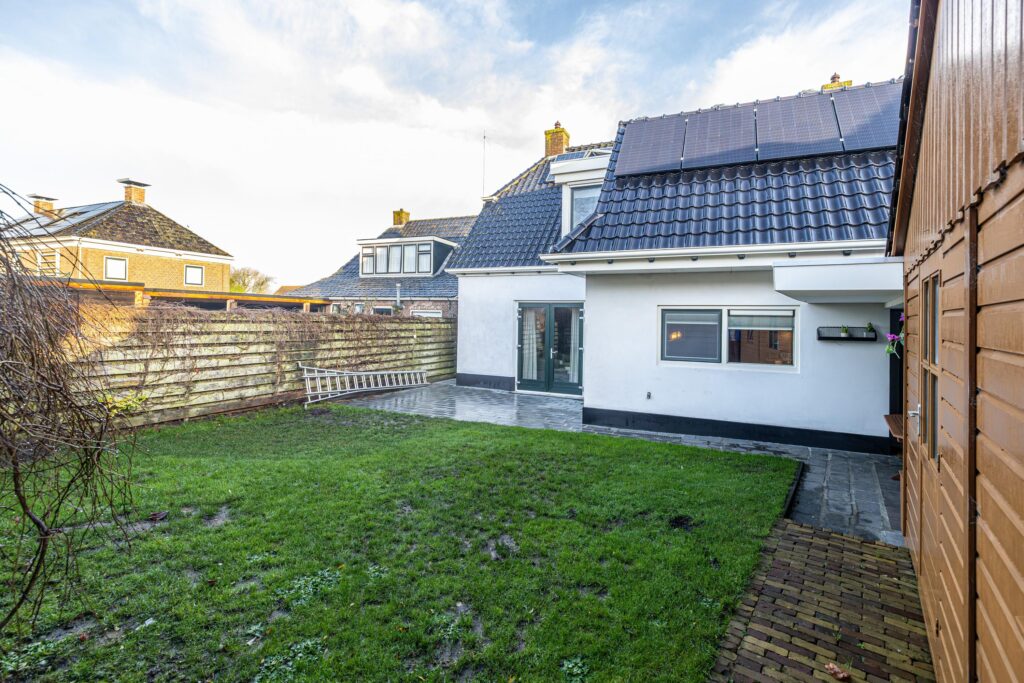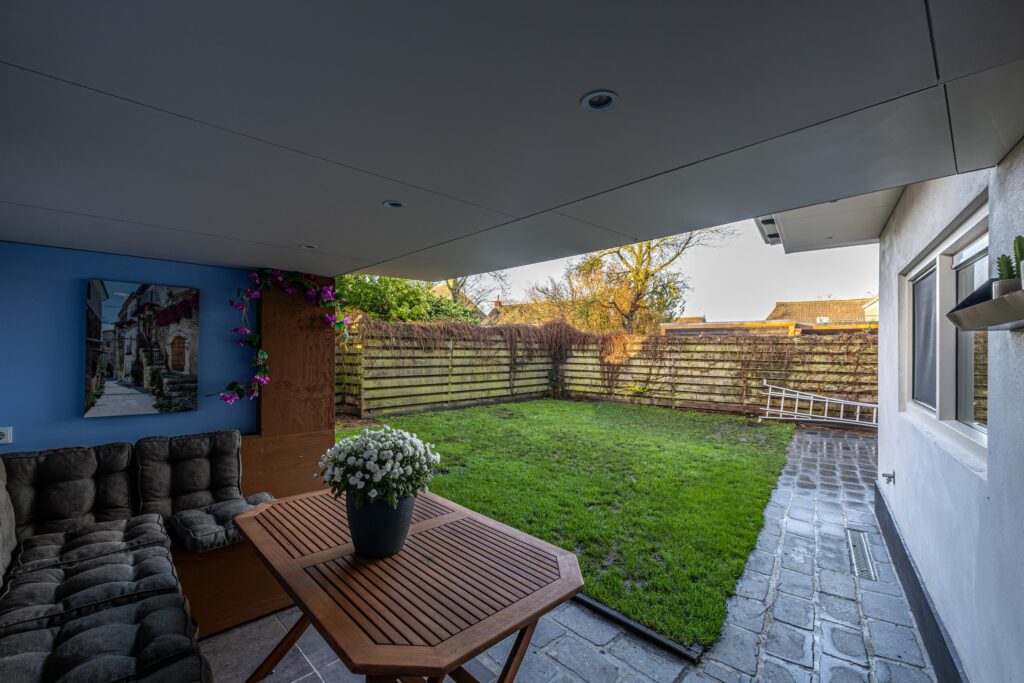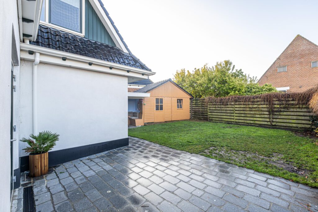 De achtertuin, gelegen op het zuidwesten, beschikt over een overkapping en een aangebouwde houten berging. De tuin is rondom verzorgd aangelegd.