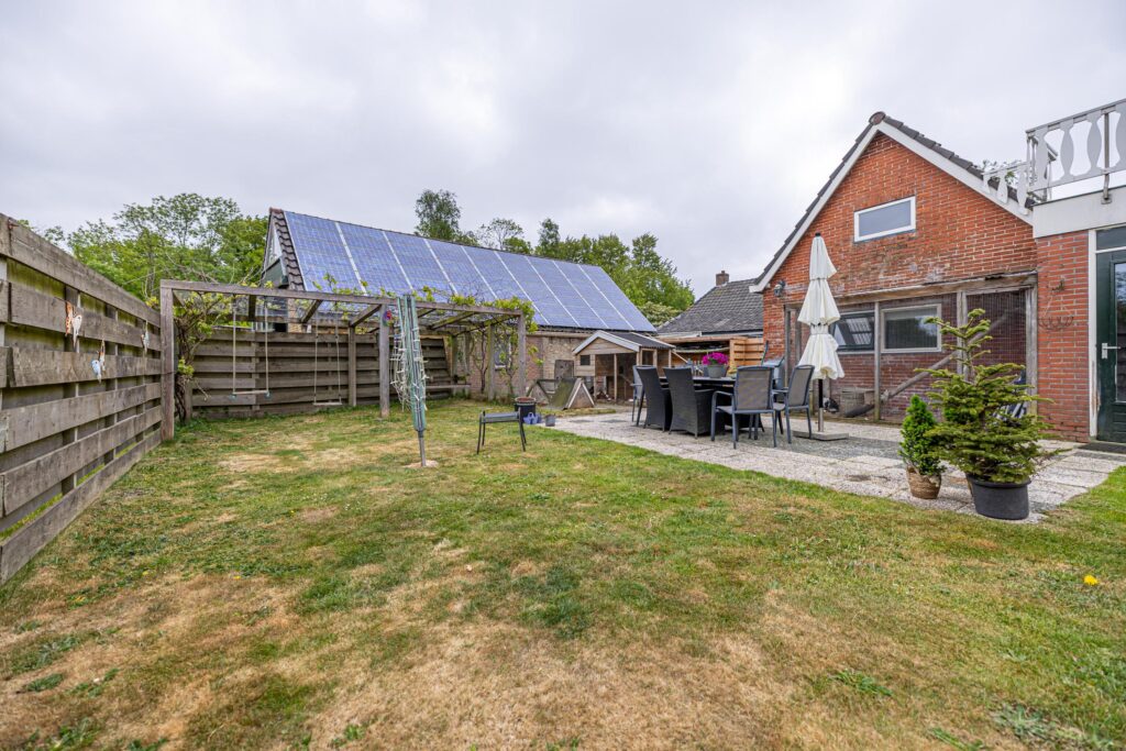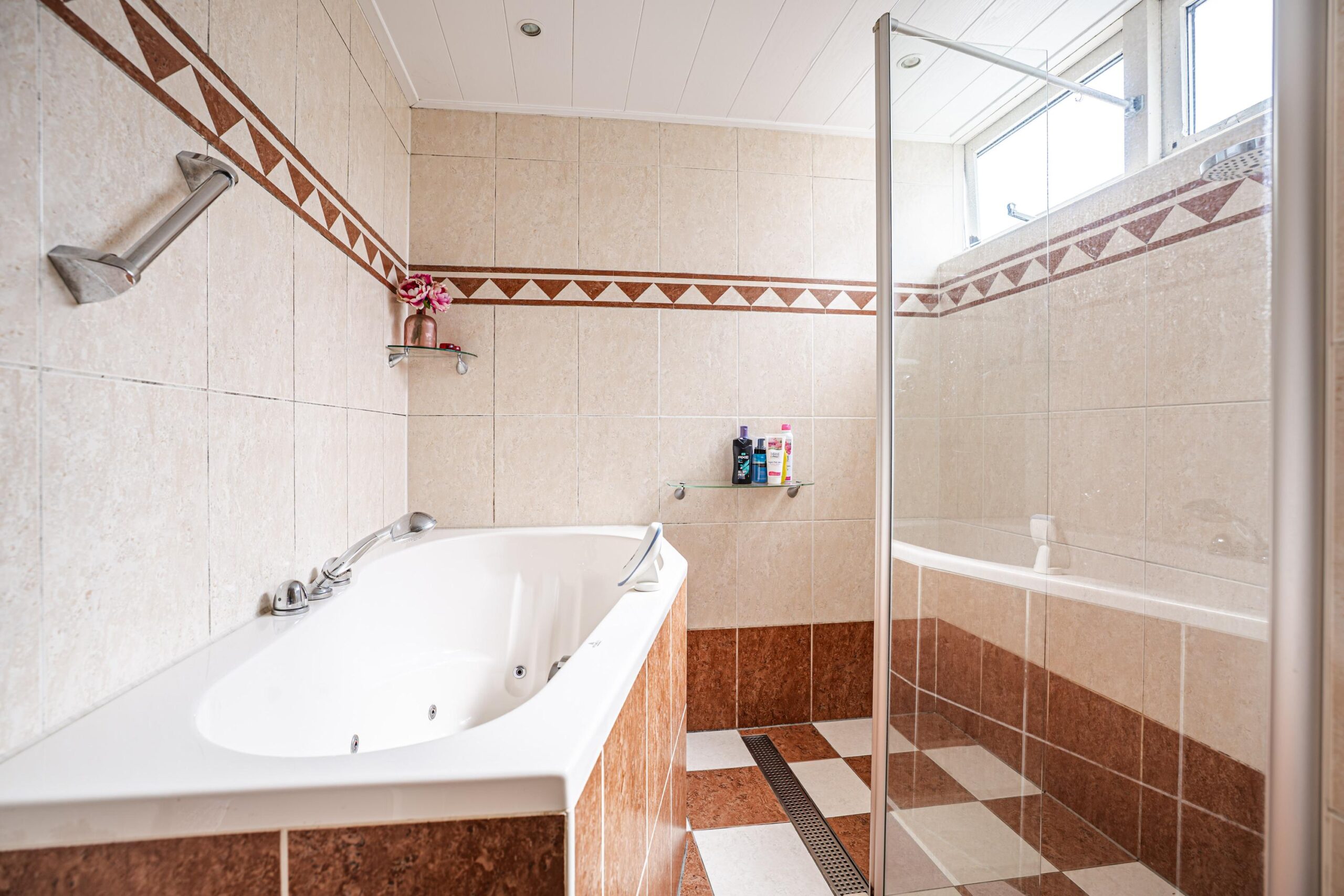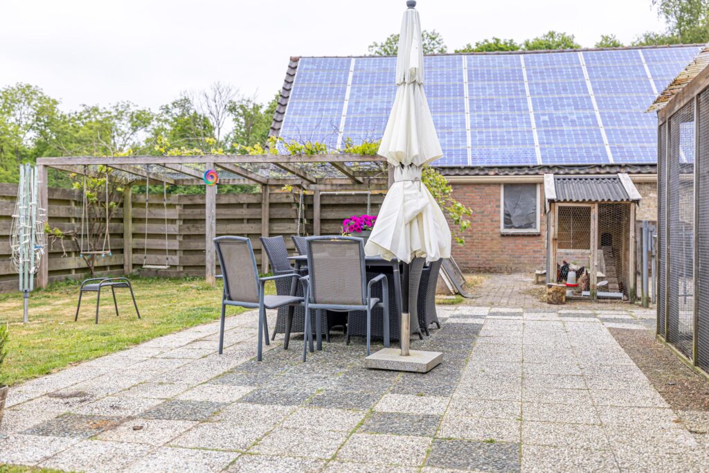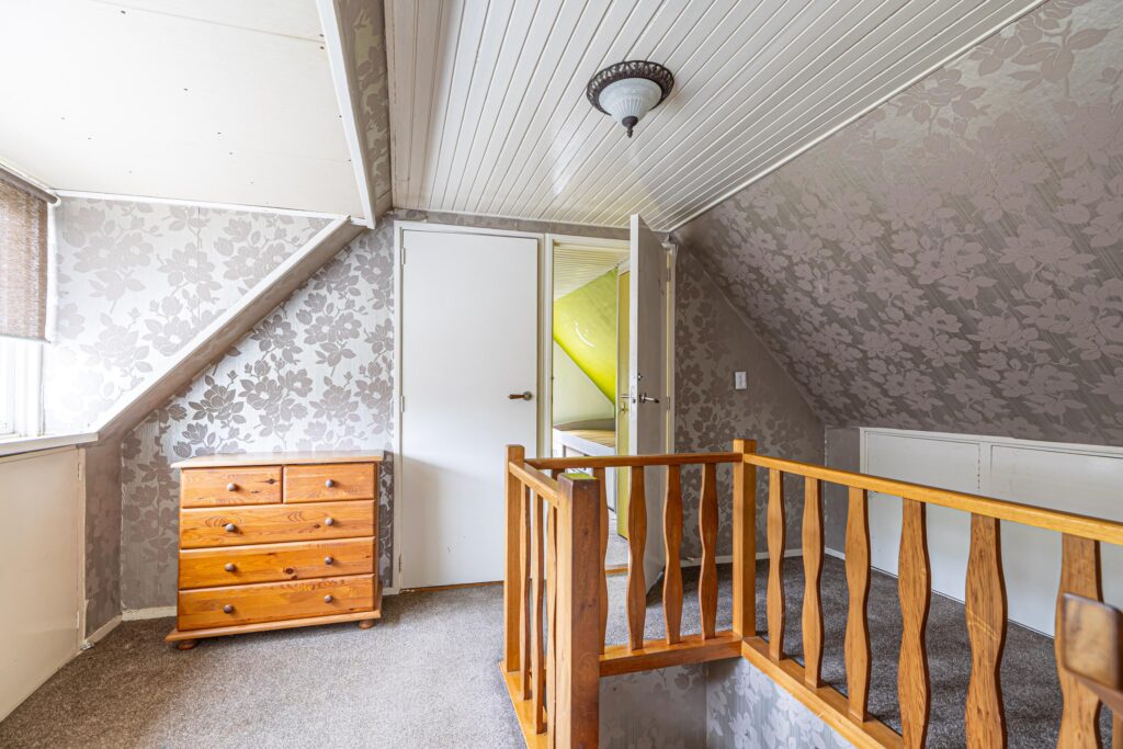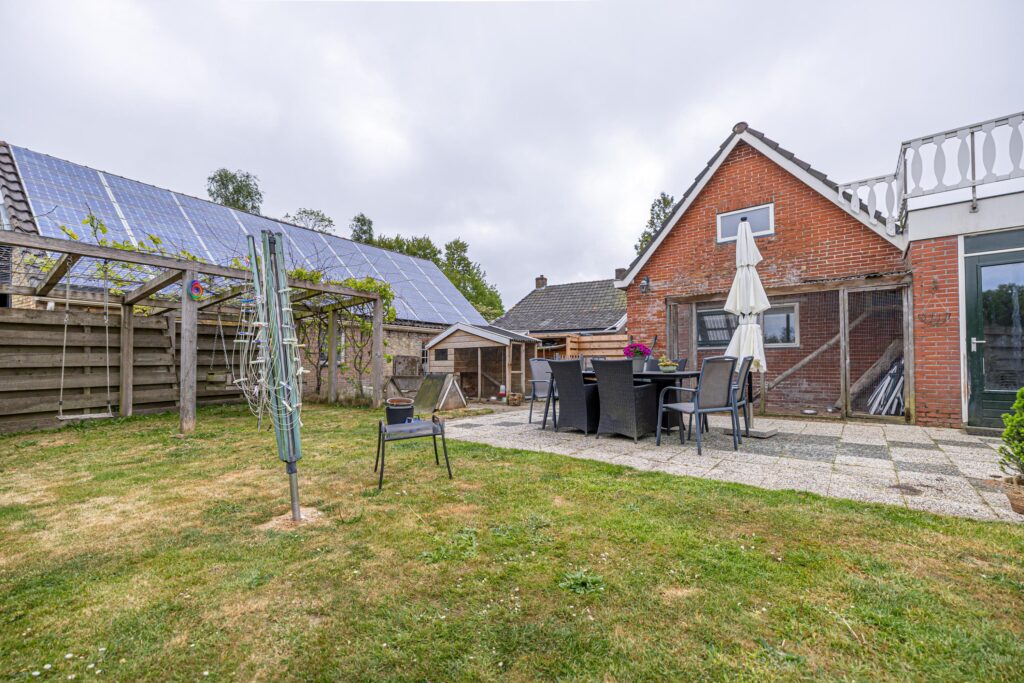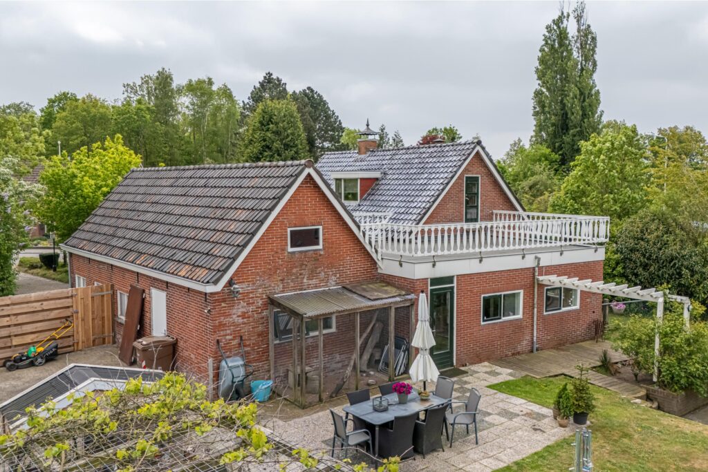 Op de eerste verdieping vind je een overloop met dakkapel en drie slaapkamers. Eén van deze slaapkamers is voorzien van een wastafelmeubel en heeft toegang tot een dakterras. Het geheel beschikt over een ruime tuin met vijver en diverse zithoeken. De oprit biedt bovendien voldoende parkeergelegenheid op eigen terrein.