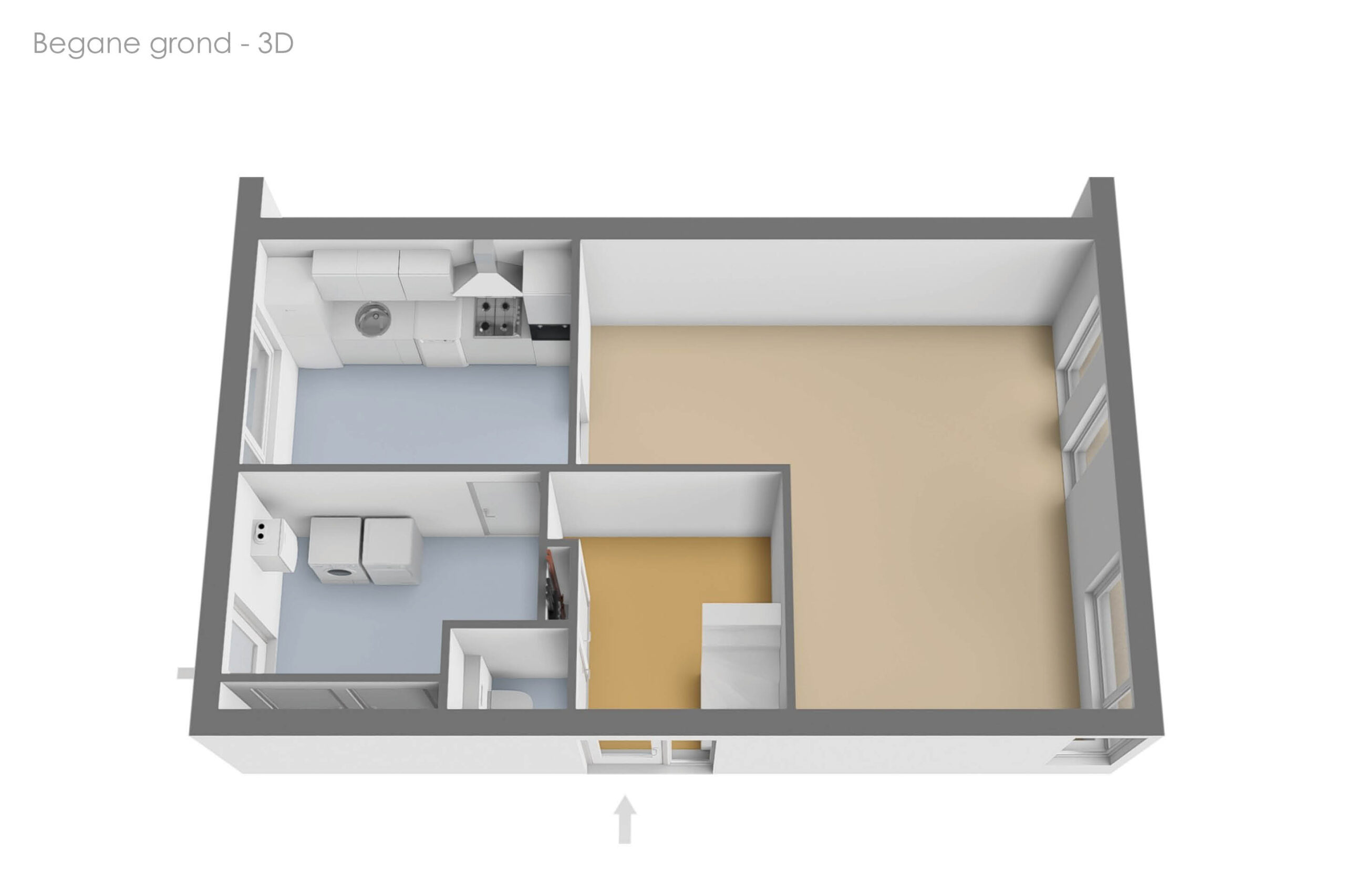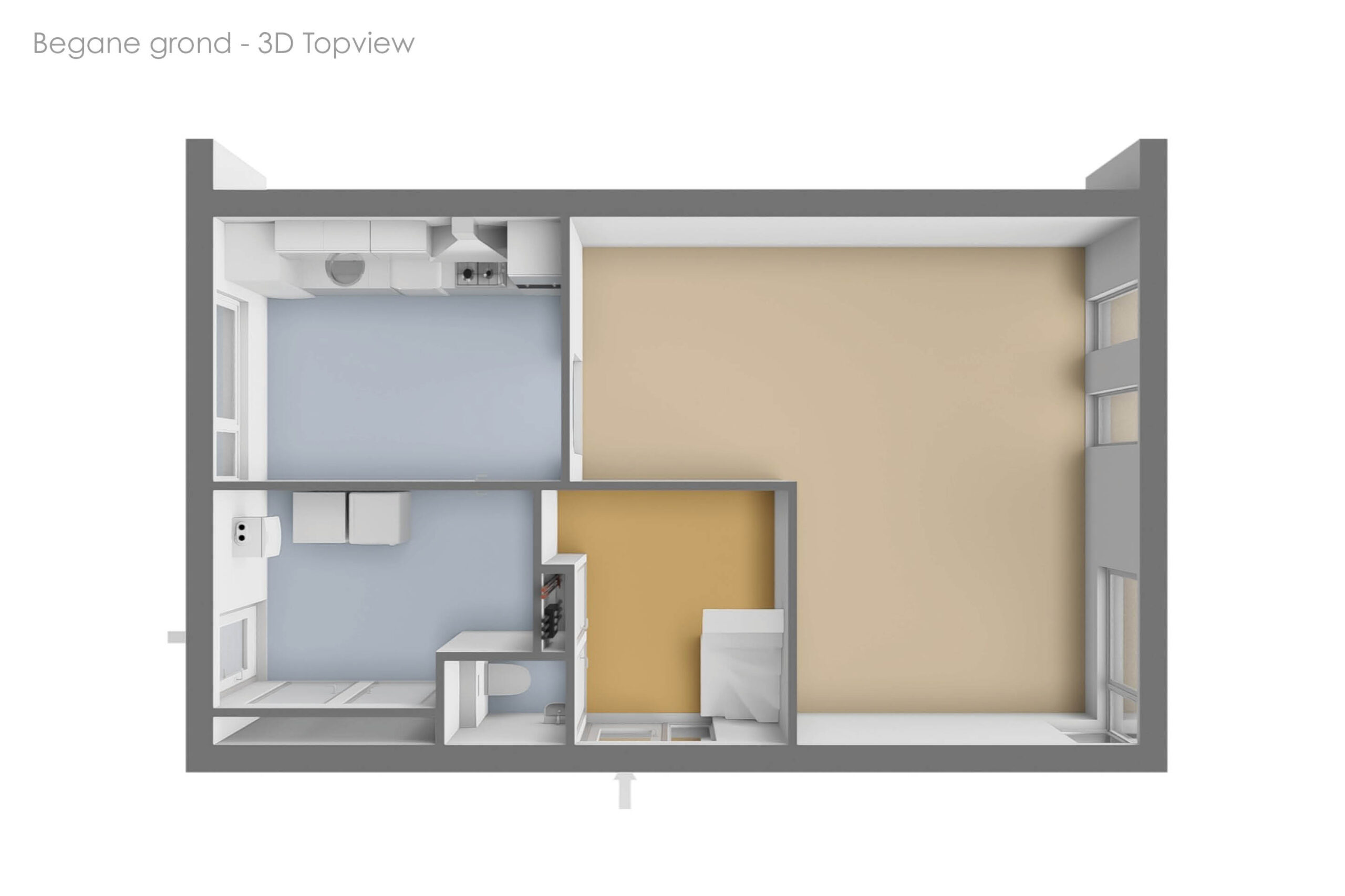 Begane grond: je komt binnen in een hal die toegang biedt tot het toilet en de woonkamer. De lichte woonkamer is ruim opgezet en voorzien van airconditioning. Aan de achterzijde bevindt zich de halfopen keuken, die in verbinding staat met de bijkeuken. Vanuit de bijkeuken heb je direct toegang tot de tuin.