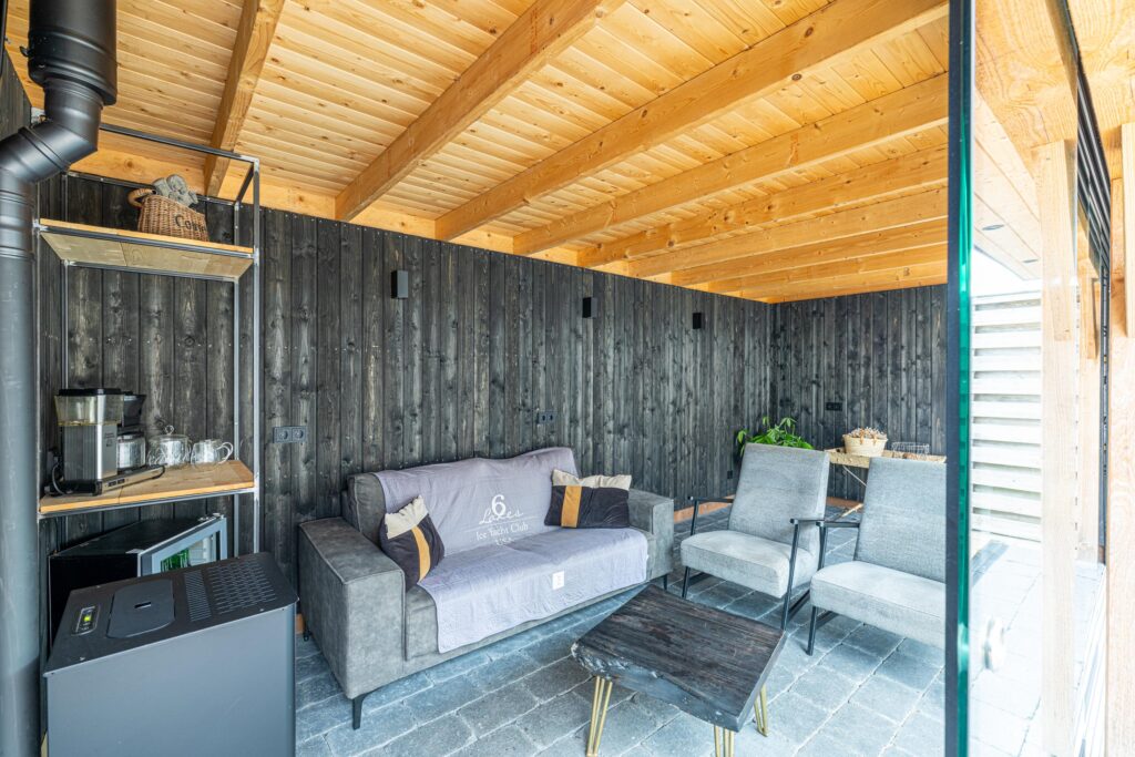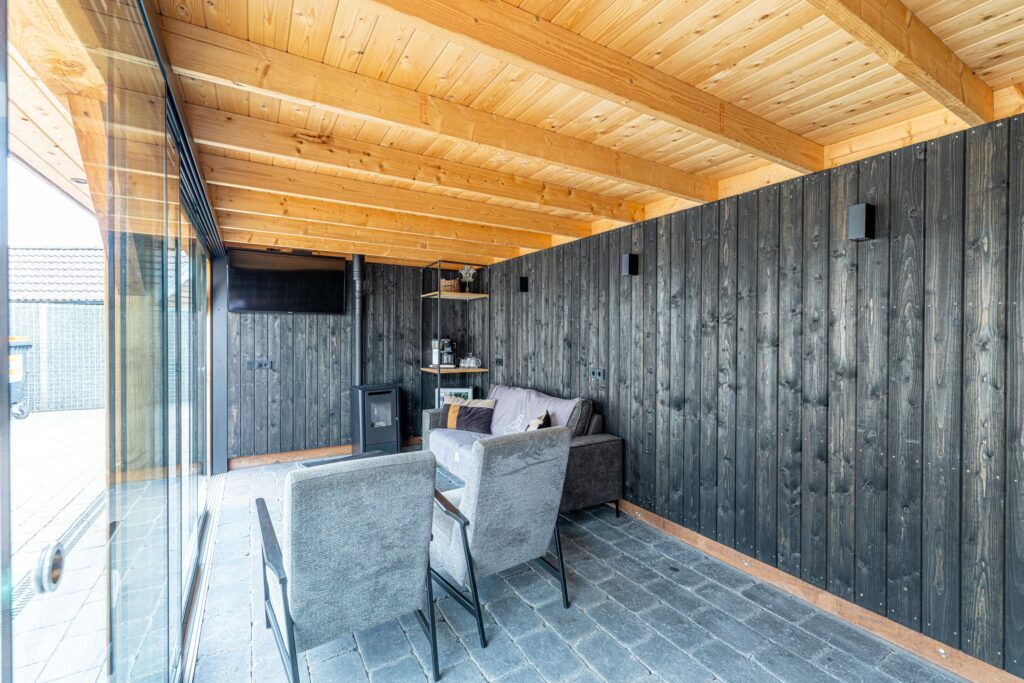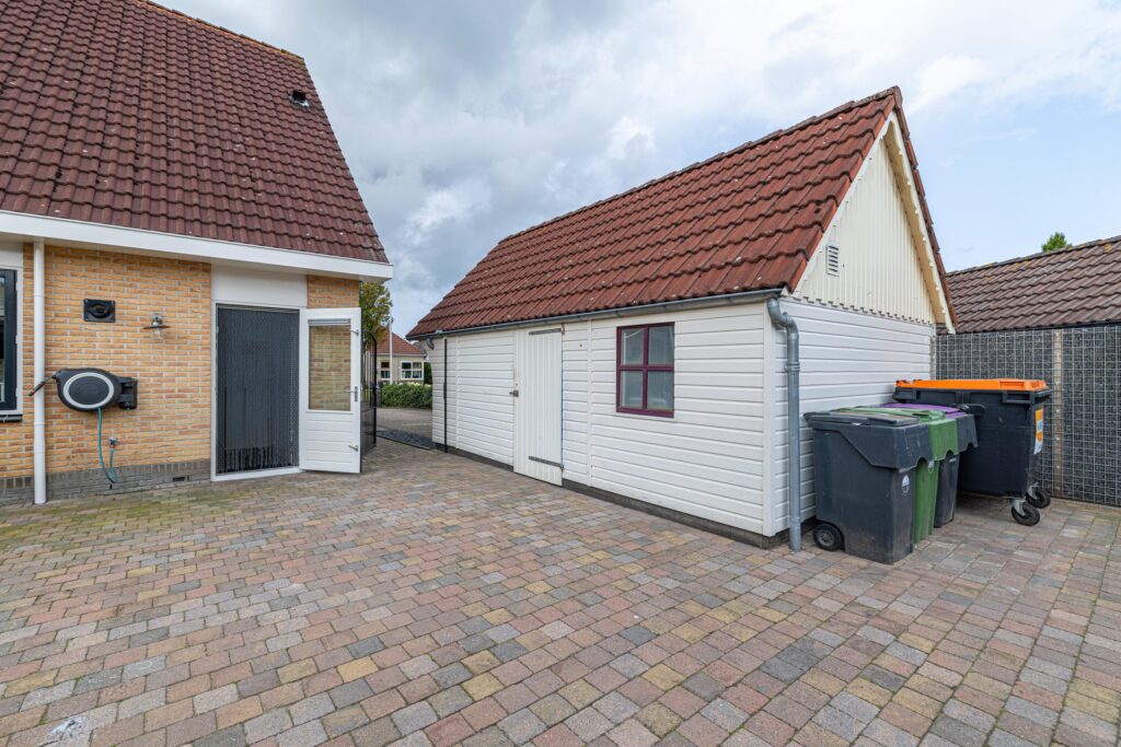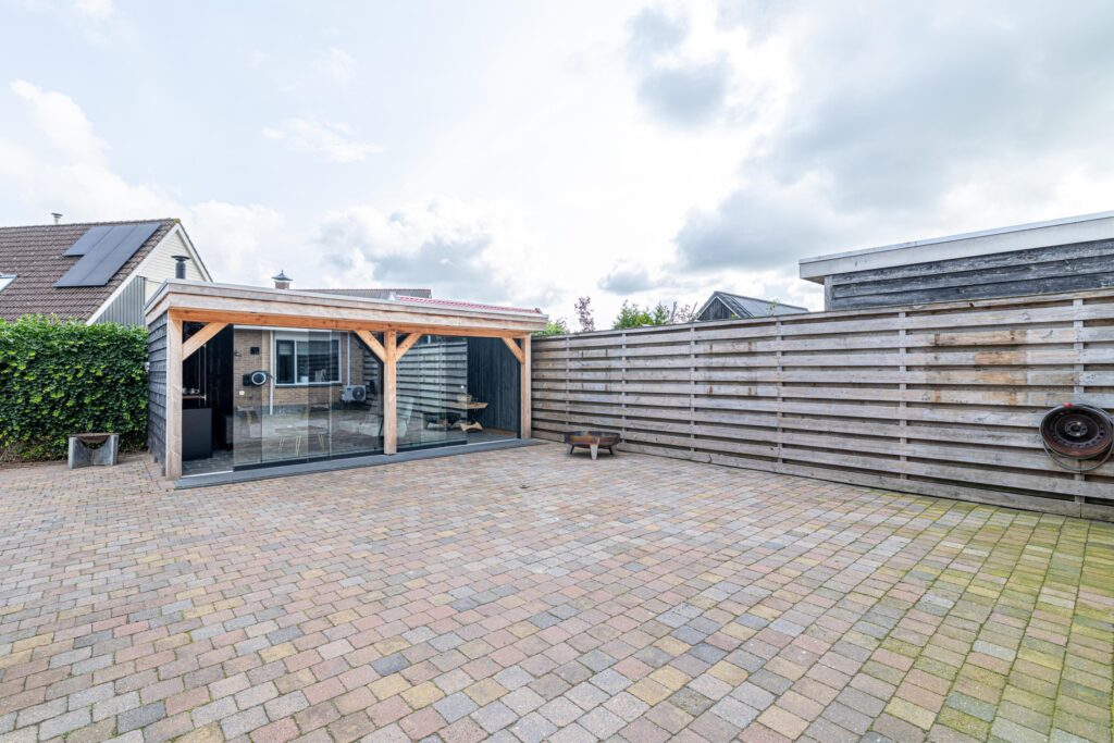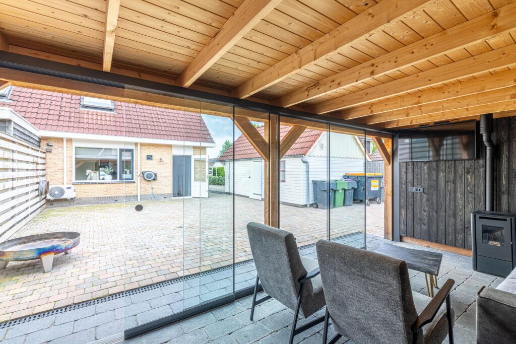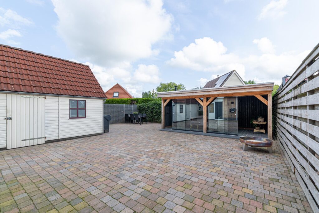 Daarnaast heeft de woning nog een vrijstaande houten garage die ruimte biedt voor fietsen, gereedschap of hobby’s en een achtertuin met een overkapping. Deze overkapping heeft een glazen pui en een pelletkachel.