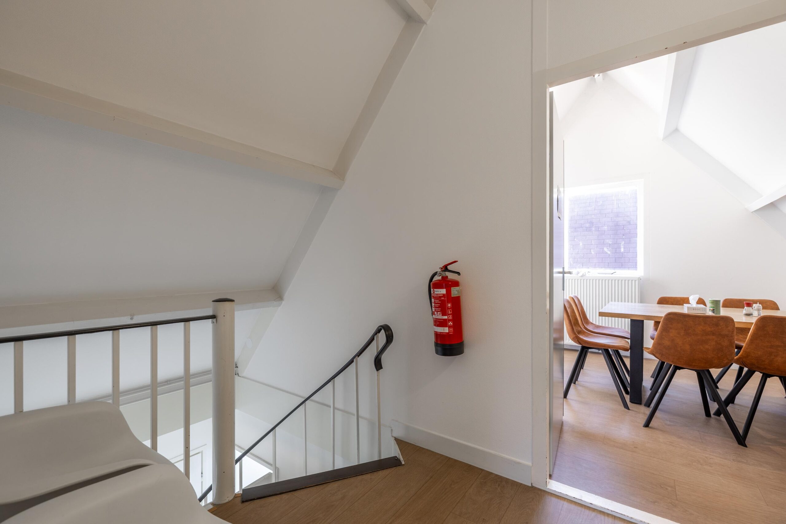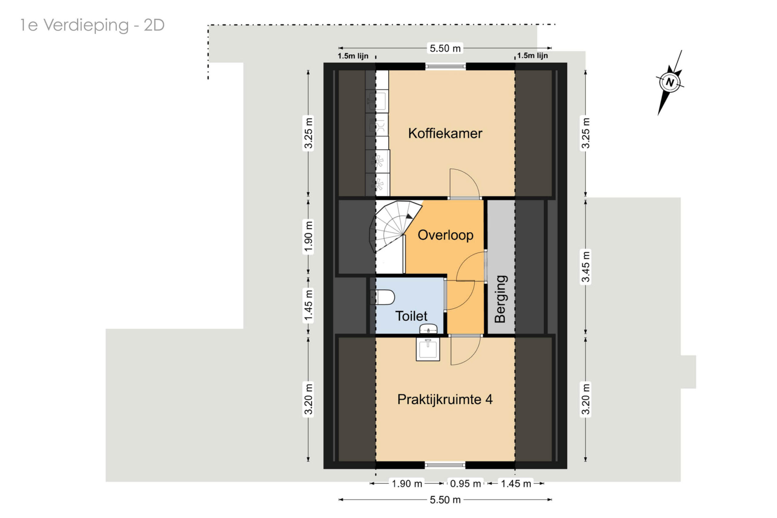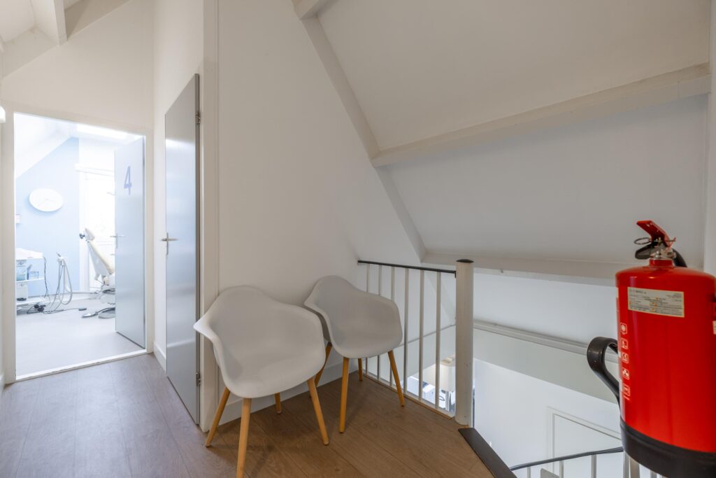 De verdieping beschikt over een overloop met toegang tot een vierde praktijkruimte, een koffiekamer,(oorspronkelijk 2 slaapkamers) een berging en een toilet.