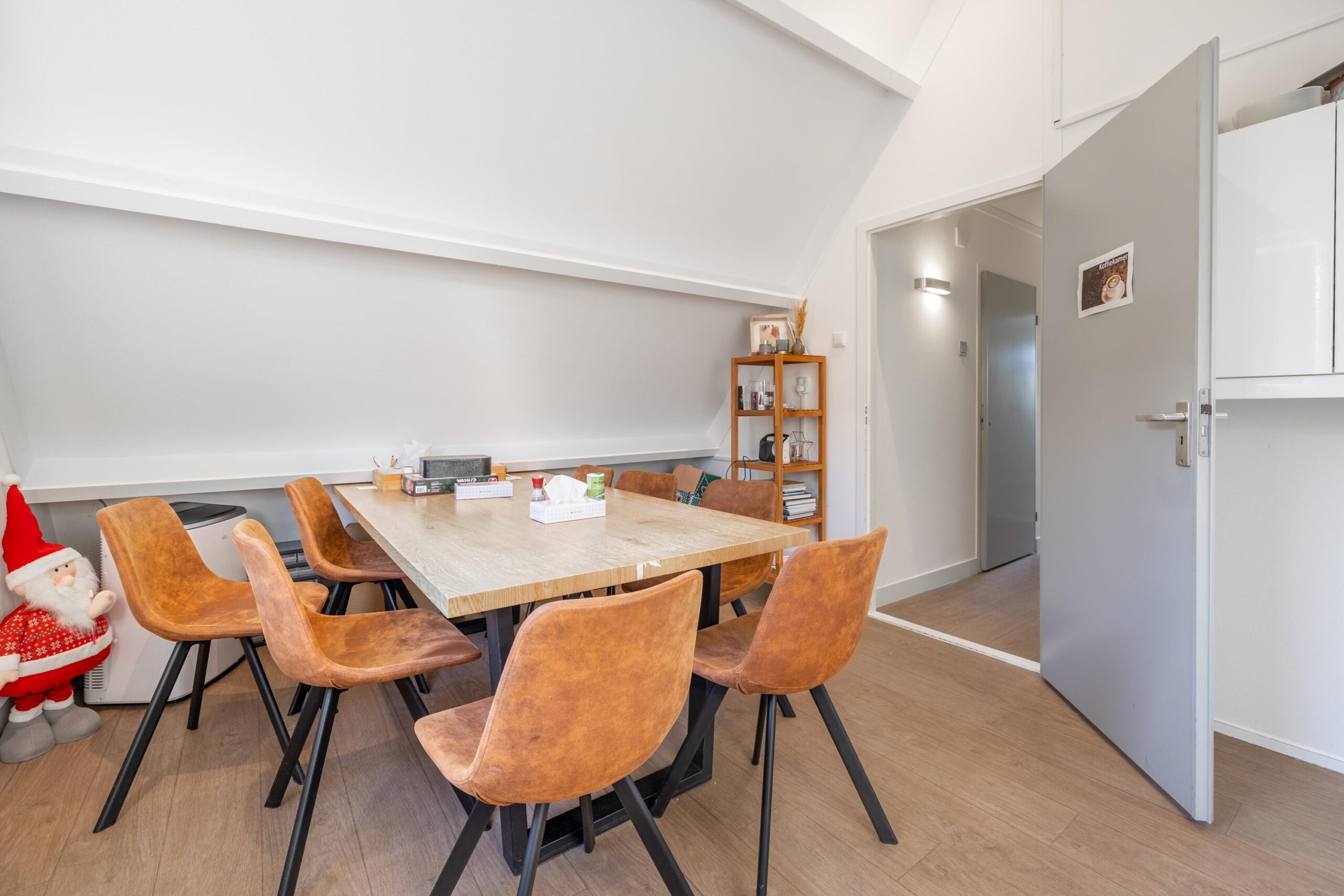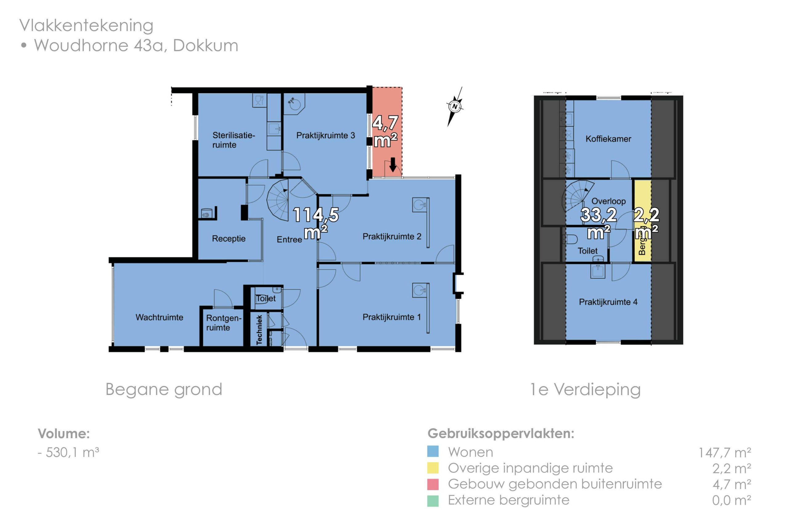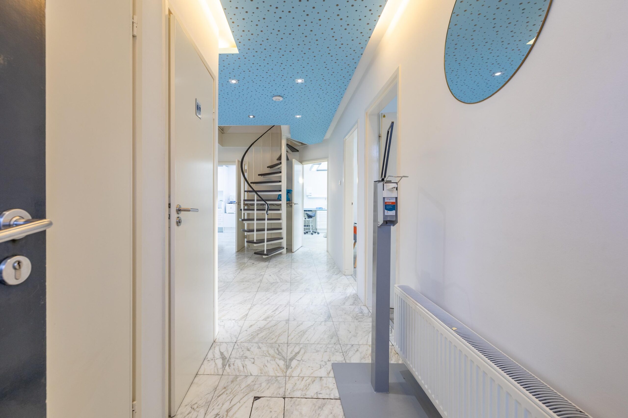 De verdieping beschikt over een overloop met toegang tot een vierde praktijkruimte, een koffiekamer,(oorspronkelijk 2 slaapkamers) een berging en een toilet.