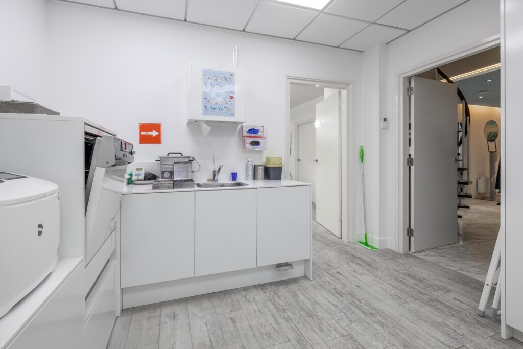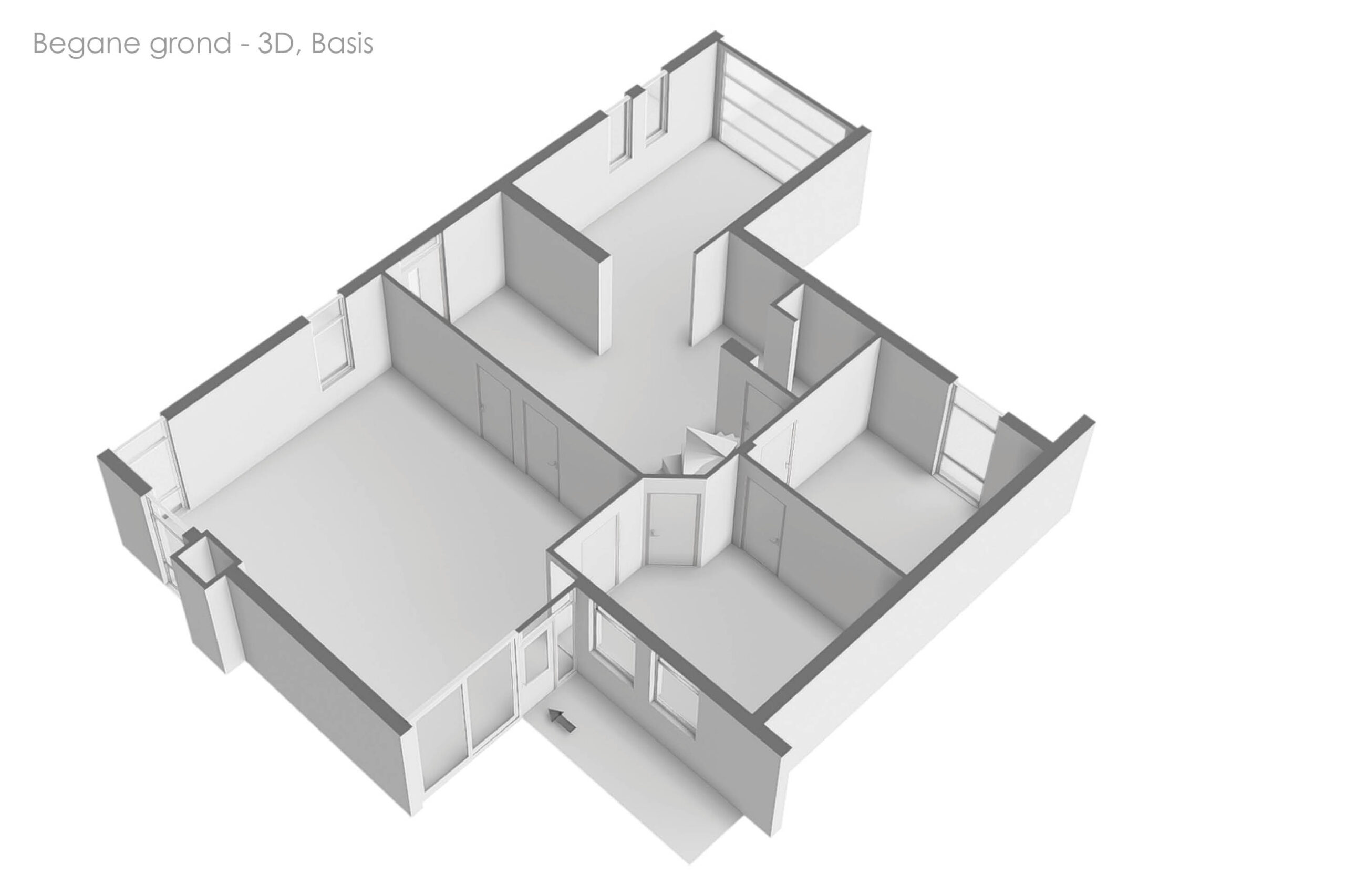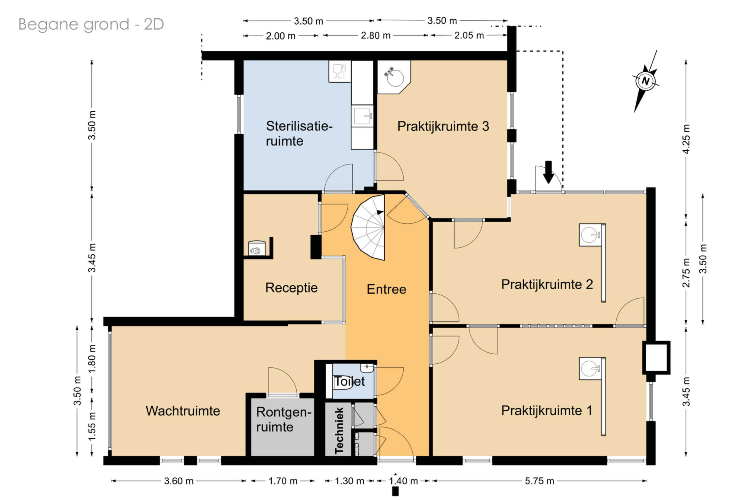 Op de begane grond kom je binnen in een ruime hal die toegang geeft tot alle vertrekken. Hier bevindt zich een lichte wachtkamer met grote raampartijen en aangrenzend een röntgenruimte. Verder zijn er een receptie, drie praktijkruimtes, een sterilisatieruimte, een toilet en een technische ruimte. Vanuit de hal is tevens de trap naar de verdieping bereikbaar.