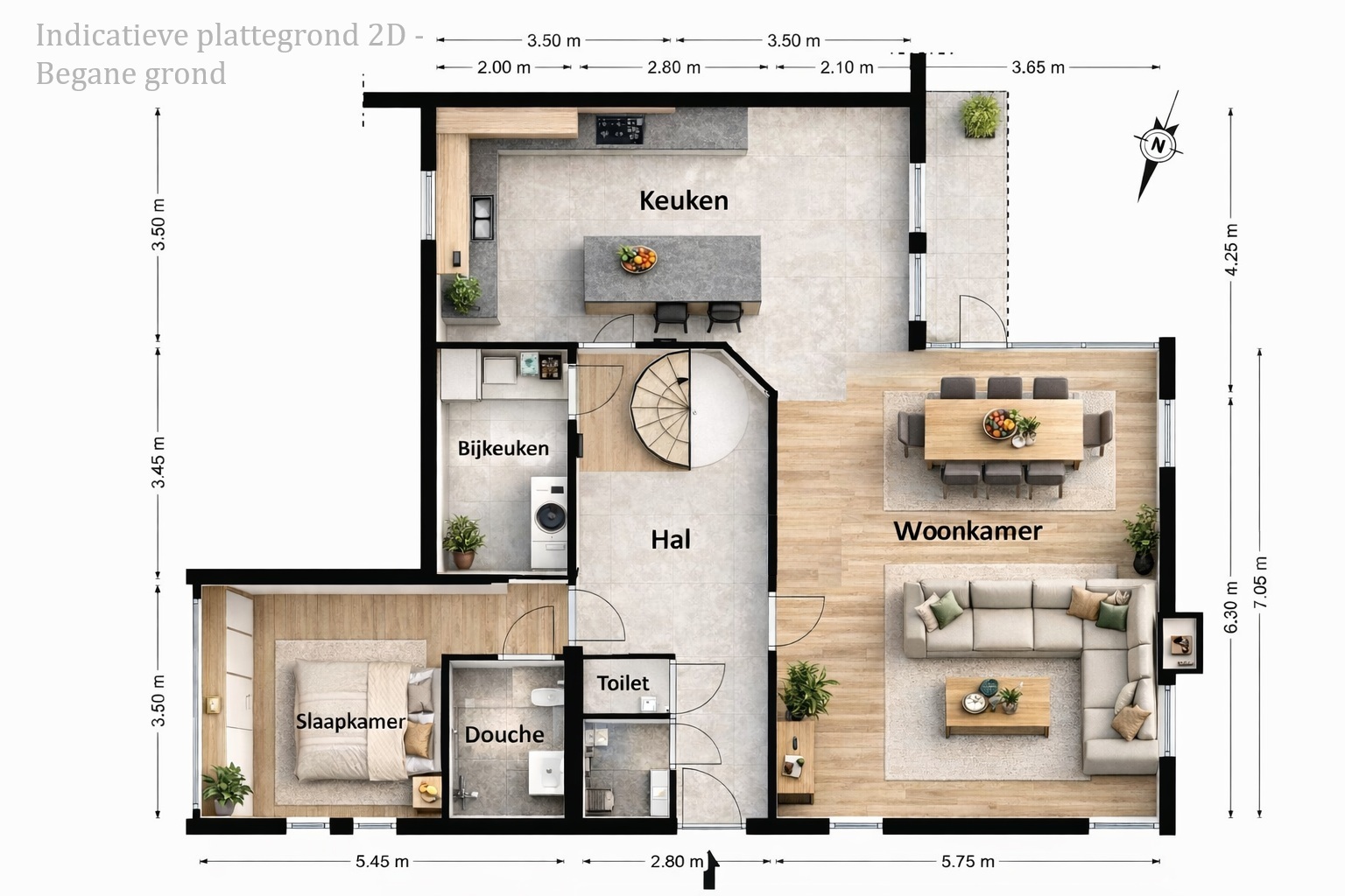 Ter illustratie zijn aan deze presentatie plattegronden toegevoegd die een beeld geven van mogelijke indelingen waarin de woning kan worden gerealiseerd. Hiervan zijn twee voorbeelden uitgewerkt. Bij deze varianten is gekeken naar de mogelijkheden waarbij wanden eventueel verwijderd of aangepast kunnen worden, om zo verschillende indelingsopties inzichtelijk te maken.