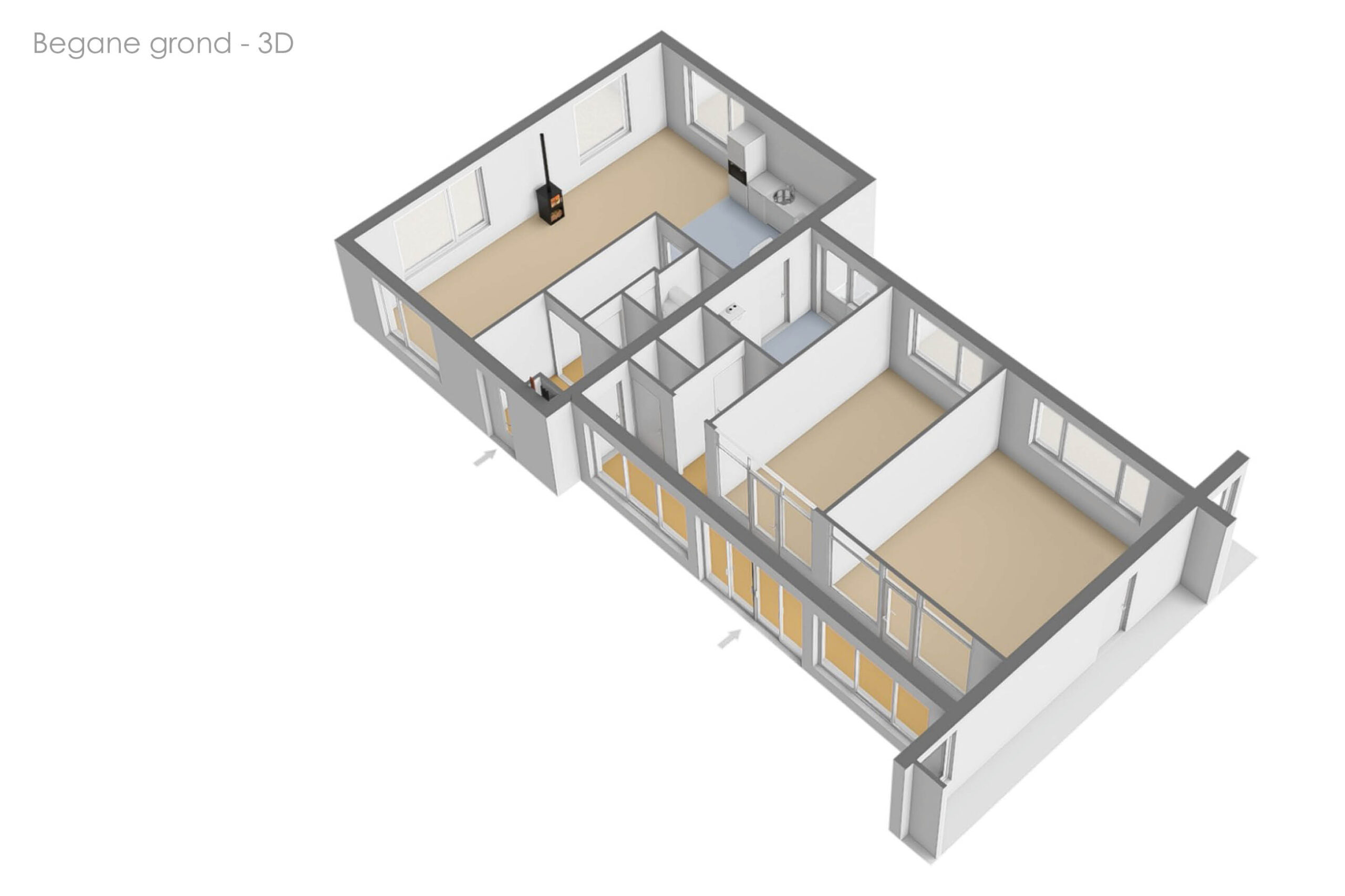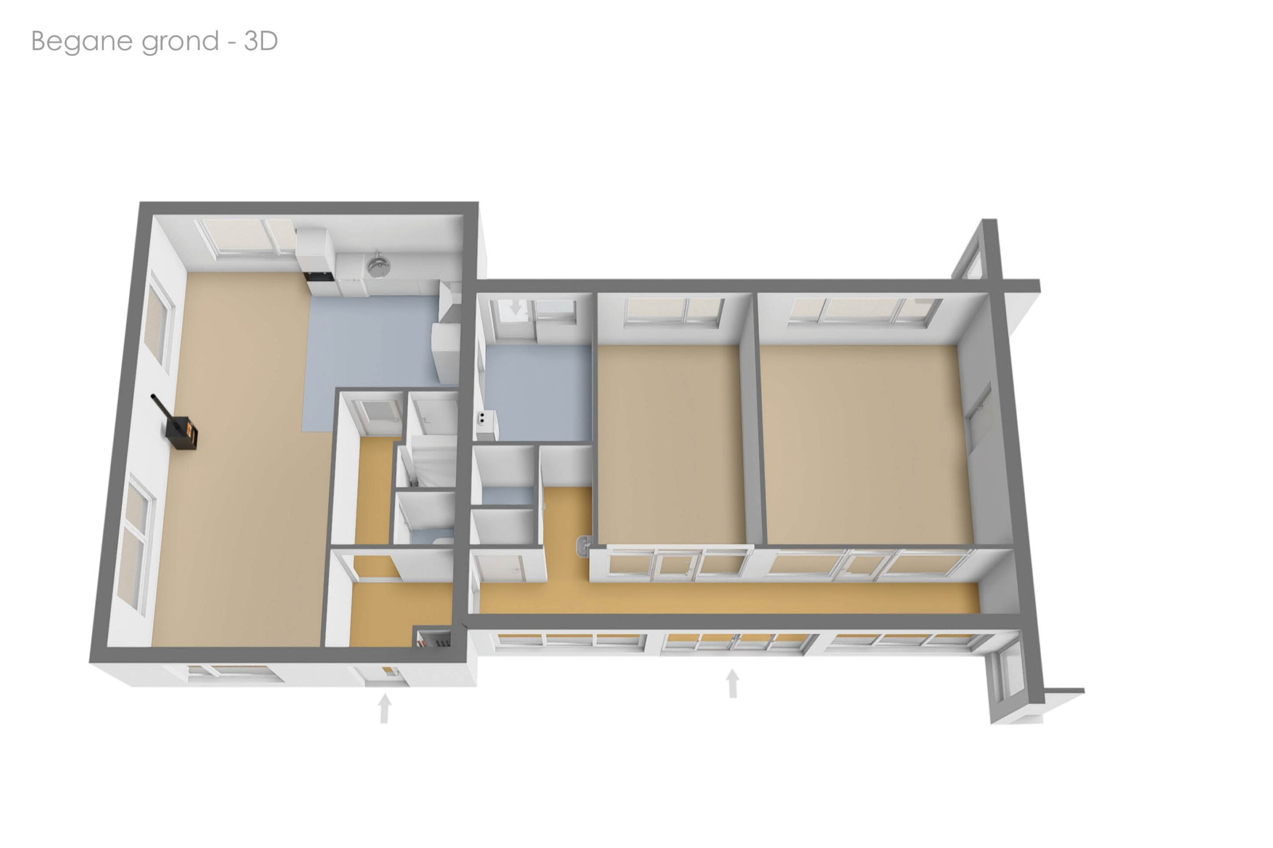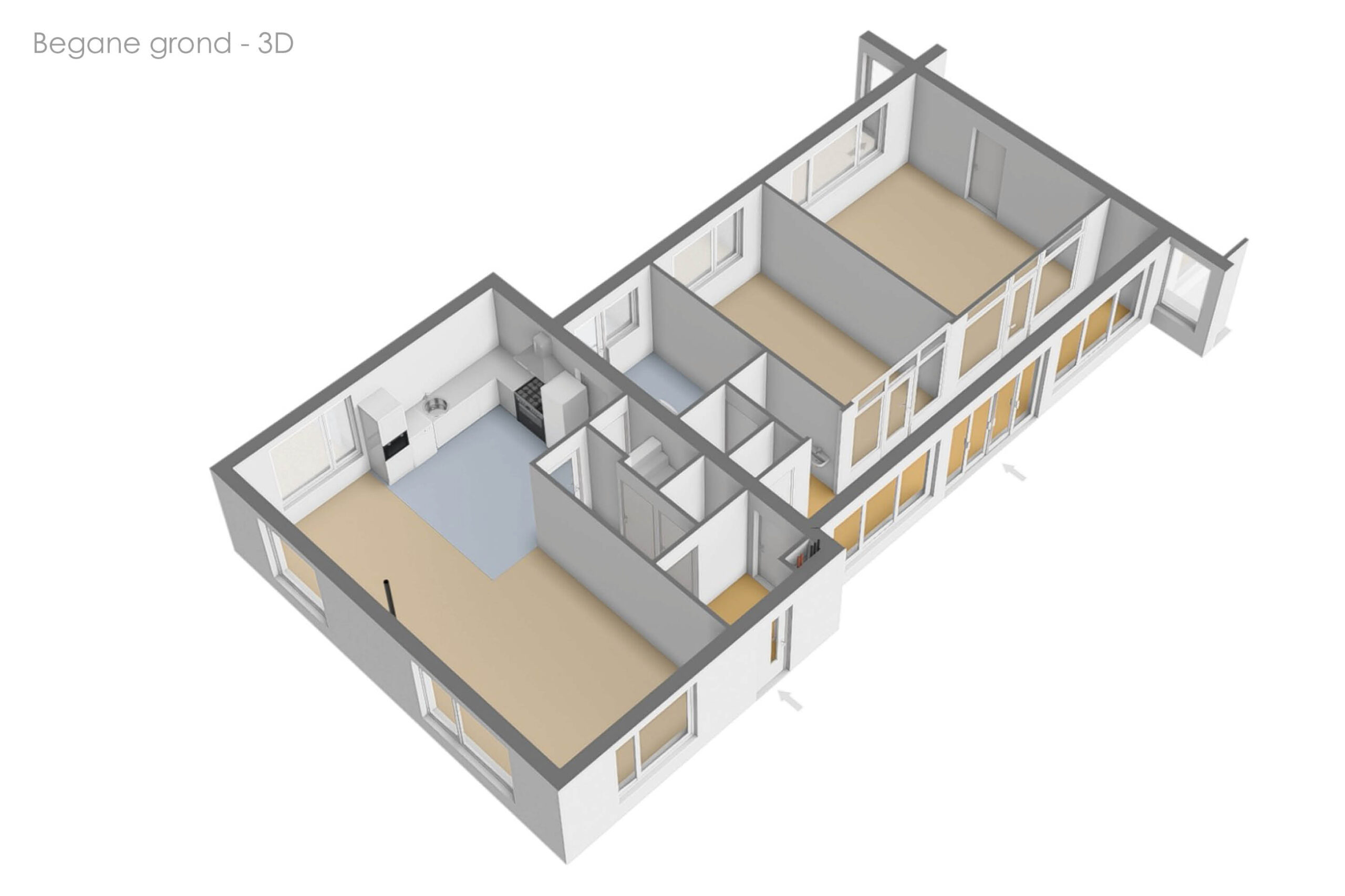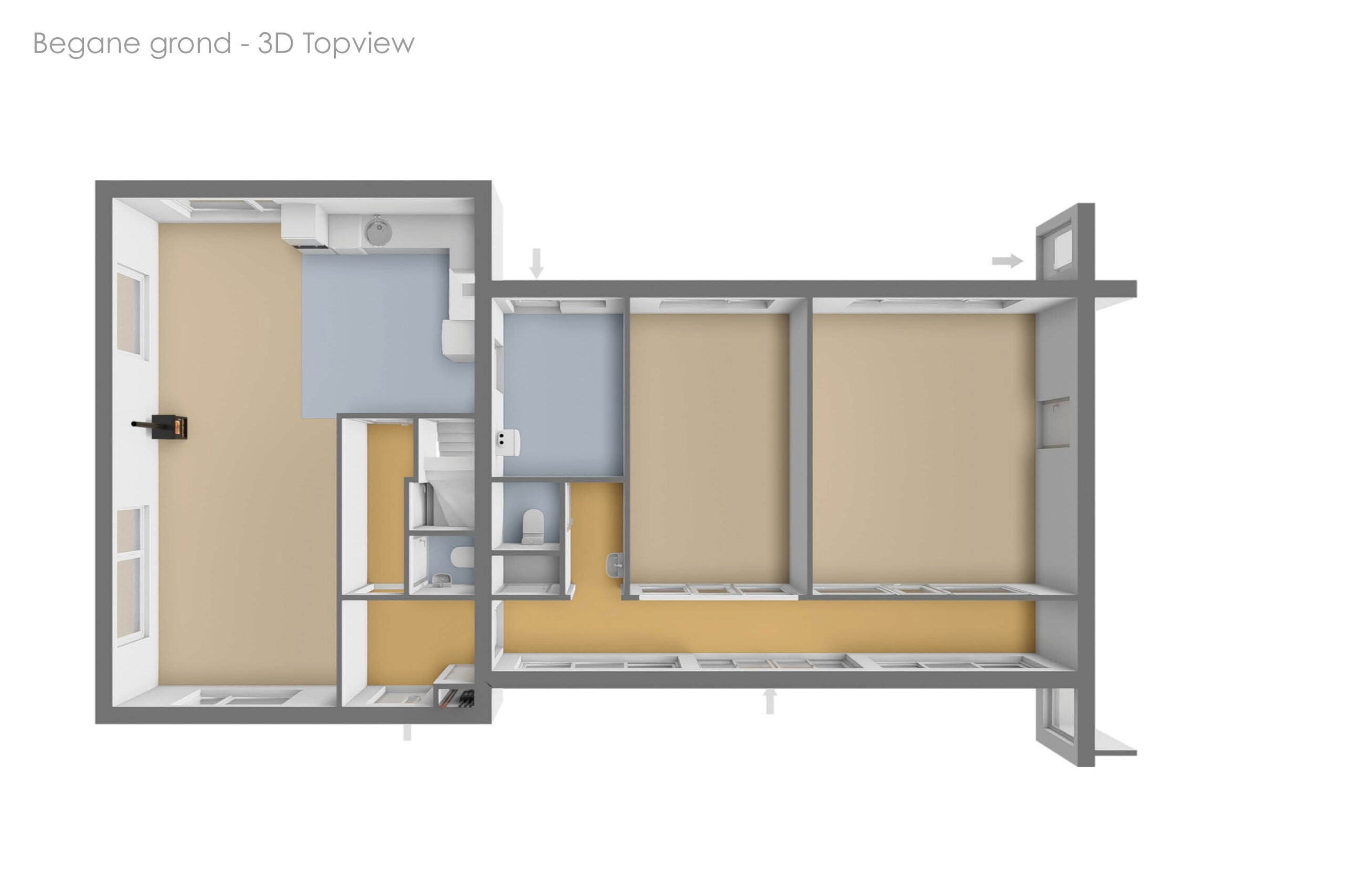 De woning zelf heeft op de begane grond twee entrees. Eén hal bevindt zich in het tussenstuk tussen de woning en de units en geeft toegang tot een toilet en twee ruimtes die kunnen dienen als slaapkamer of werkplek. De andere hal leidt naar een tweede toilet, een trap naar de kelder en de keuken. Vanuit de open keuken komt men in de woonkamer met eethoek, en via de keuken is ook de bijkeuken bereikbaar.