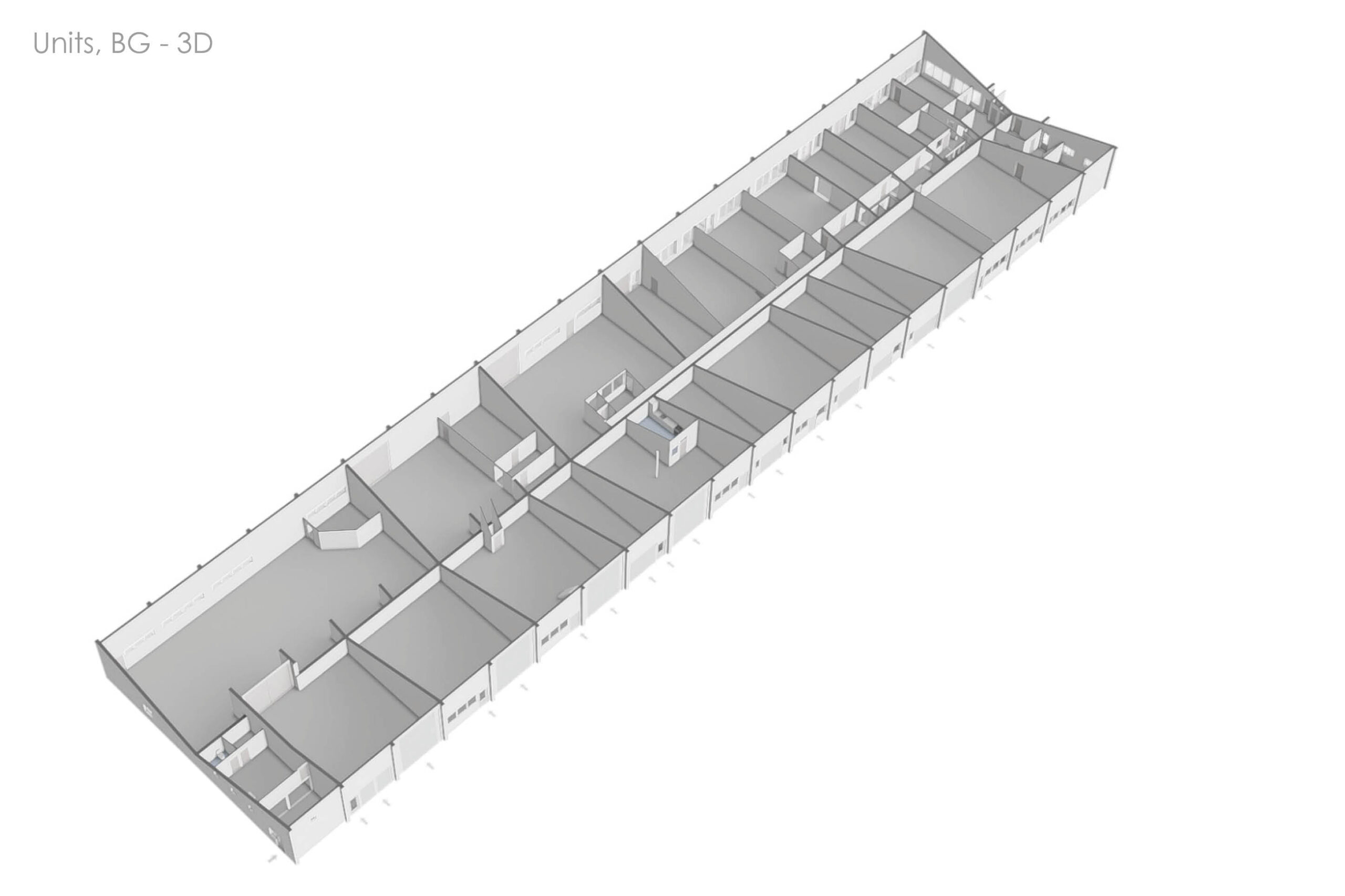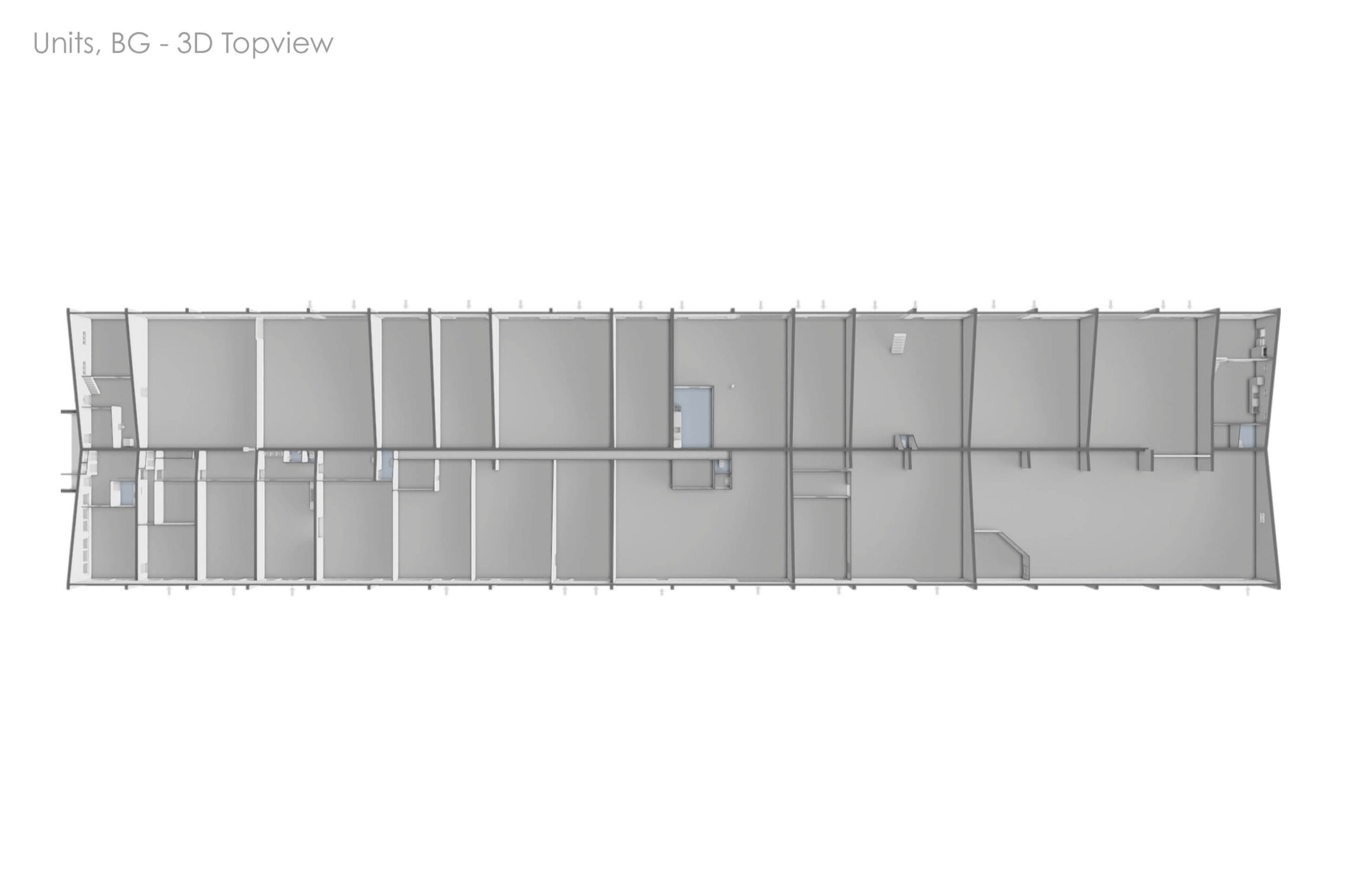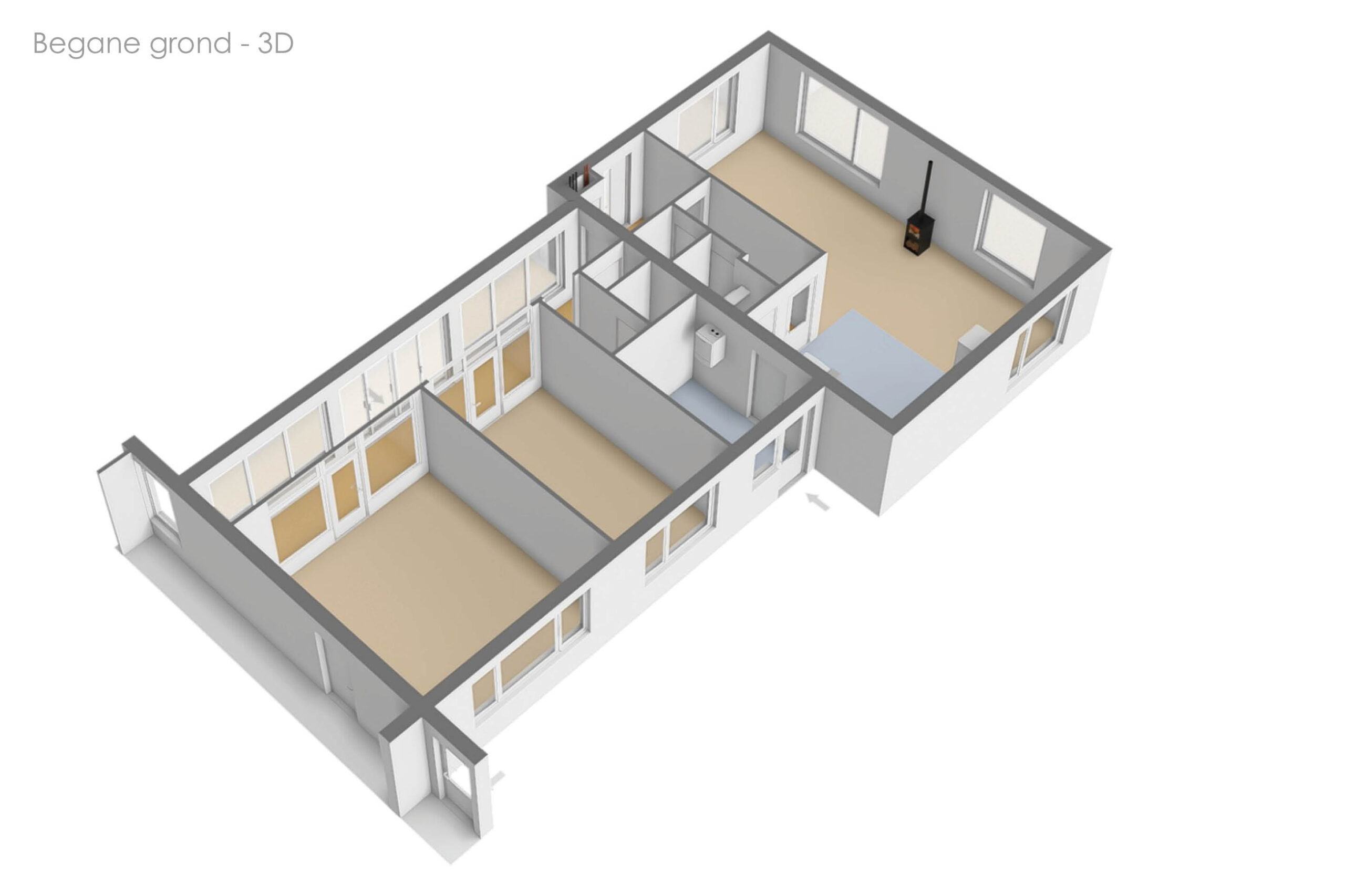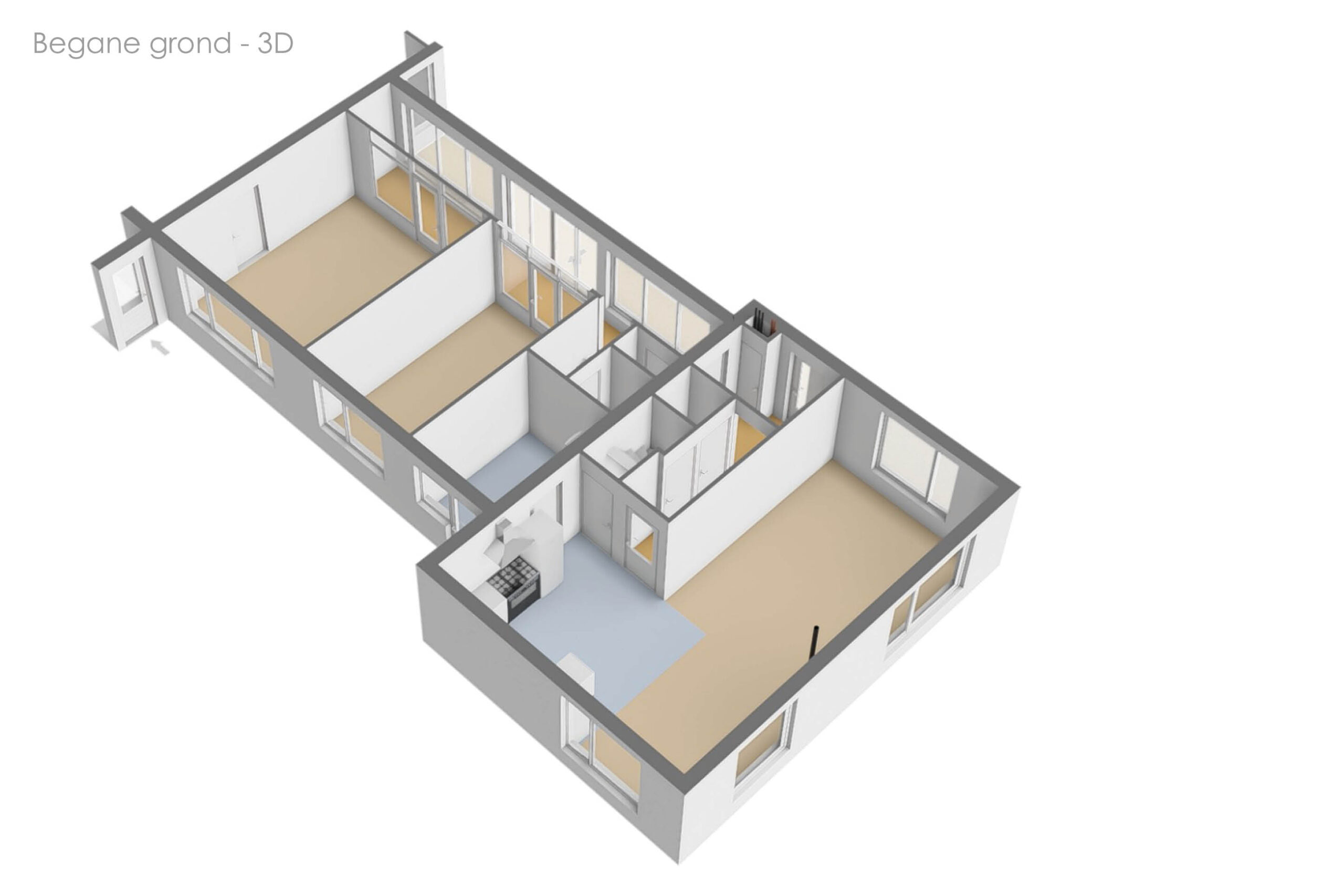 De woning zelf heeft op de begane grond twee entrees. Eén hal bevindt zich in het tussenstuk tussen de woning en de units en geeft toegang tot een toilet en twee ruimtes die kunnen dienen als slaapkamer of werkplek. De andere hal leidt naar een tweede toilet, een trap naar de kelder en de keuken. Vanuit de open keuken komt men in de woonkamer met eethoek, en via de keuken is ook de bijkeuken bereikbaar.