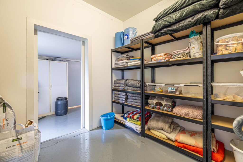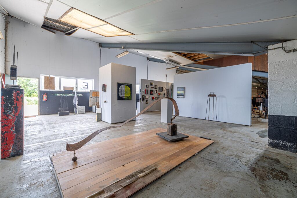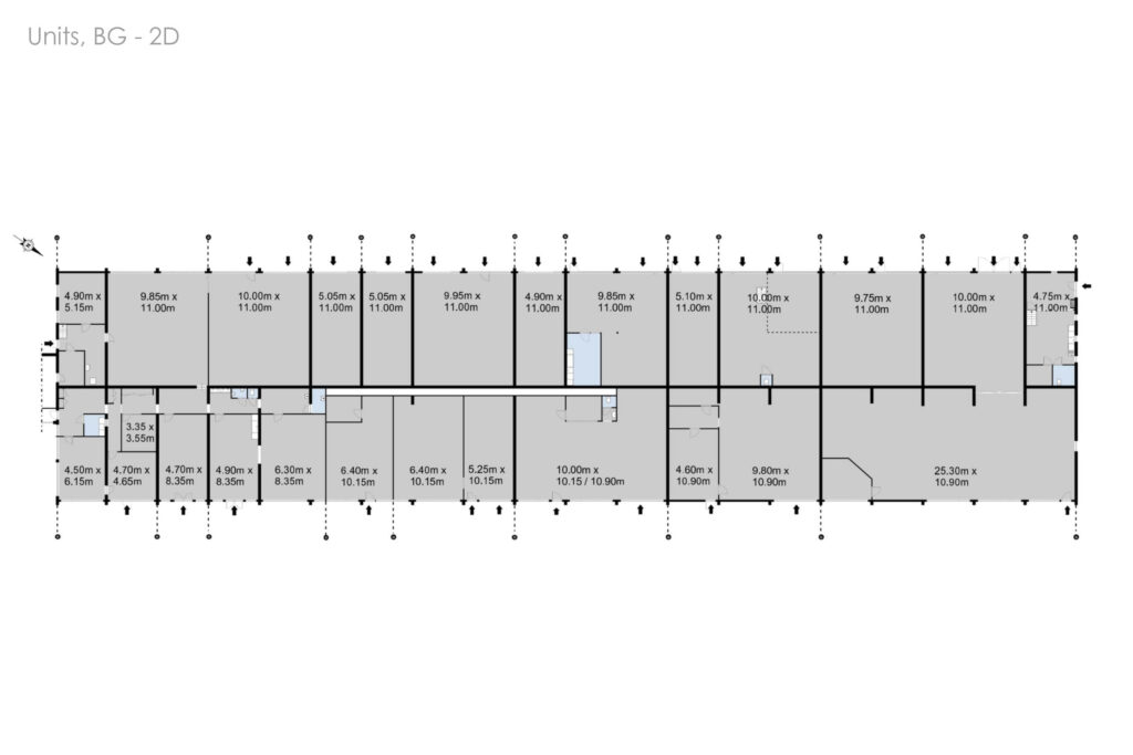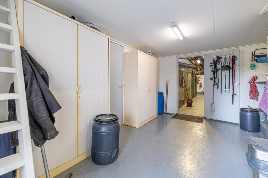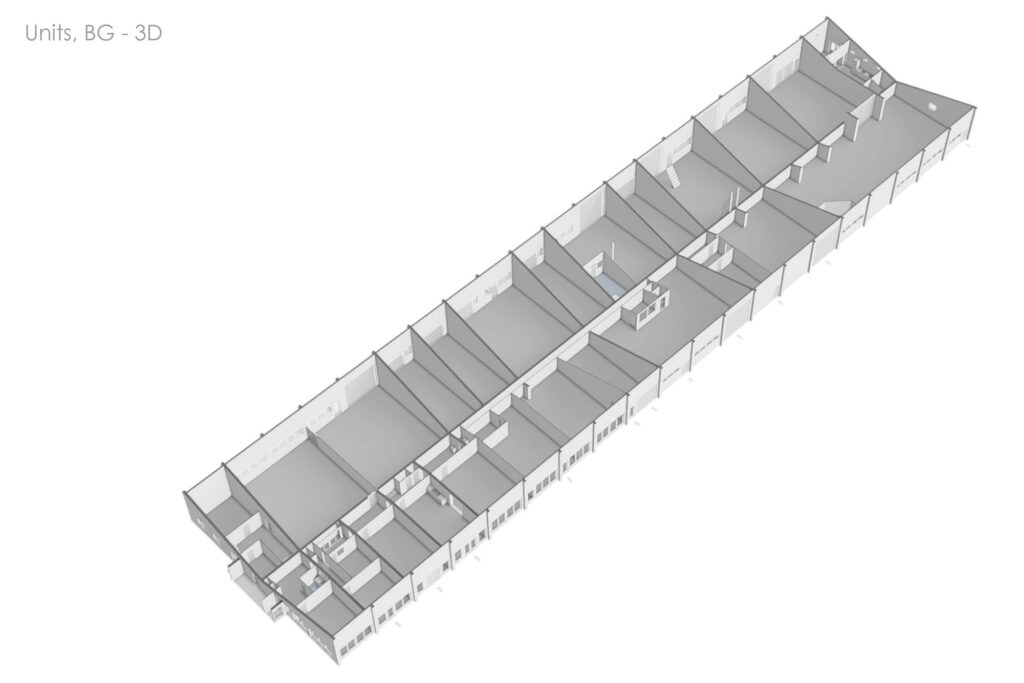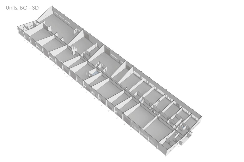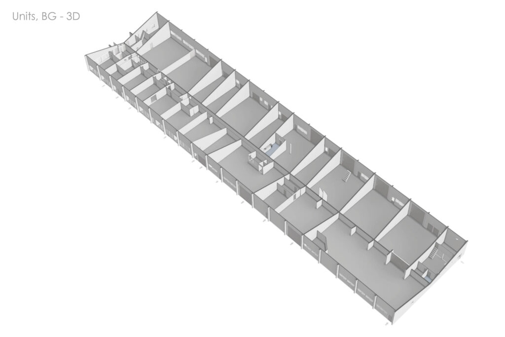 De woning zelf heeft op de begane grond twee entrees. Eén hal bevindt zich in het tussenstuk tussen de woning en de units en geeft toegang tot een toilet en twee ruimtes die kunnen dienen als slaapkamer of werkplek. De andere hal leidt naar een tweede toilet, een trap naar de kelder en de keuken. Vanuit de open keuken komt men in de woonkamer met eethoek, en via de keuken is ook de bijkeuken bereikbaar.