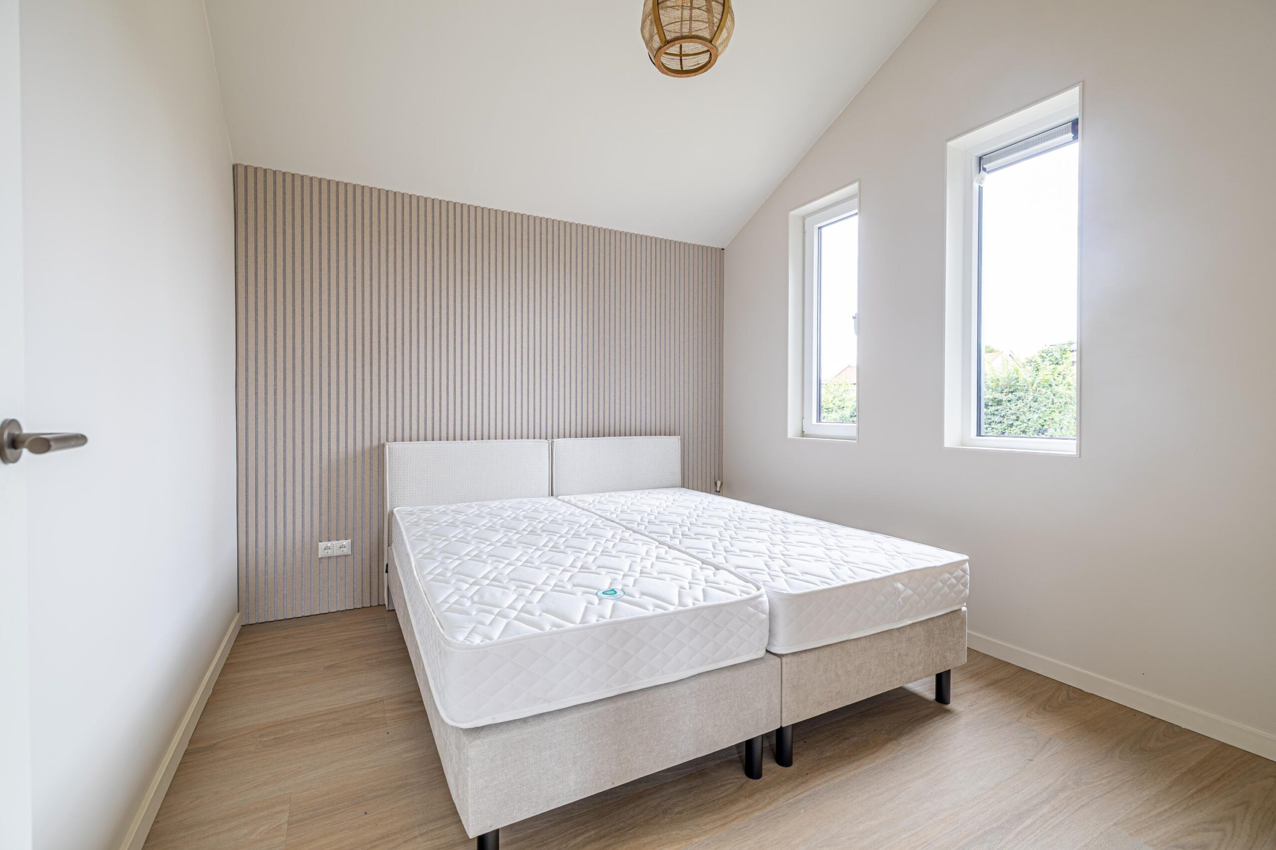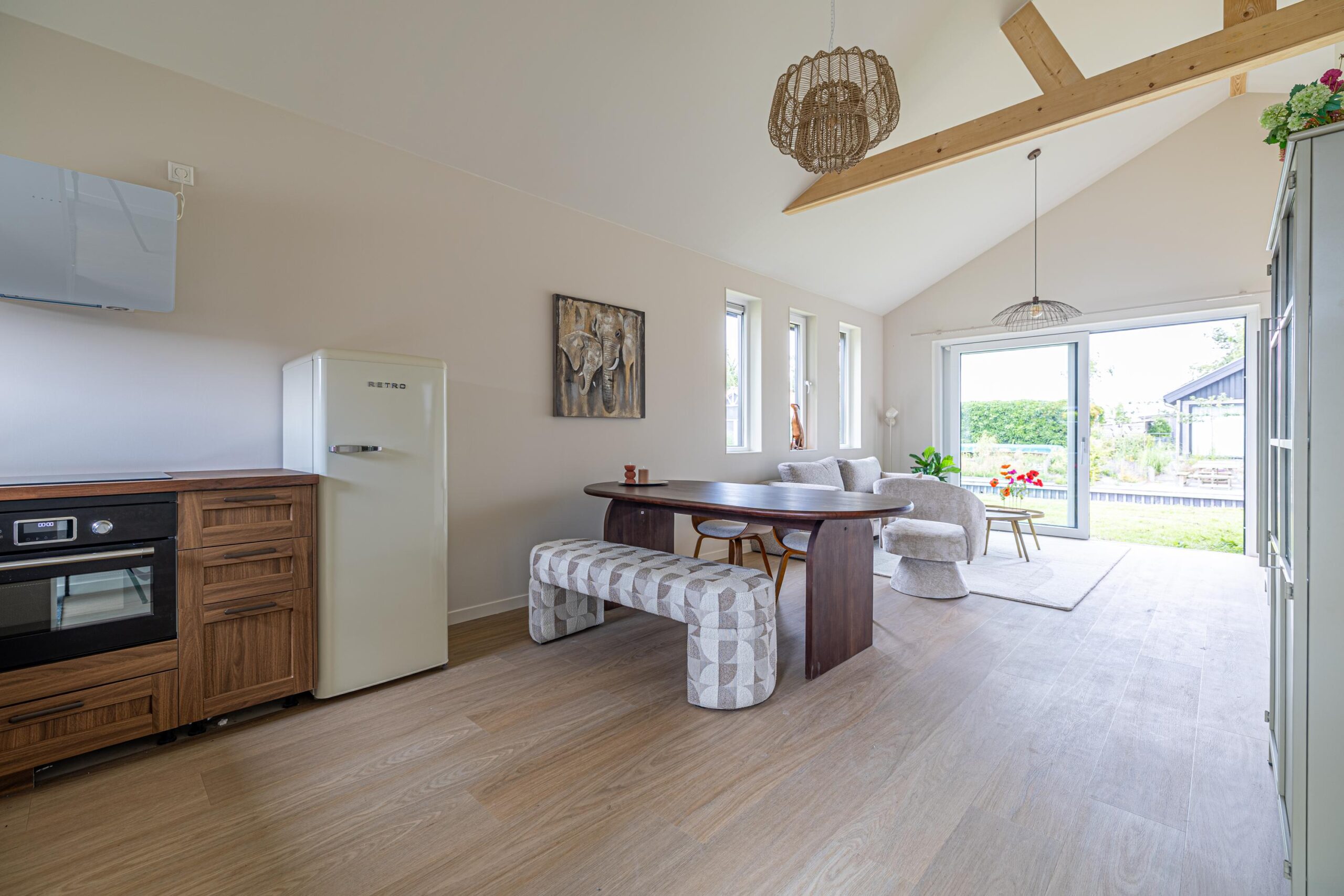 Bij binnenkomst ervaar je direct de ruimte dankzij de hoge plafonds en de vele raampartijen. De gezellige woonkamer met schuifpui geeft direct toegang tot de tuin. De moderne keuken is van alle gemakken voorzien en afgewerkt met hoogwaardige materialen. De badkamer is stijlvol betegeld en uitgerust met een luxe douche, toilet en wastafel. Verder heeft de woning nog twee ruime slaapkamers.