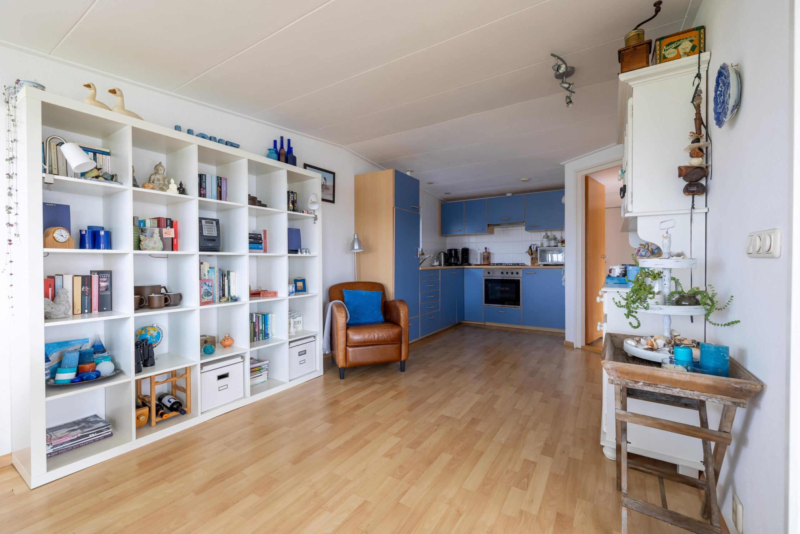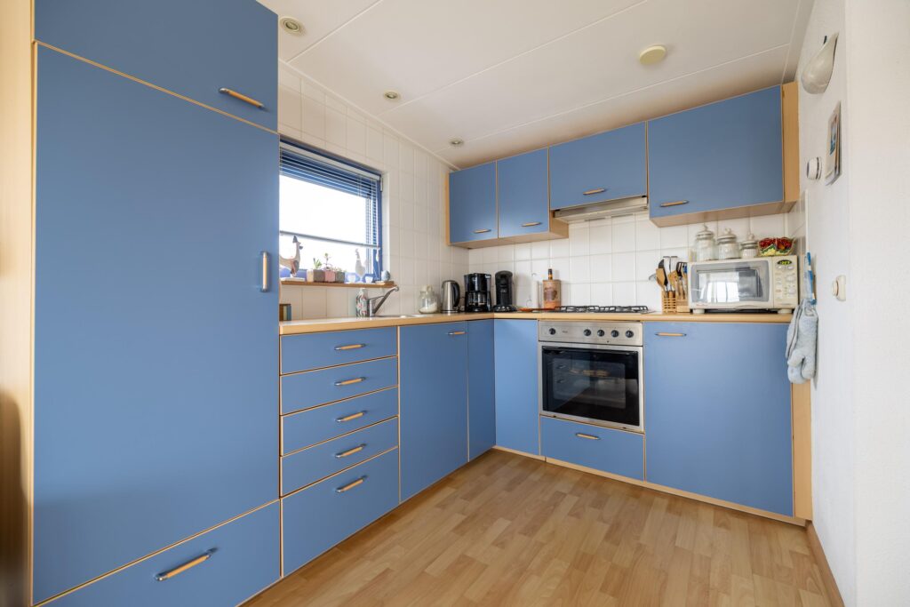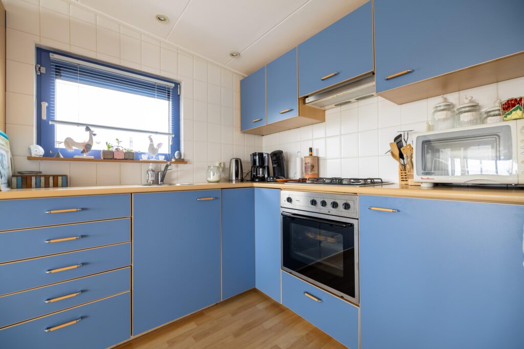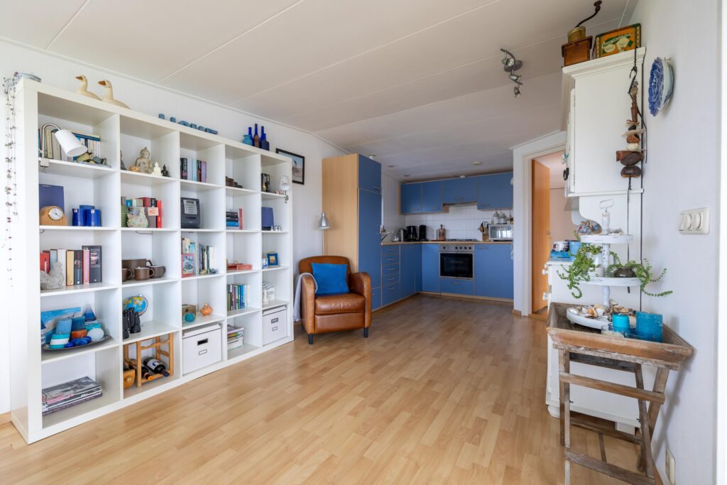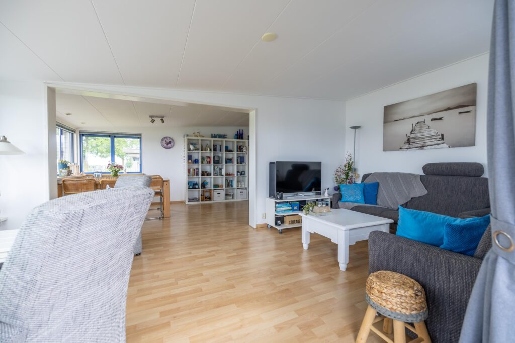 Das Wohnzimmer ist geräumig und hell. Dank der großen Fenster haben Sie einen schönen Blick auf das Lauwersmeer und den Yachthafen. Angrenzend an das Wohnzimmer befindet sich die offene Küche. Die Küche ist mit verschiedenen Einbaugeräten ausgestattet. Neben der Küche befindet sich ein Abstellraum mit Anschlüssen für Haushaltsgeräte.