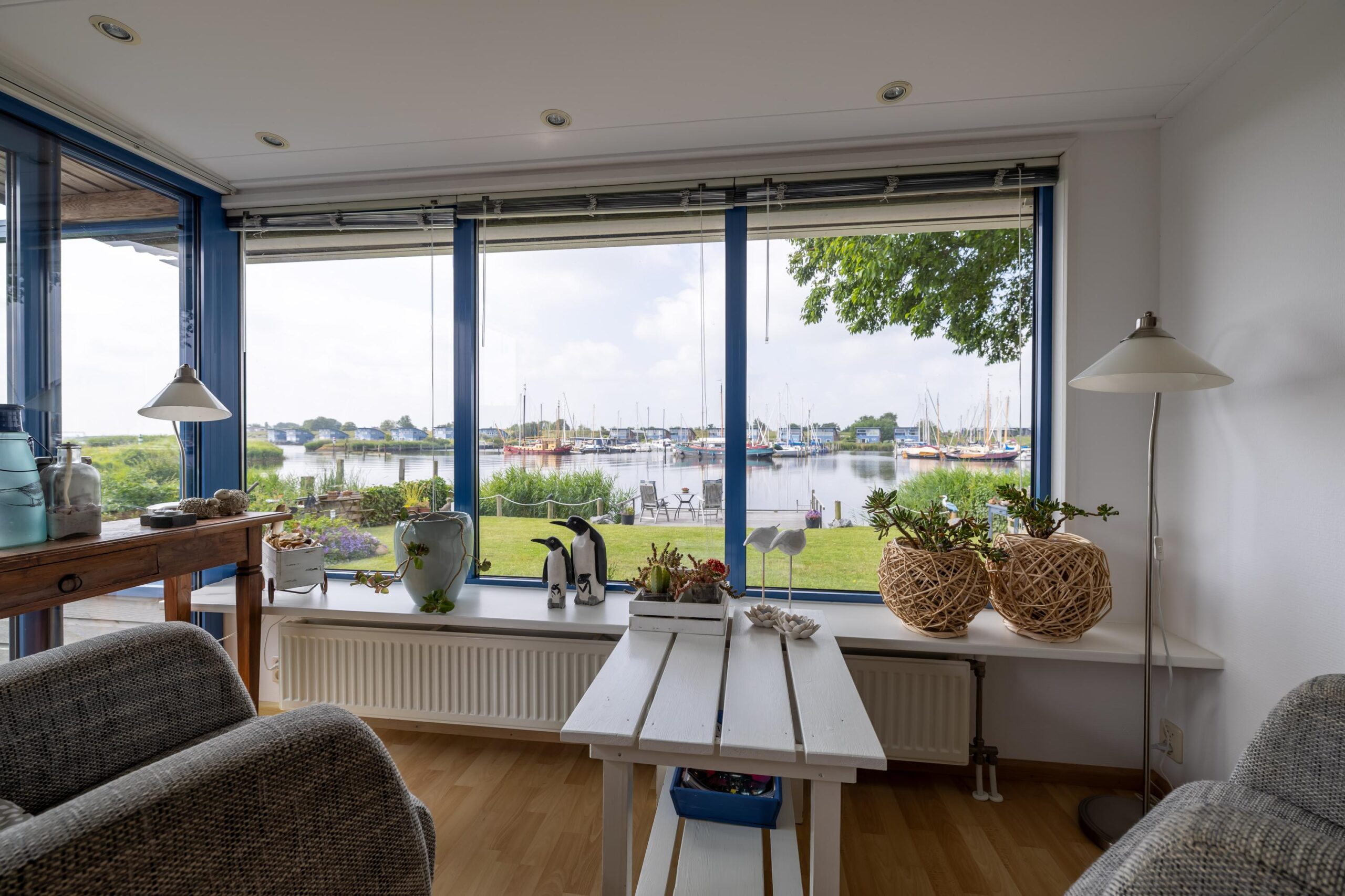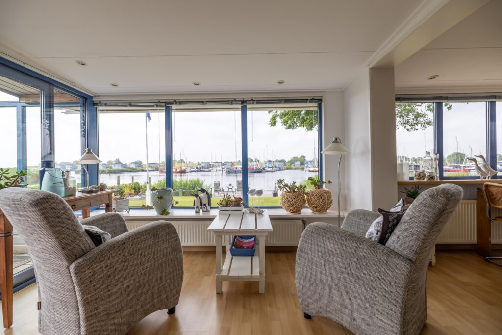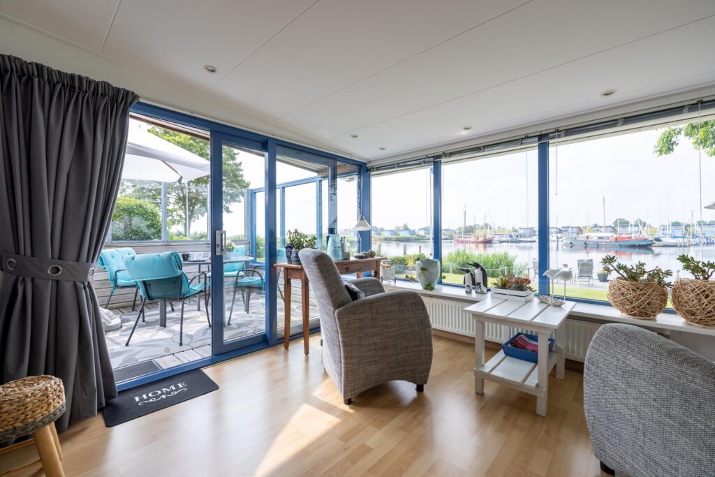 De woonkamer is ruim en licht. Dankzij de grote ramen heb je hier een prachtig uitzicht over het Lauwersmeer en de jachthaven. Aansluitend aan de woonkamer bevindt zich de open keuken. De keuken is voorzien van diverse inbouwapparatuur. Naast de keuken bevindt zich een bergruimte, met aansluitingen voor het witgoed.