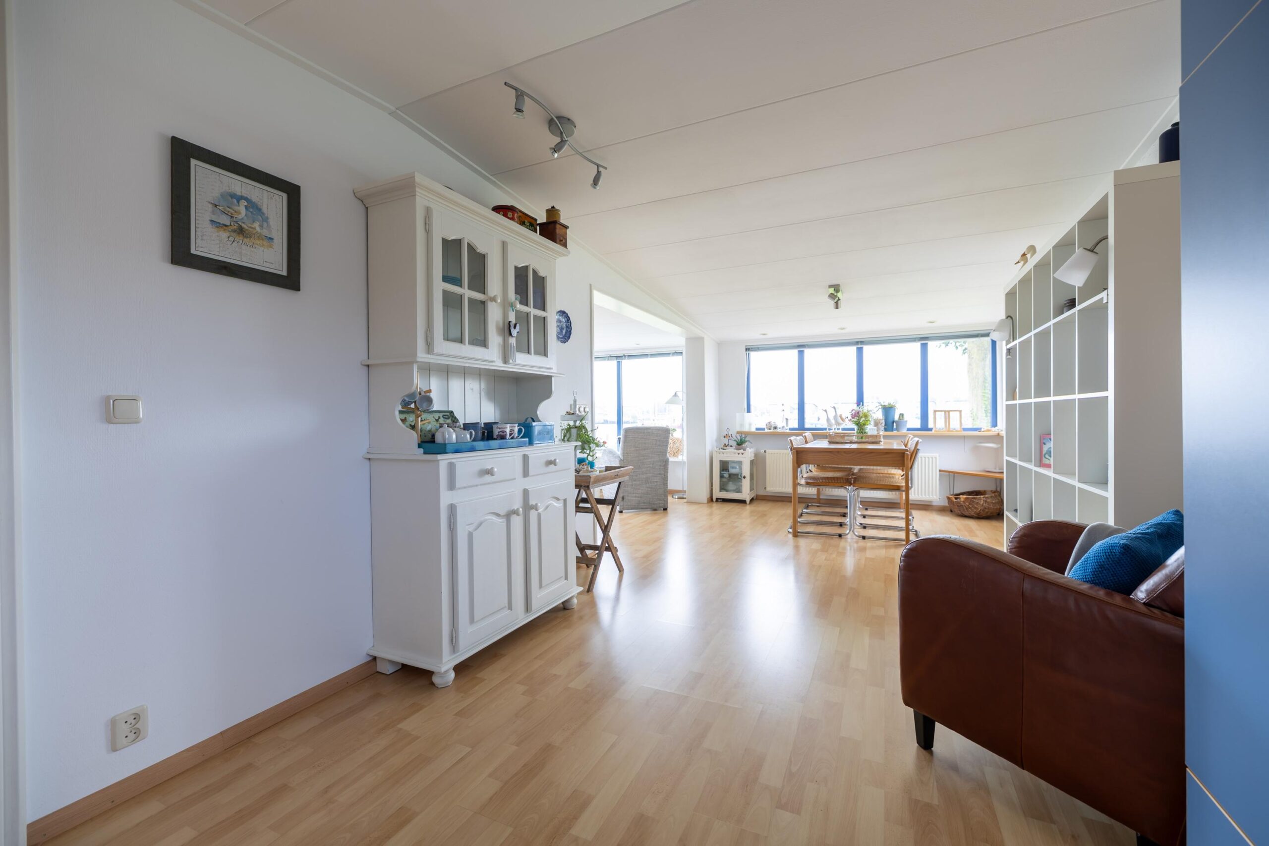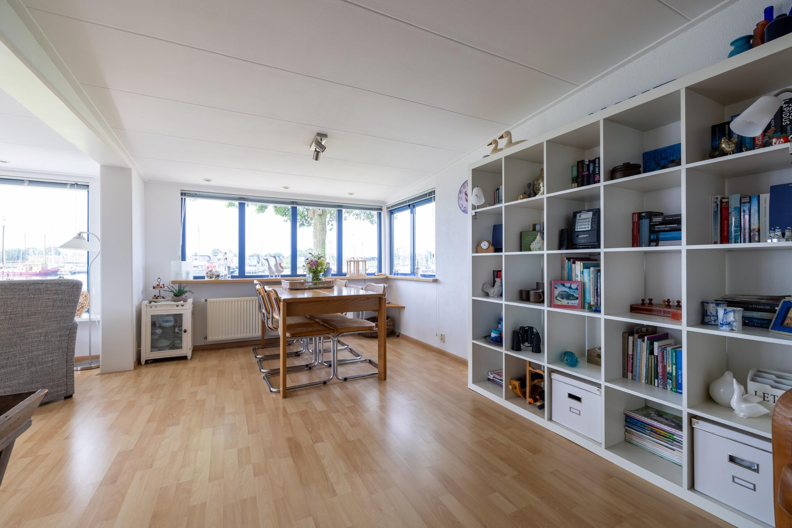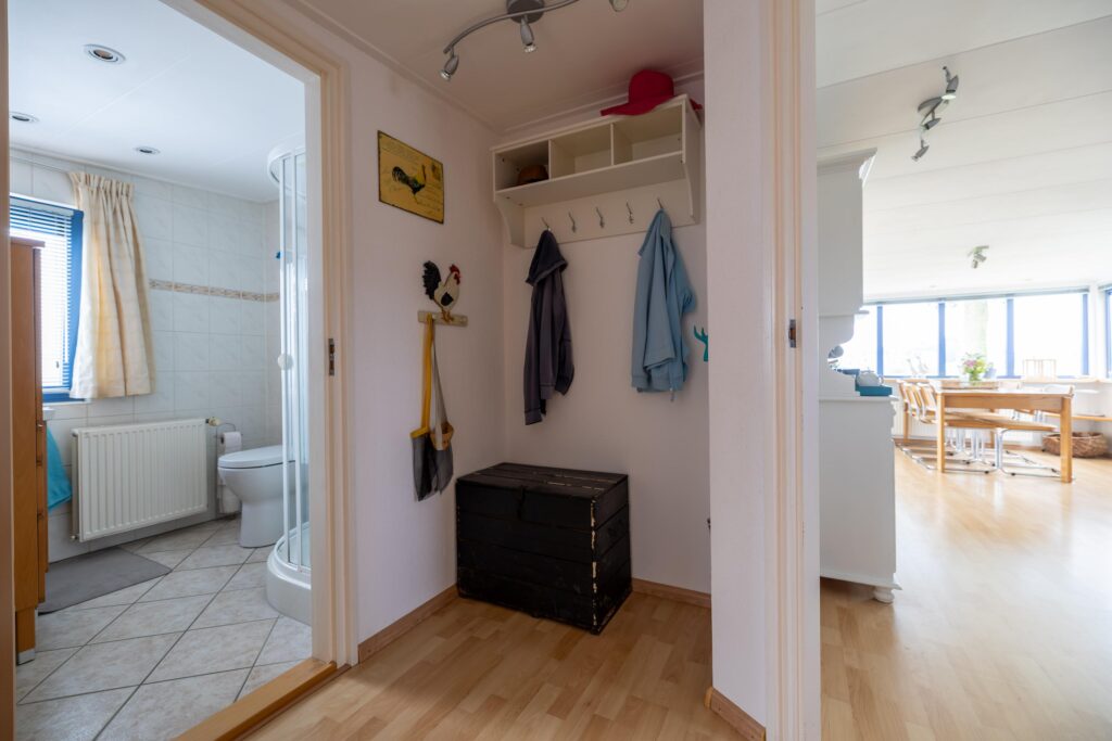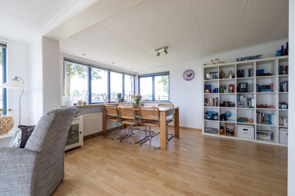 The living room is spacious and light. Thanks to the large windows you have a beautiful view of the Lauwersmeer and the marina. Adjacent to the living room is the open kitchen. The kitchen is equipped with various built-in appliances. Next to the kitchen is a storage room, with connections for white goods.