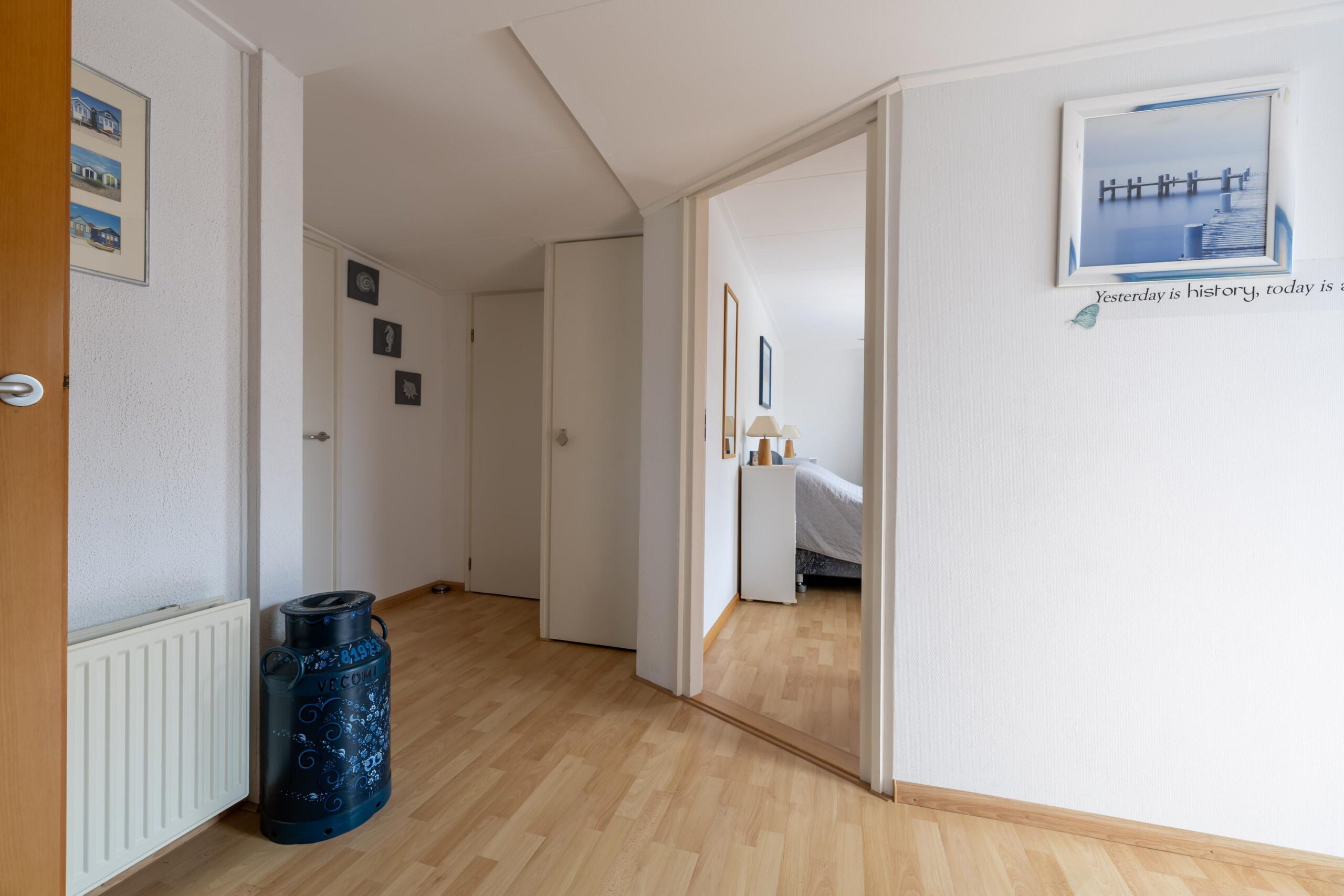 Bij binnenkomst betreed je de hal, die fungeert als het centrale punt van de woning. Vanuit hier heb je toegang tot de woonkamer, de badkamer en de twee slaapkamers.