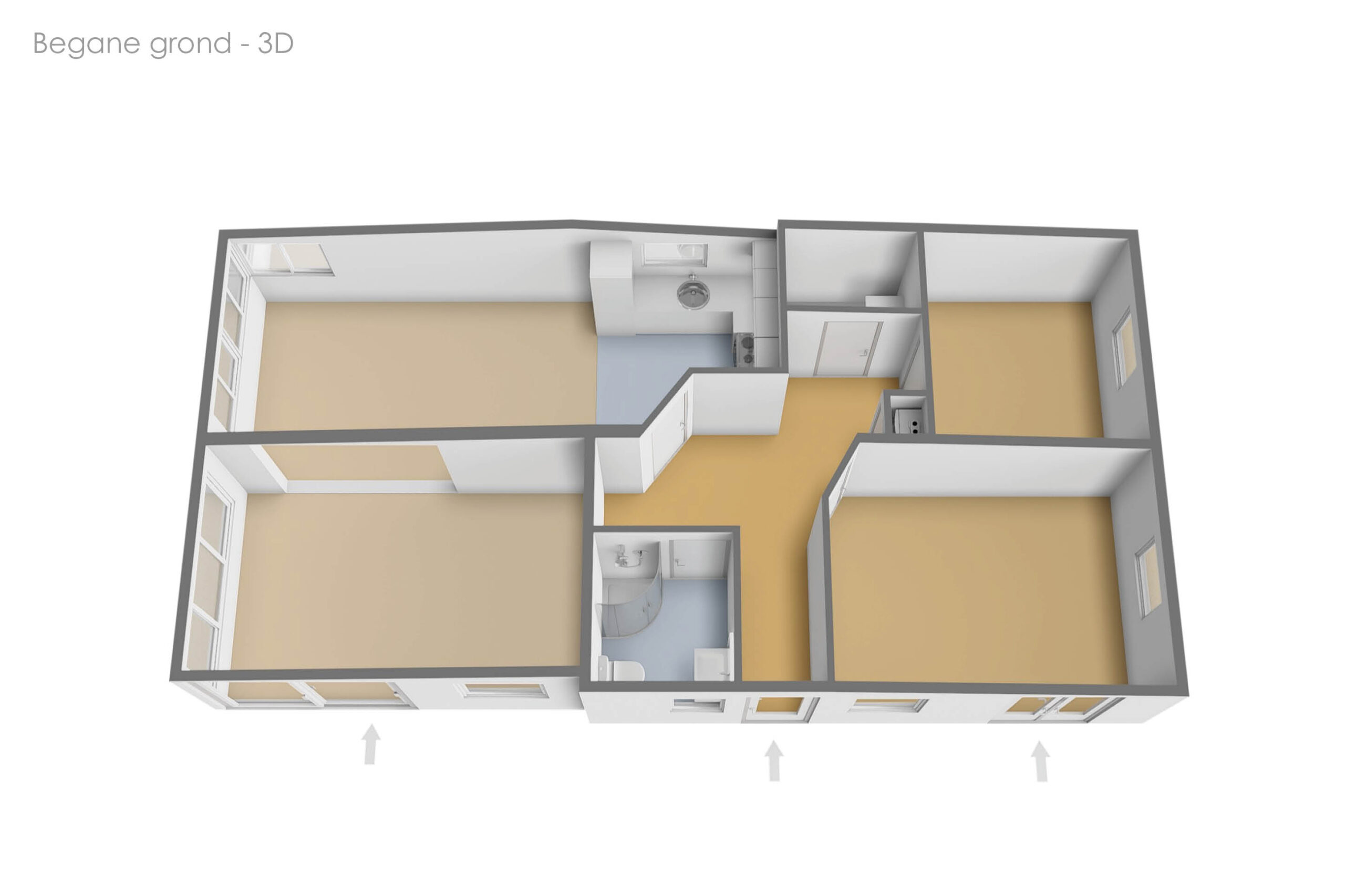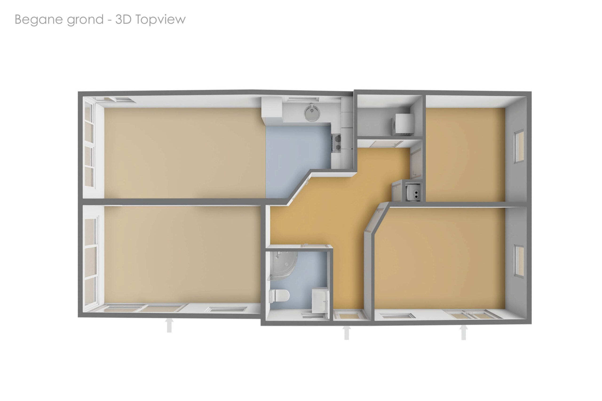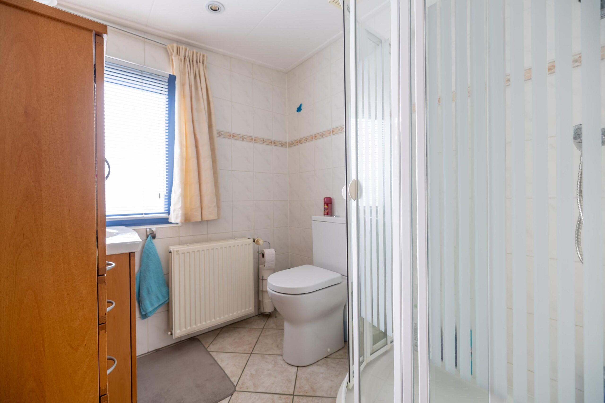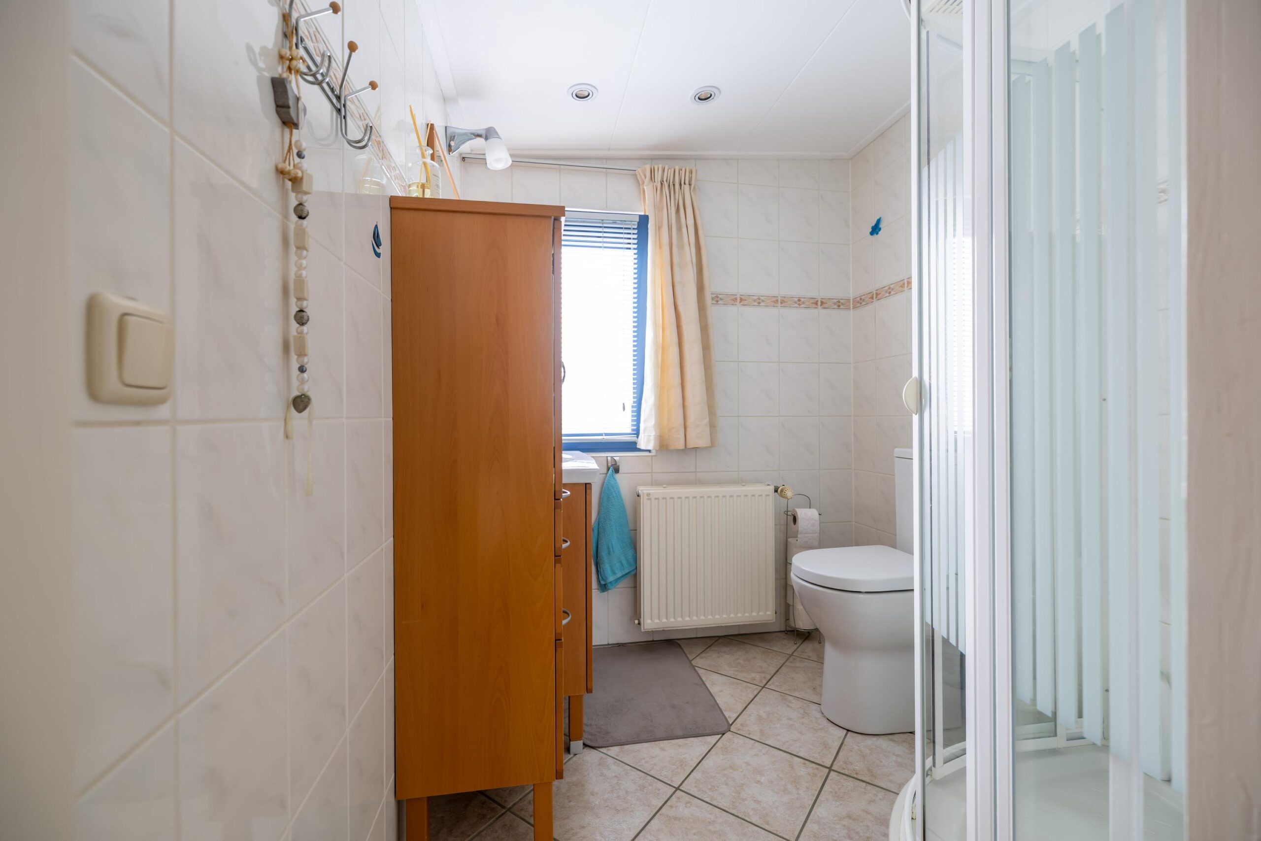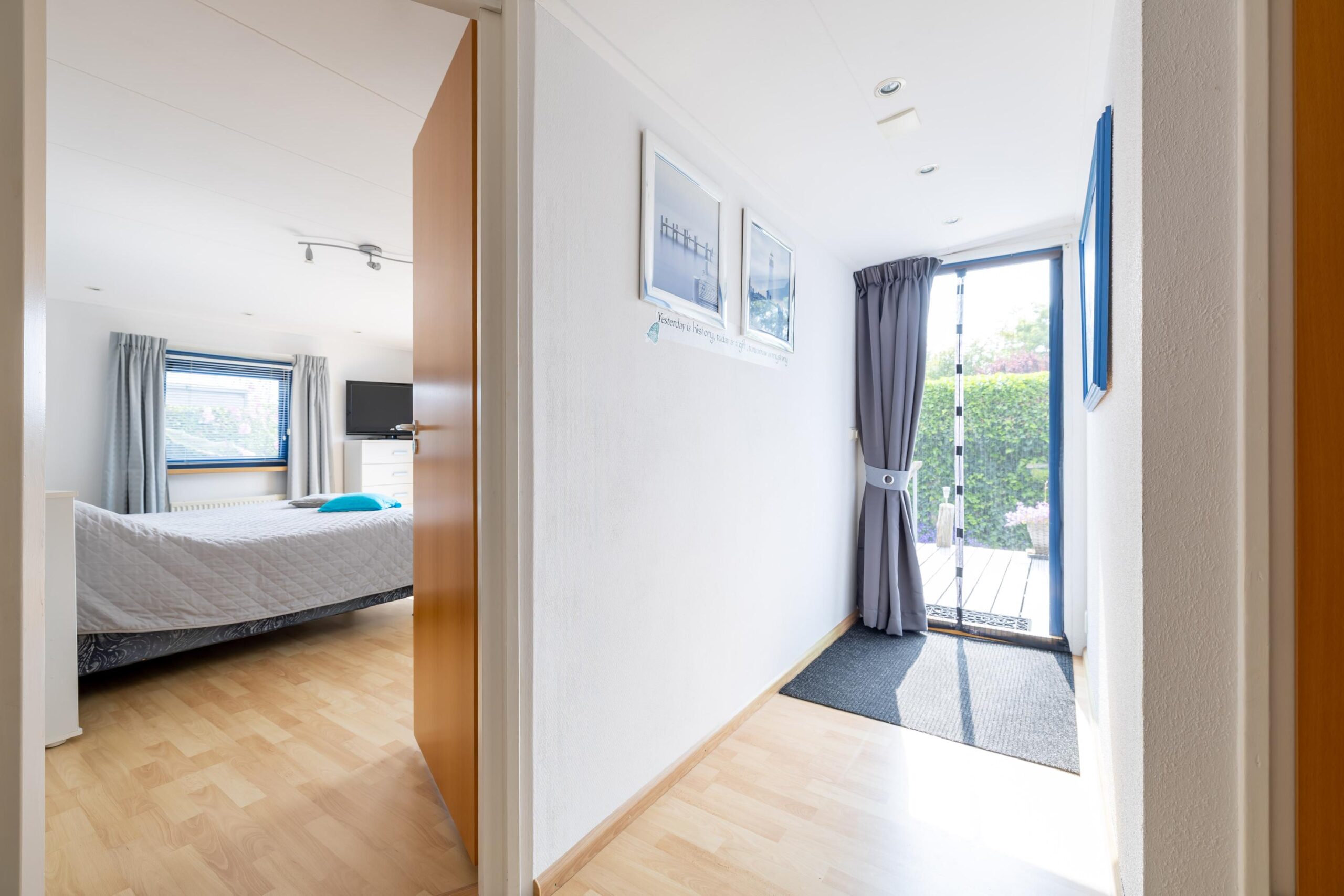 Upon entering you enter the hall, which functions as the central point of the house. From here you have access to the living room, the bathroom and the two bedrooms.