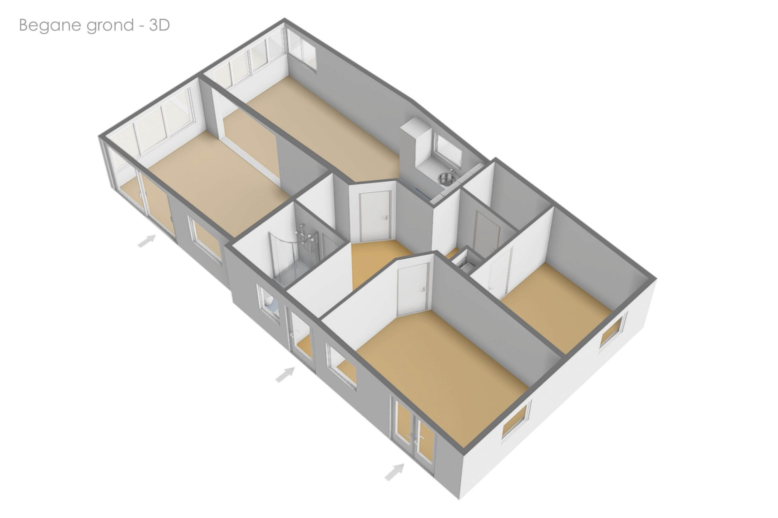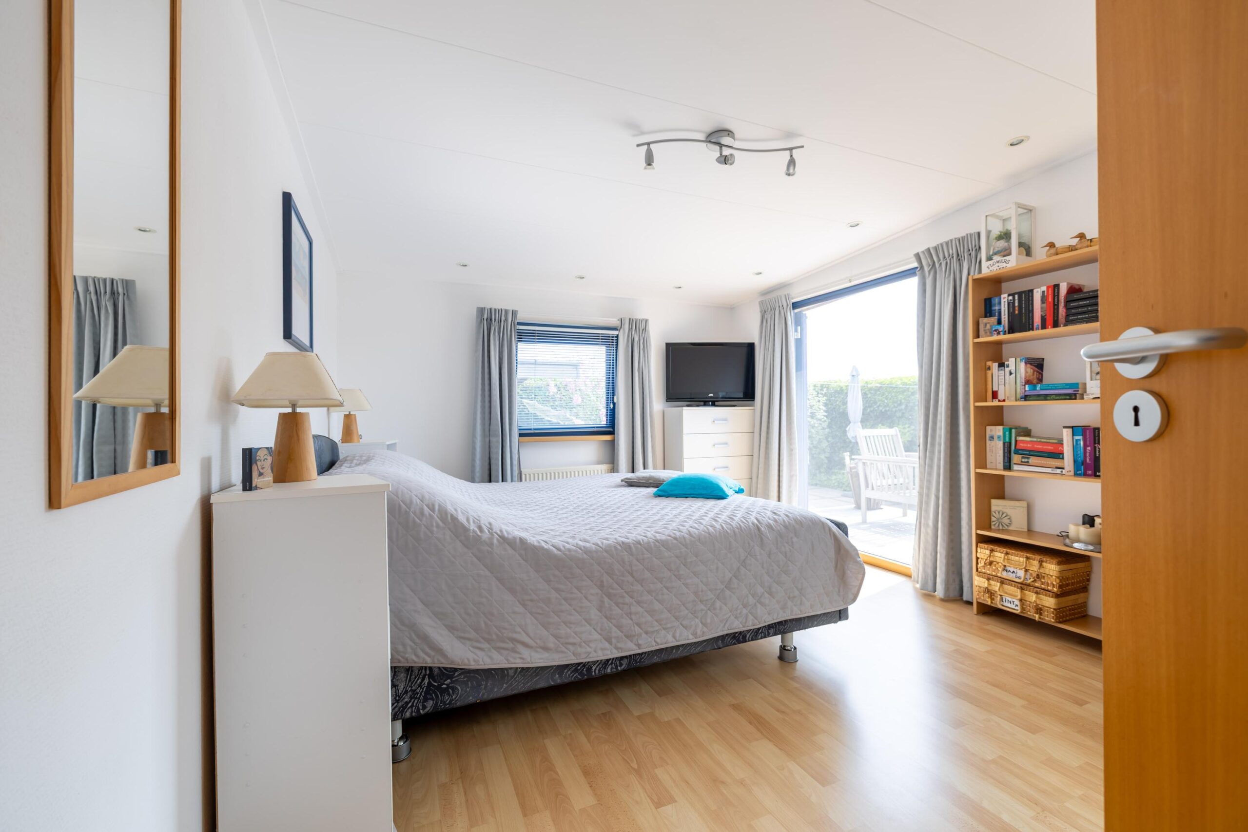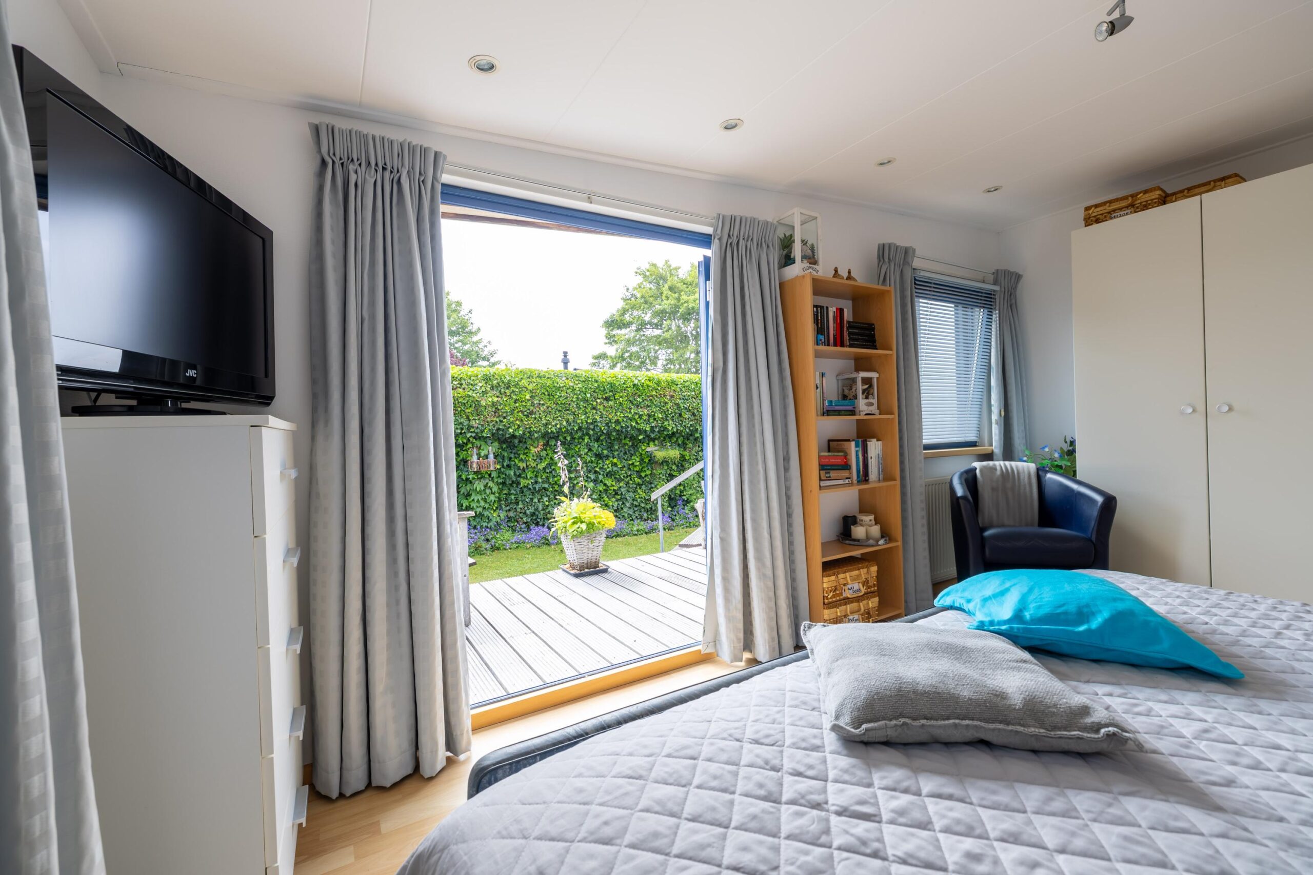 De woning beschikt over twee slaapkamers, waarvan één slaapkamer is uitgerust met openslaande deuren naar de tuin. De badkamer is voorzien van een douche, toilet en een wastafel.