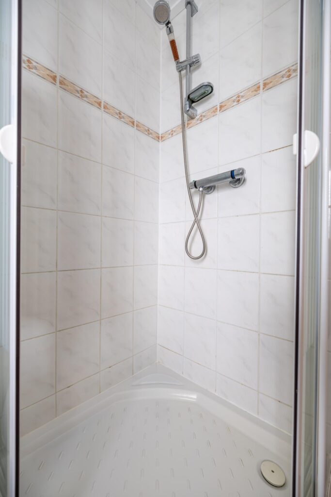 The house has two bedrooms, one of which is equipped with patio doors to the garden. The bathroom has a shower, toilet and a sink.
