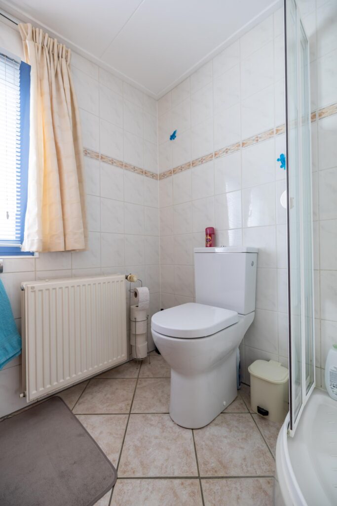 Das Haus verfügt über zwei Schlafzimmer, eines davon mit Terrassentüren zum Garten. Das Badezimmer verfügt über eine Dusche, ein WC und ein Waschbecken.