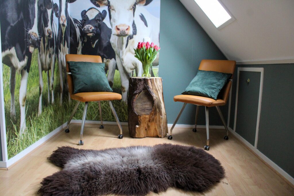 Centraal in het gebouw bevindt zich een sfeervolle overdekte binnentuin: een lichte en beschutte ontmoetingsruimte met keukenblok, die zich uitstekend leent voor ontspannen, spel of informeel overleg. Deze ruimte vormt het warme en verbindende hart van de boerderij.