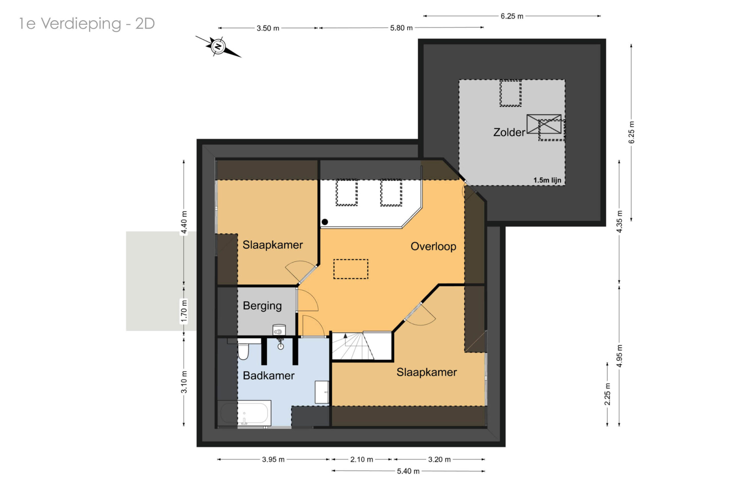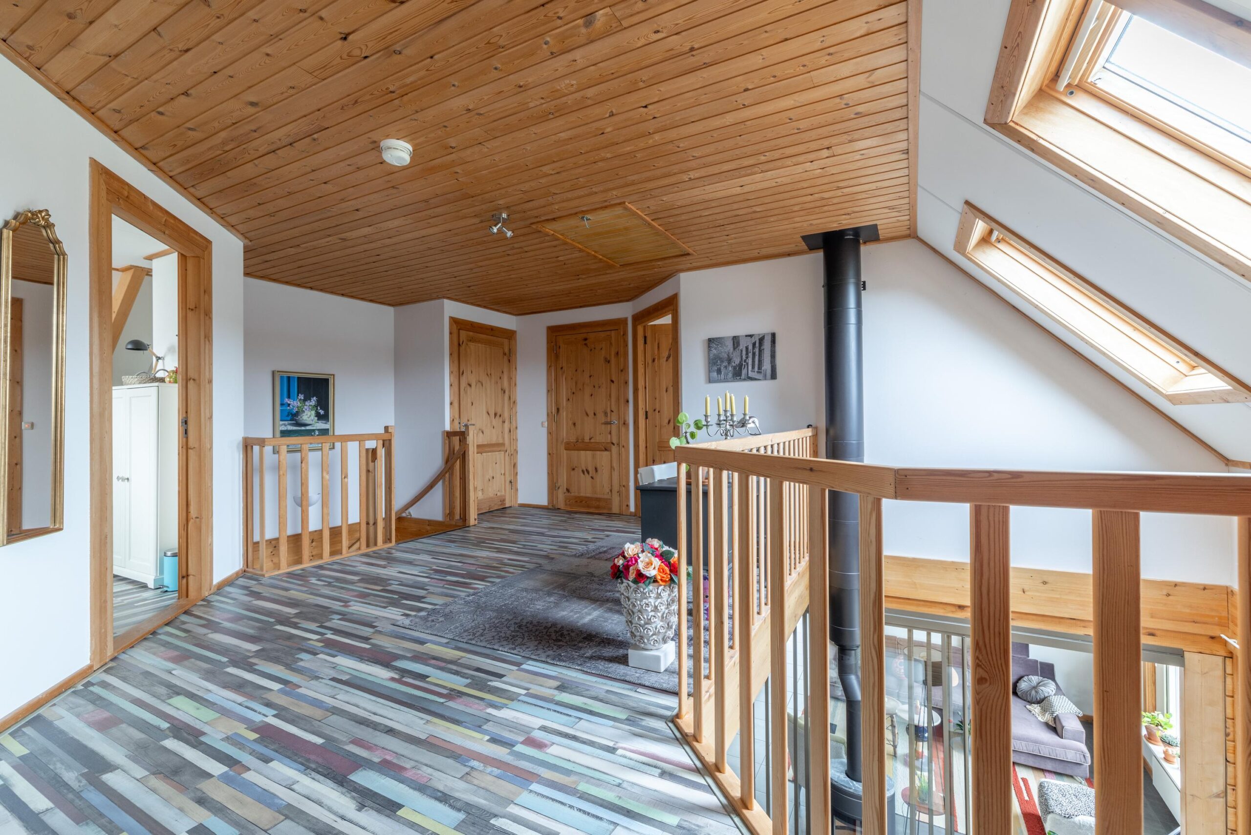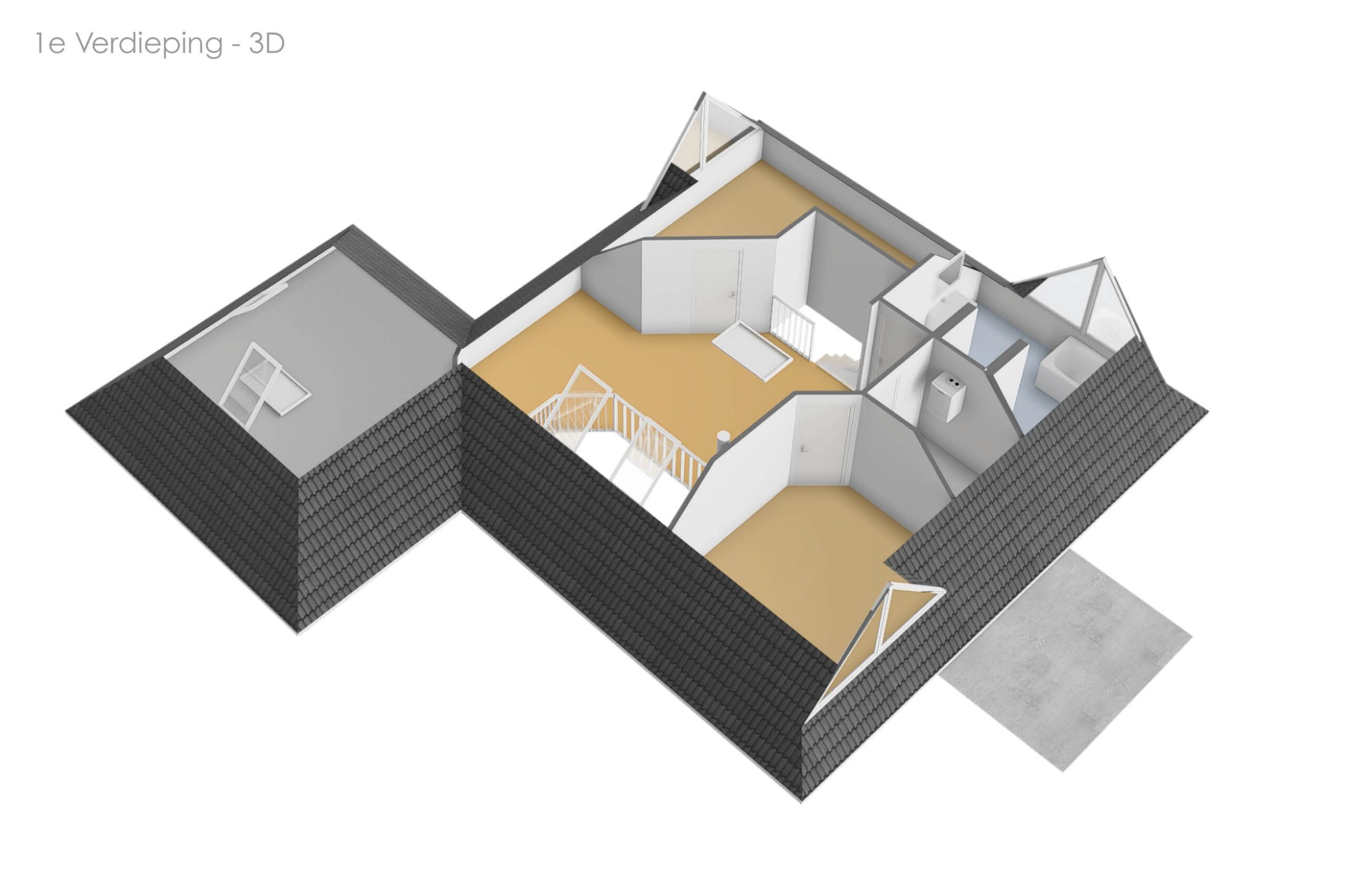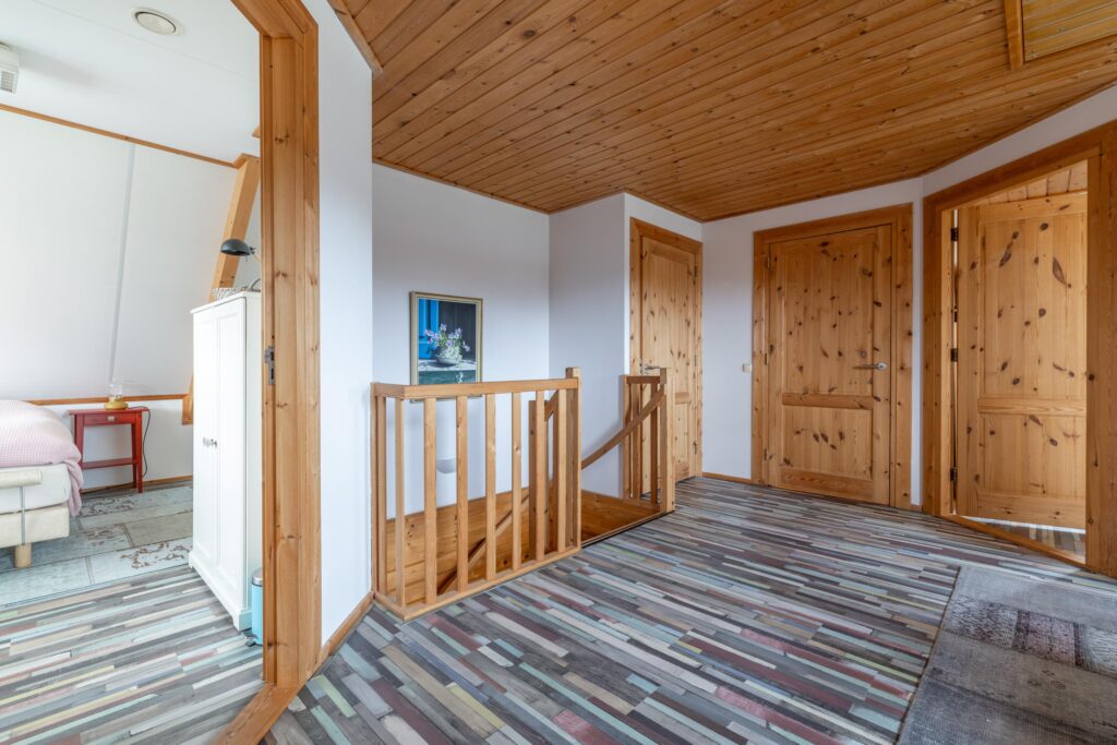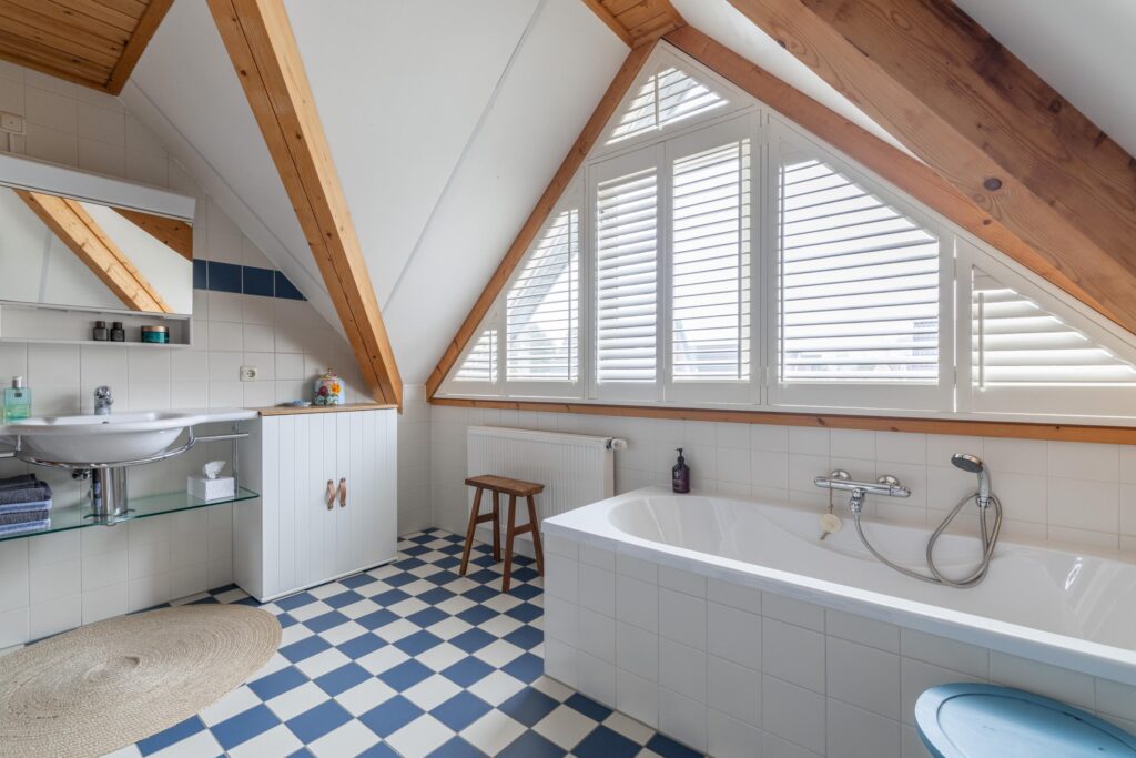 Op de eerste verdieping bevinden zich twee volwaardige slaapkamers en een ruime gezinsbadkamer met wastafel, douche, toilet en ligbad. De royale overloop met vide biedt mogelijkheden voor het realiseren van een werkplek of speelruimte. Daarnaast is er een separate berging met cv-opstelling en toegang tot een tweede bergzolder. Boven de garage bevindt zich een extra zolderruimte met daglichttoetreding, bereikbaar via zowel de overloop als de garage.