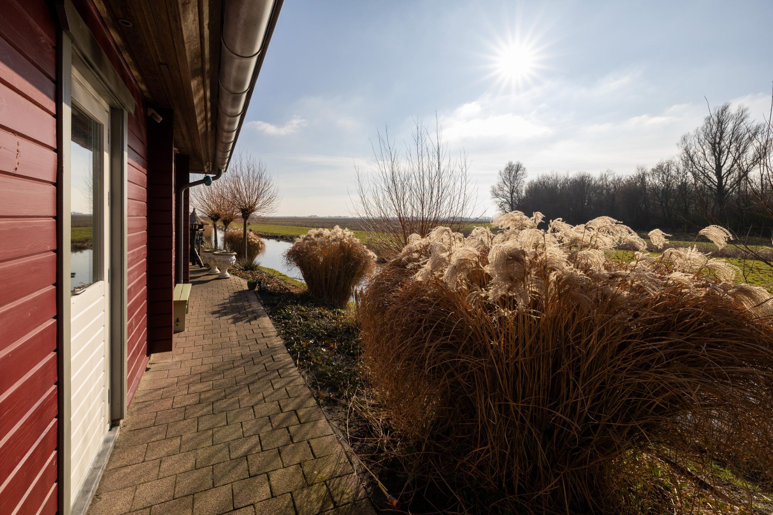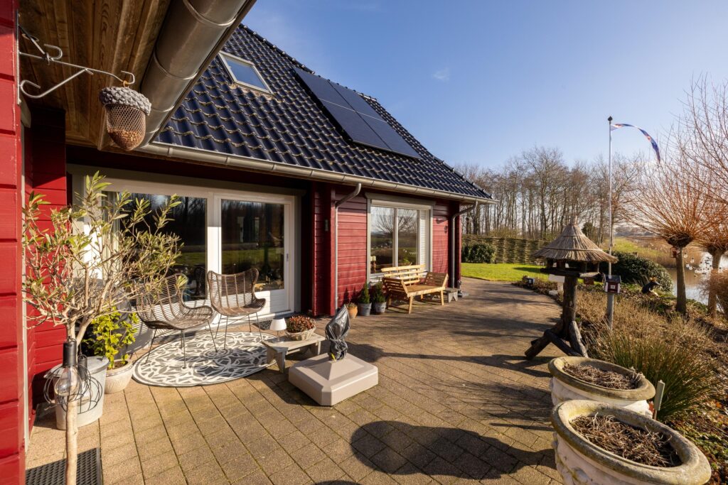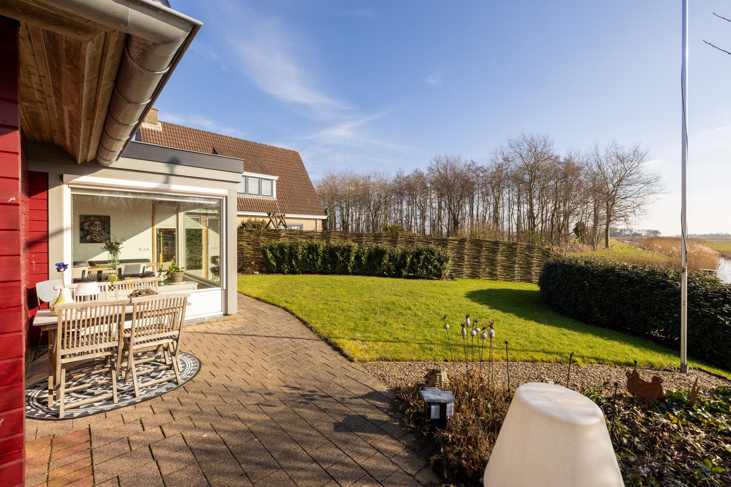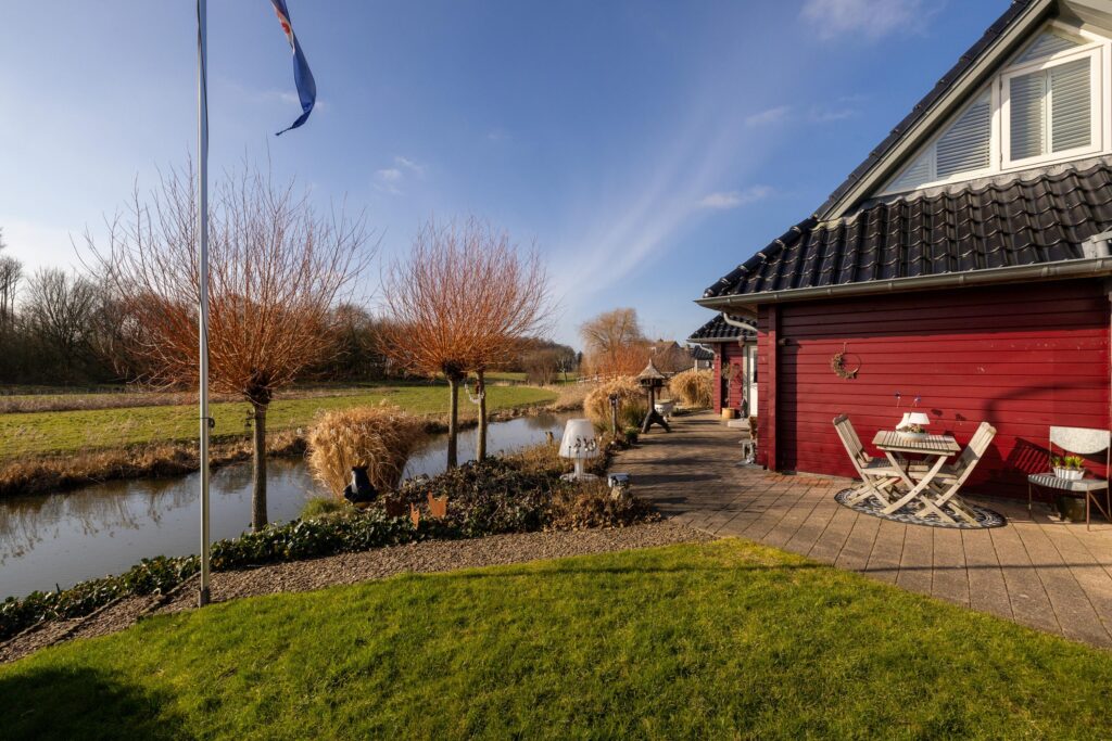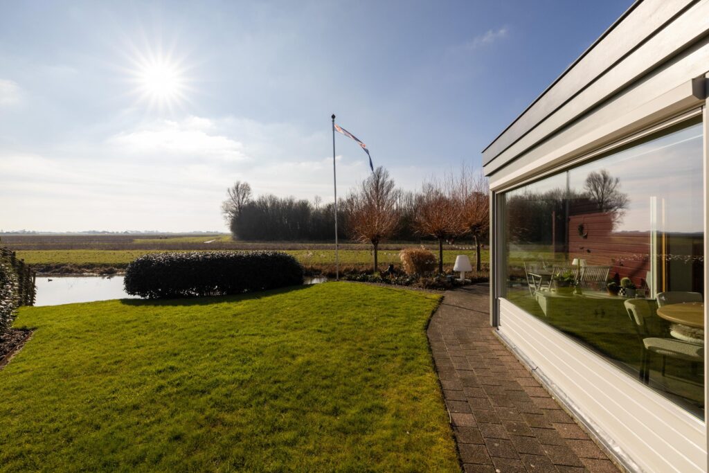 De zonnige tuin is op het zuiden gericht en biedt meerdere fijne zitplekken om van het weidse landschap te genieten. Een bijzonder element is de eigen steiger aan het water, waar het uitzicht optimaal beleefd kan worden. Dankzij de ligging en de opzet van het perceel ervaart u hier rust en ruimte.