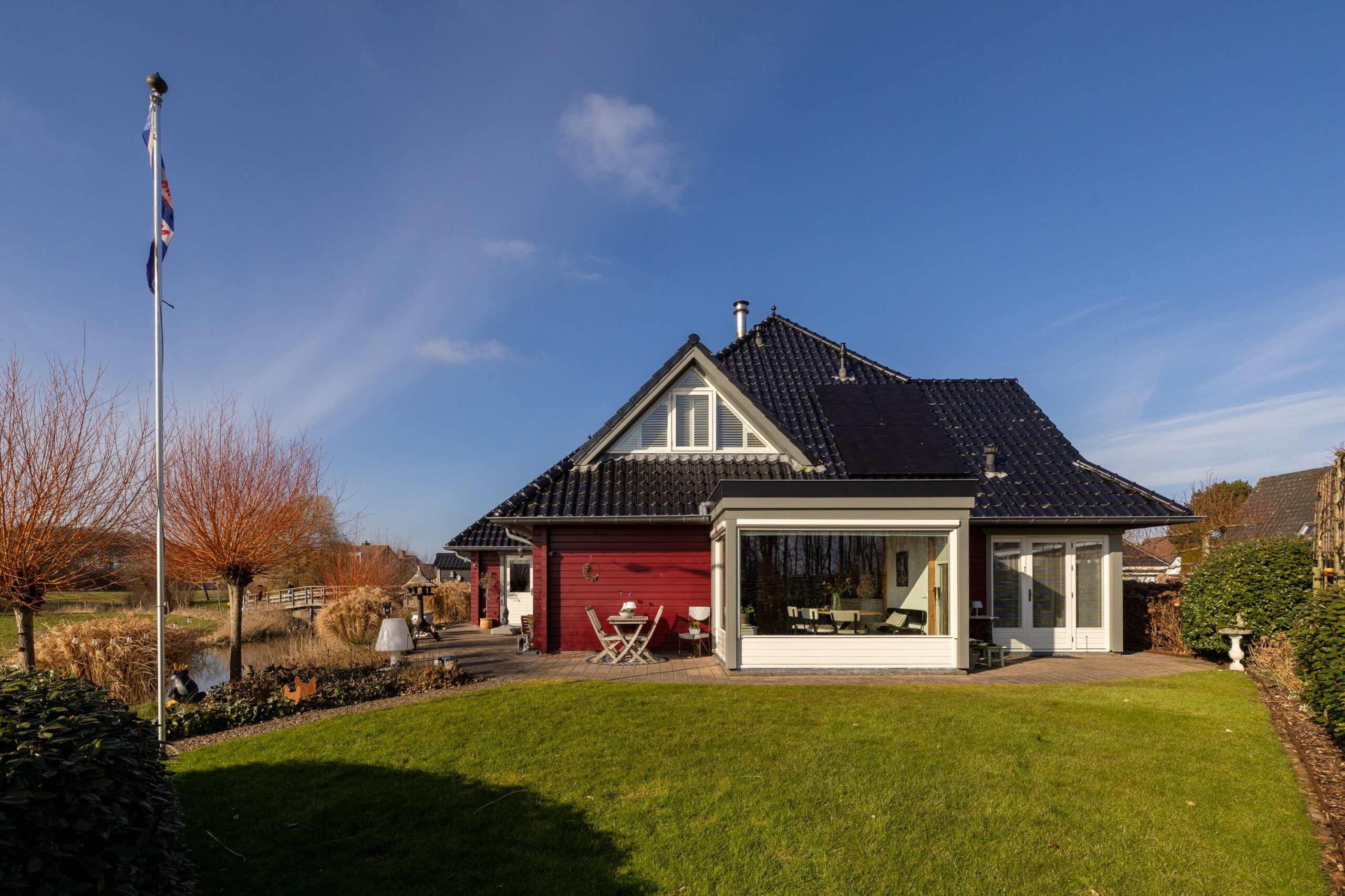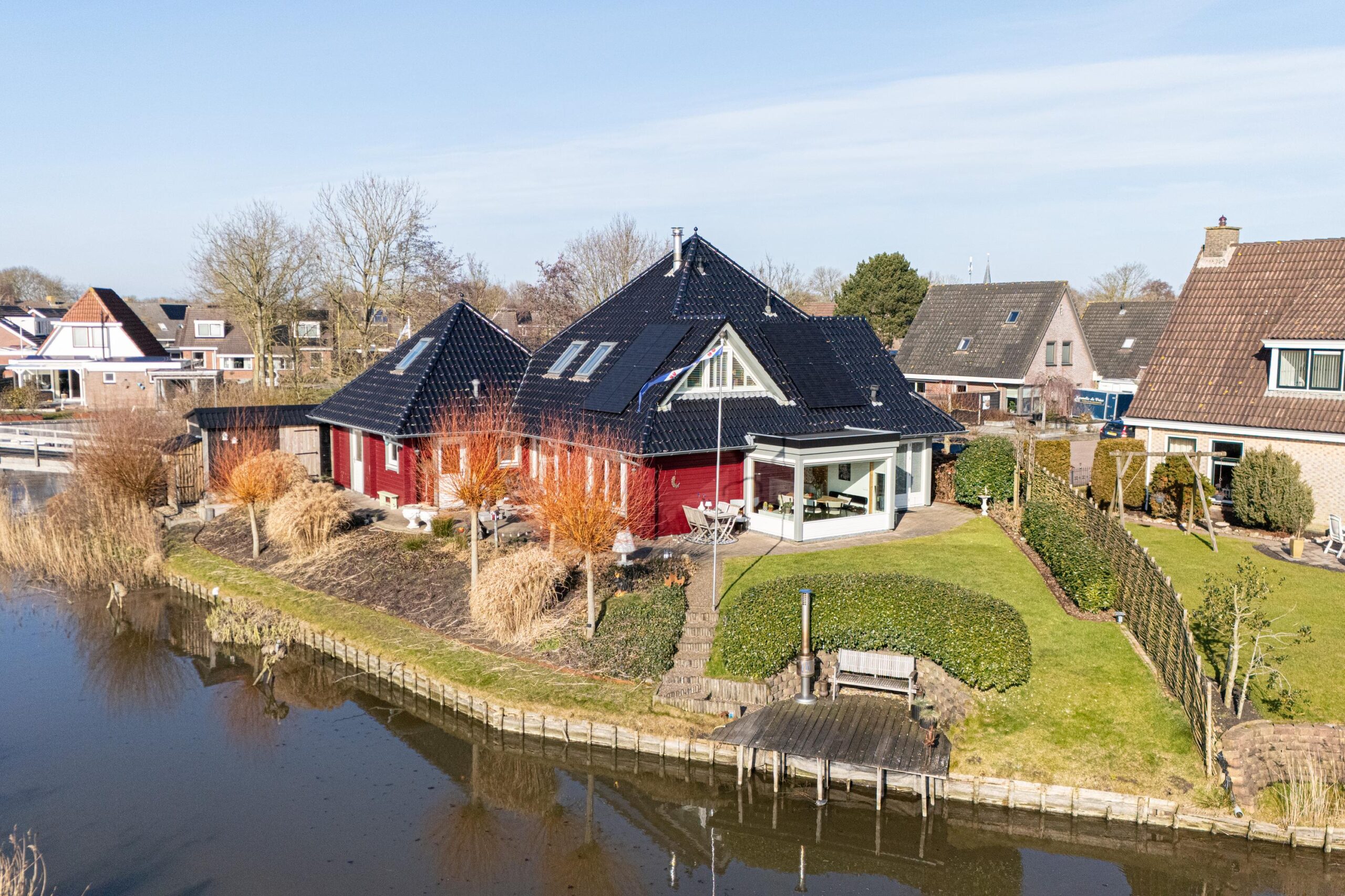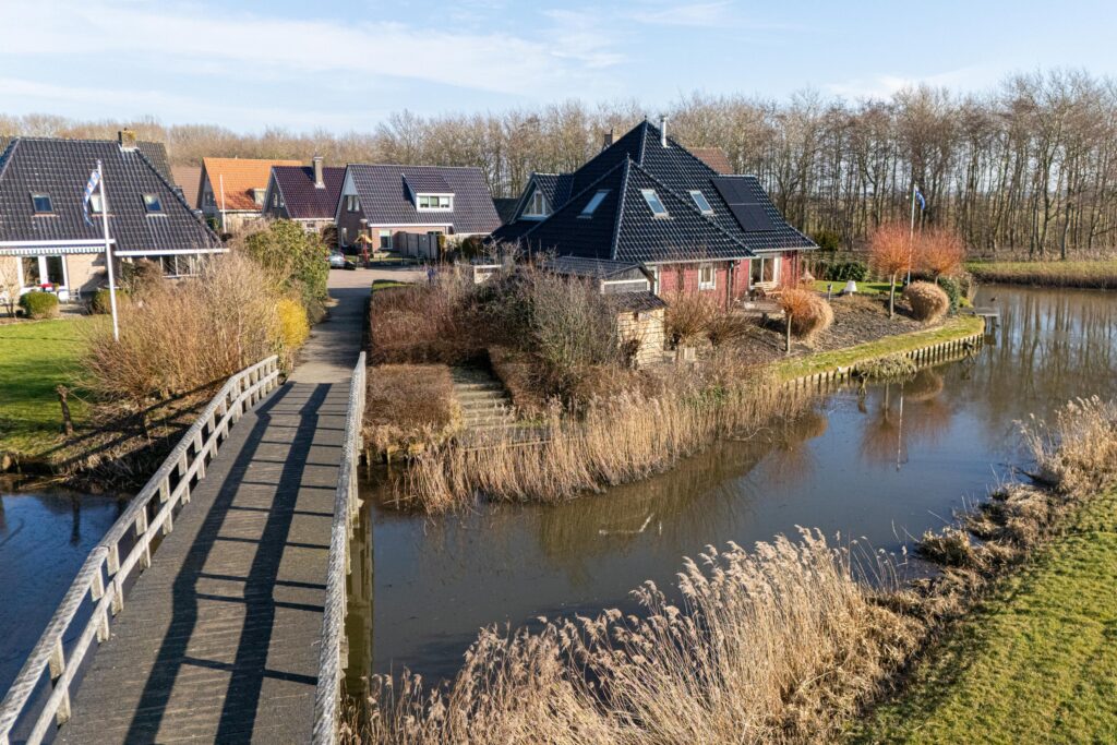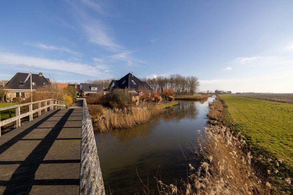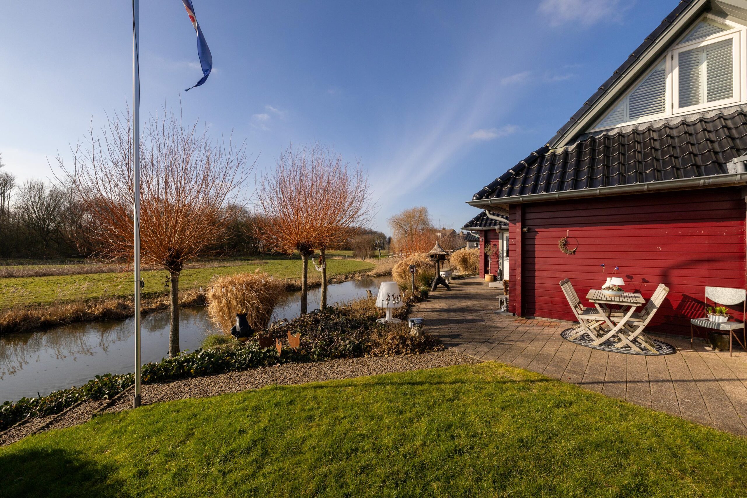 De zonnige tuin is op het zuiden gericht en biedt meerdere fijne zitplekken om van het weidse landschap te genieten. Een bijzonder element is de eigen steiger aan het water, waar het uitzicht optimaal beleefd kan worden. Dankzij de ligging en de opzet van het perceel ervaart u hier rust en ruimte.