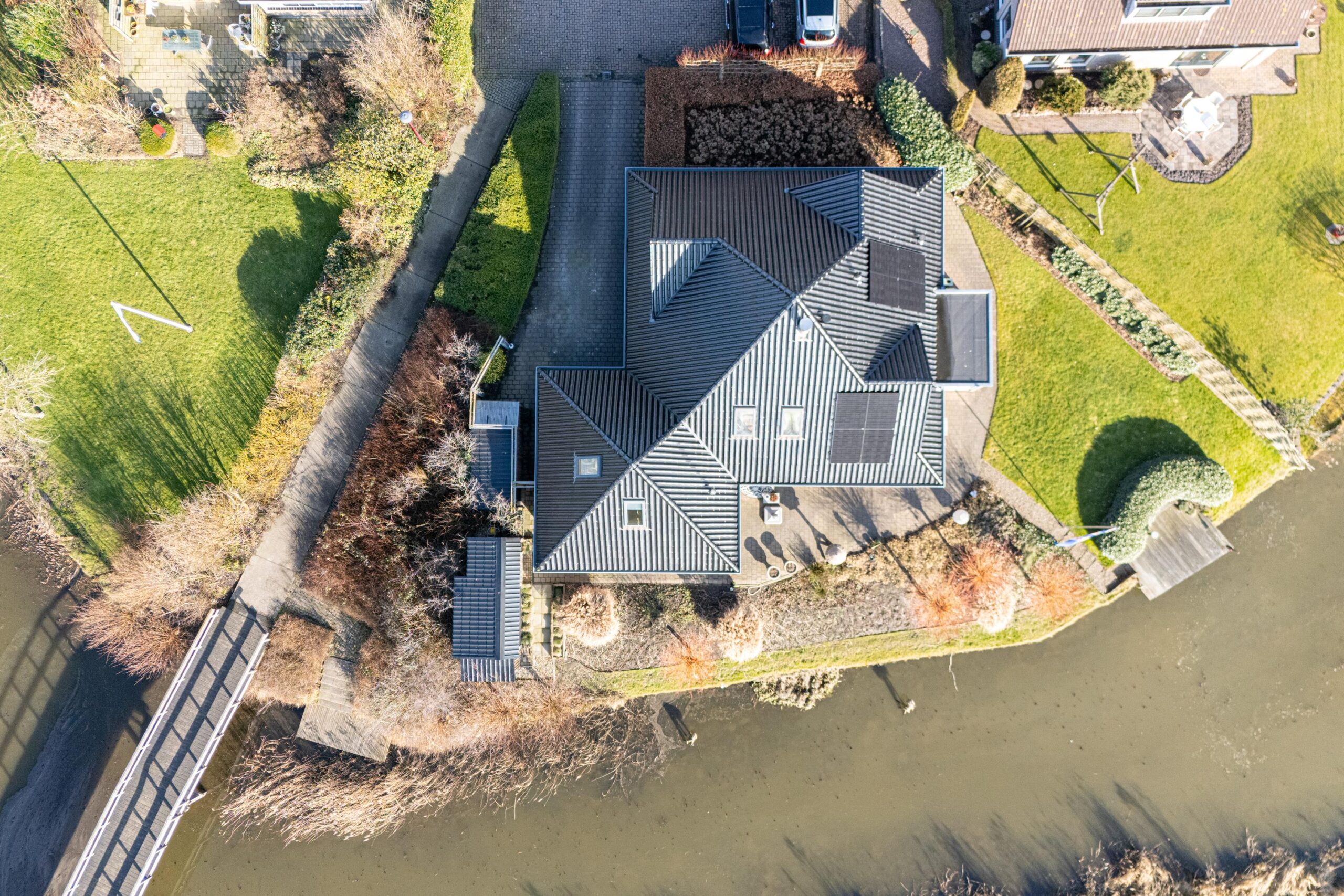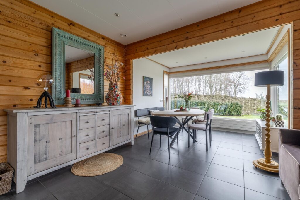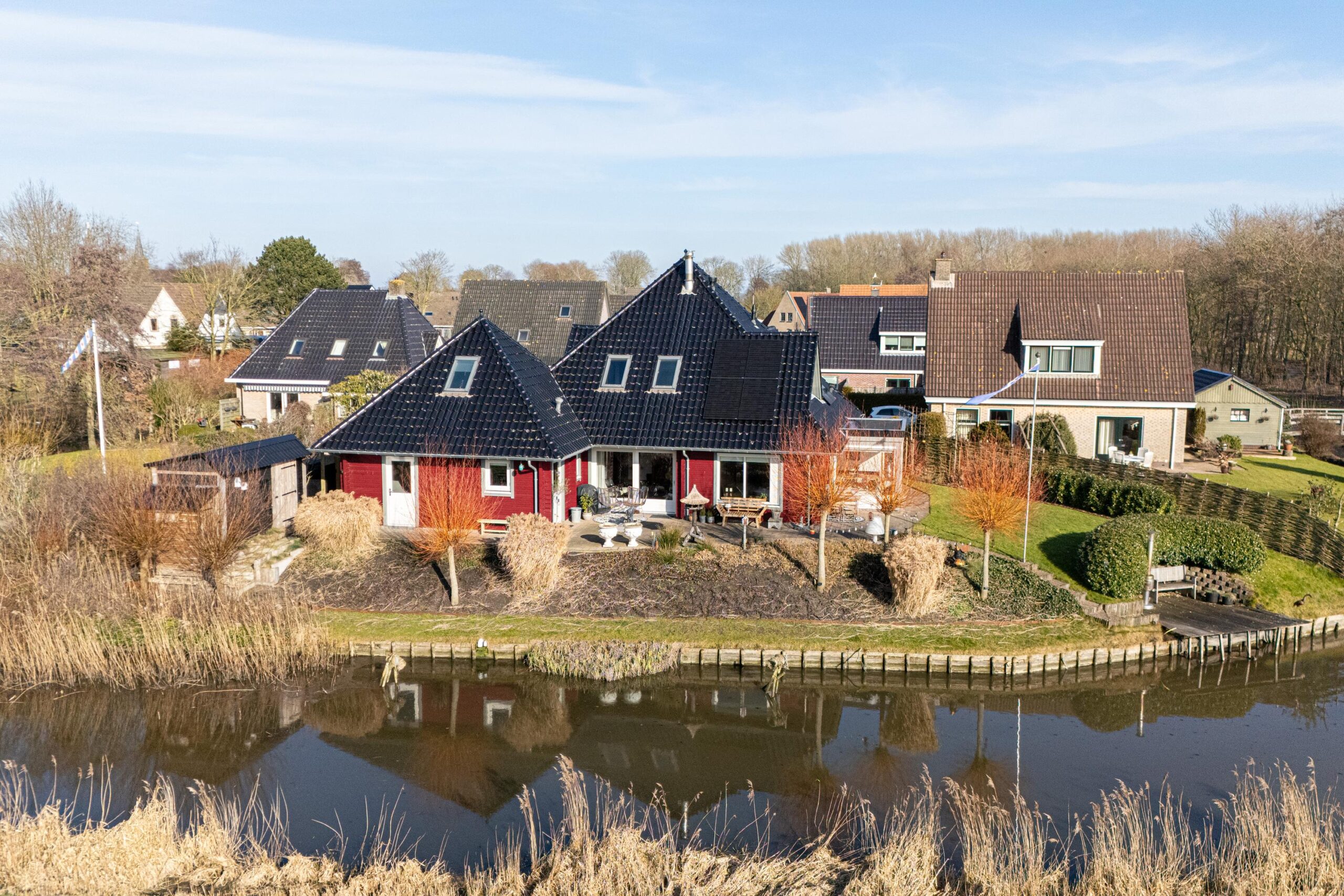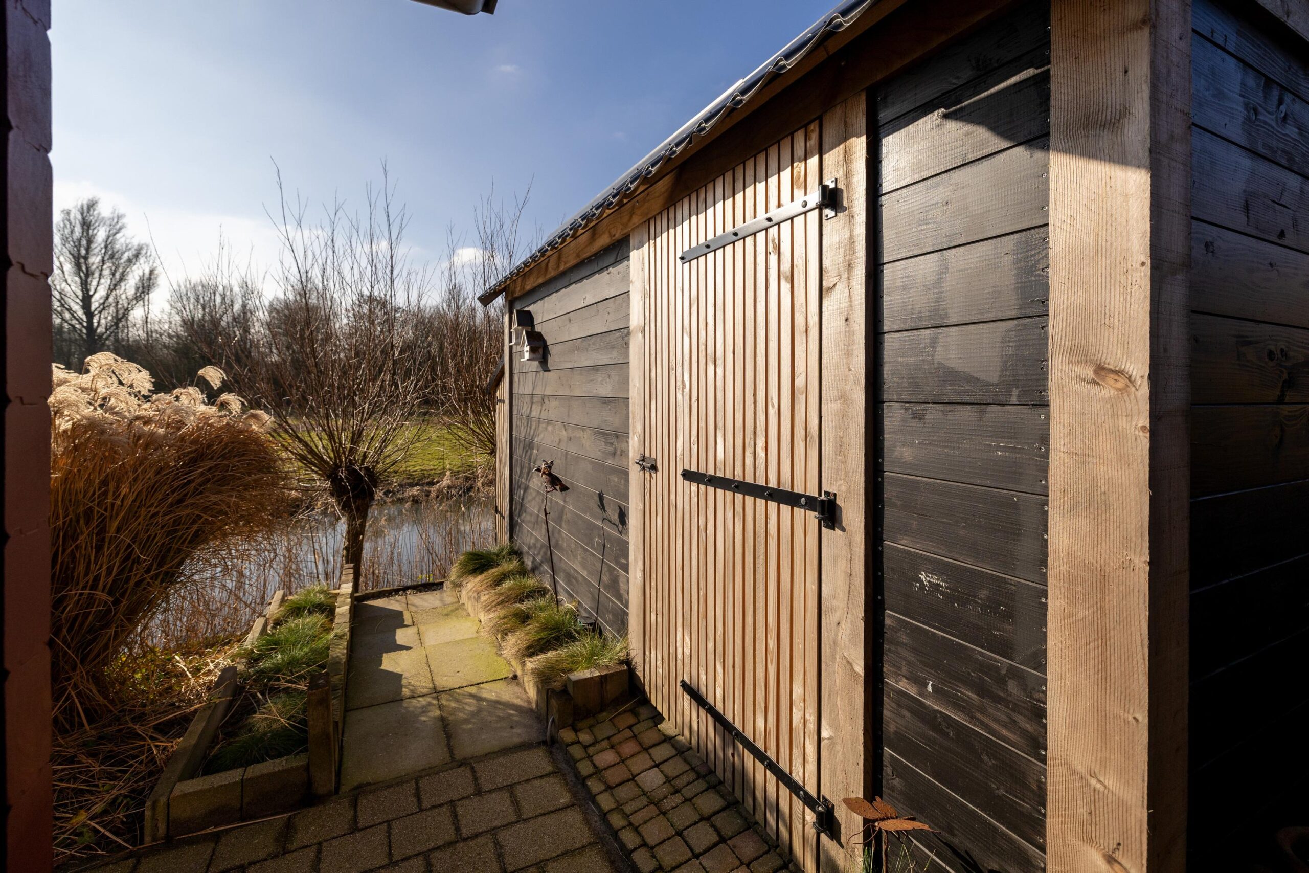 De zonnige tuin is op het zuiden gericht en biedt meerdere fijne zitplekken om van het weidse landschap te genieten. Een bijzonder element is de eigen steiger aan het water, waar het uitzicht optimaal beleefd kan worden. Dankzij de ligging en de opzet van het perceel ervaart u hier rust en ruimte.