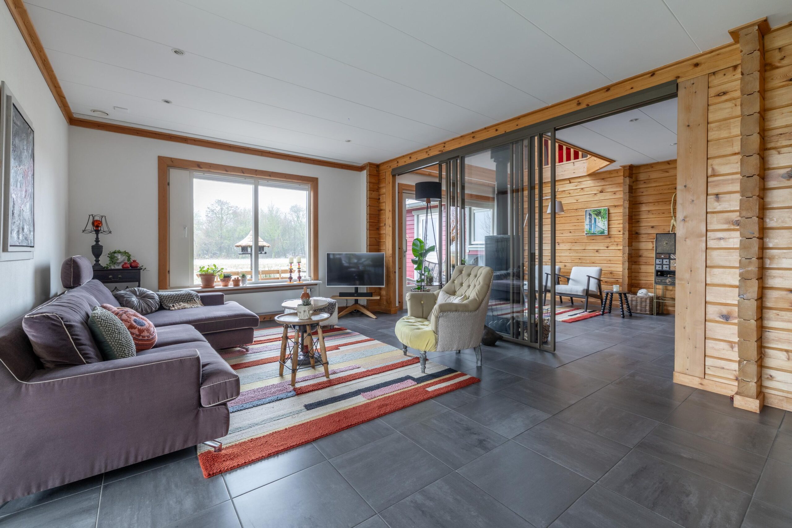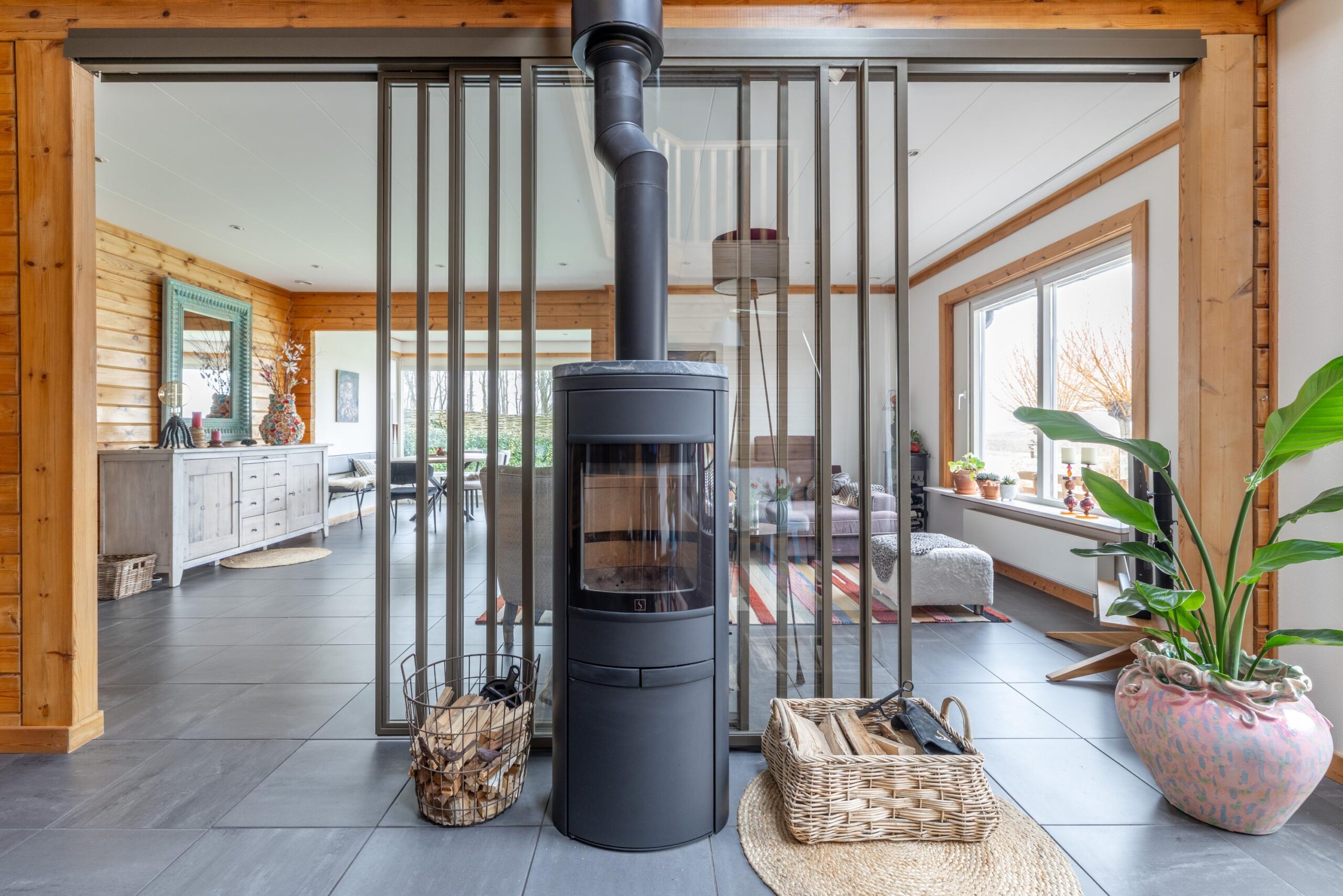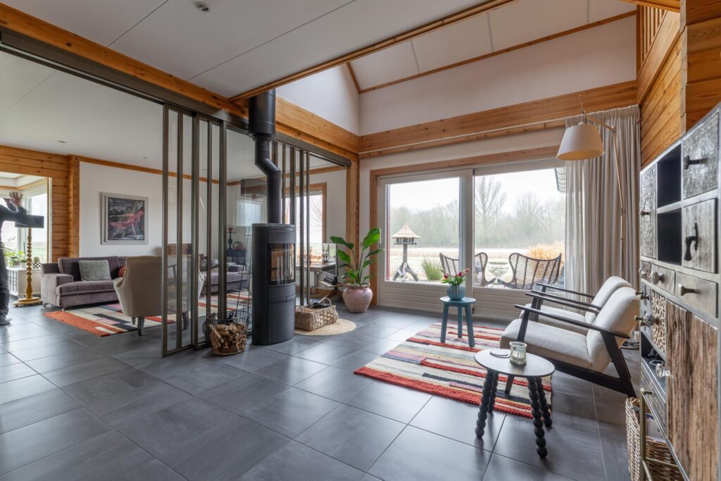 Sfeervolle woonkamer met houtkachel en twee zitgedeeltes;