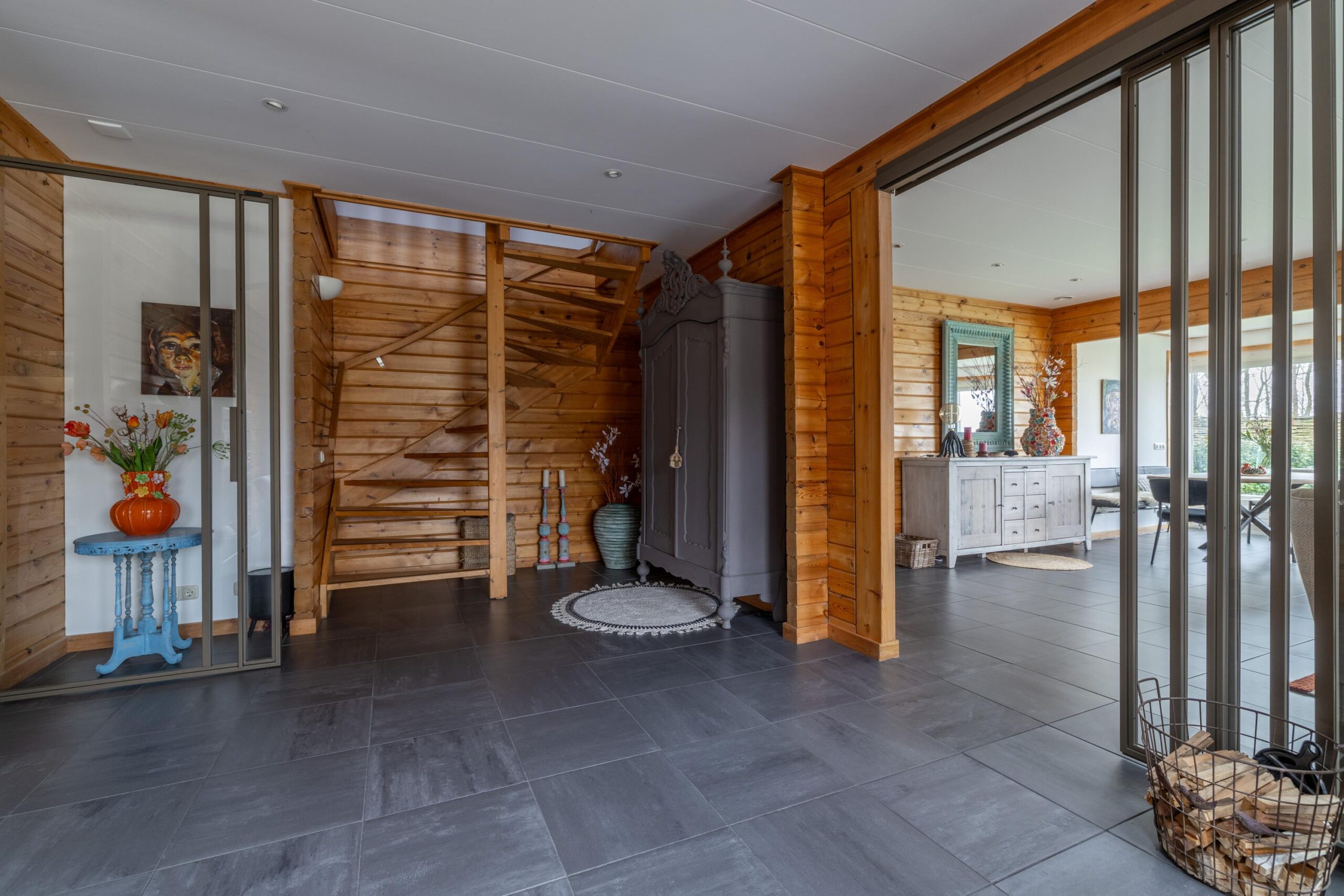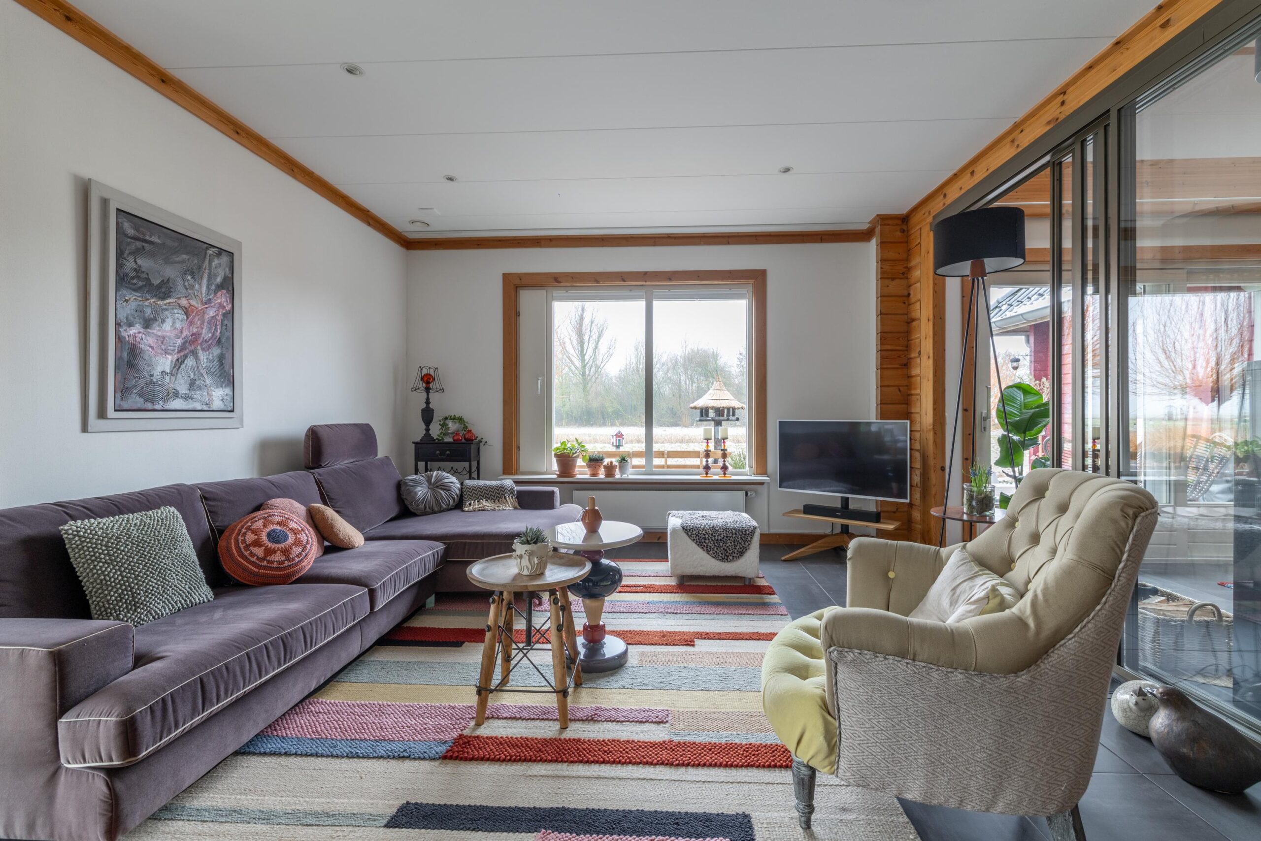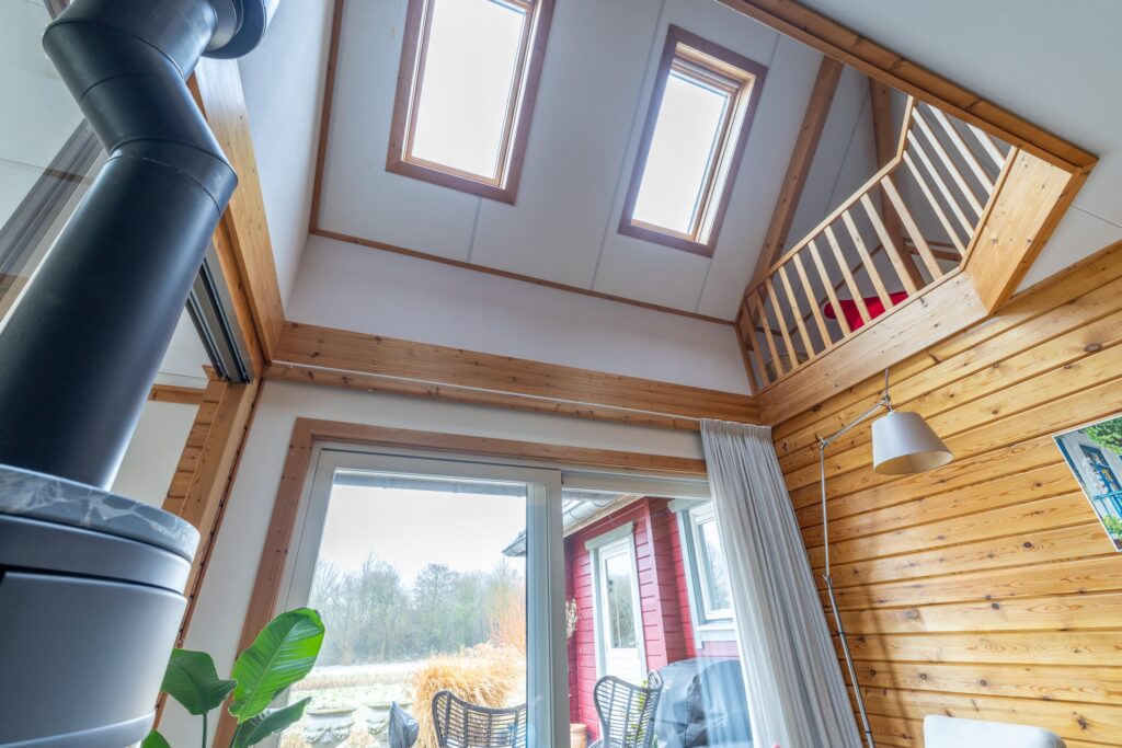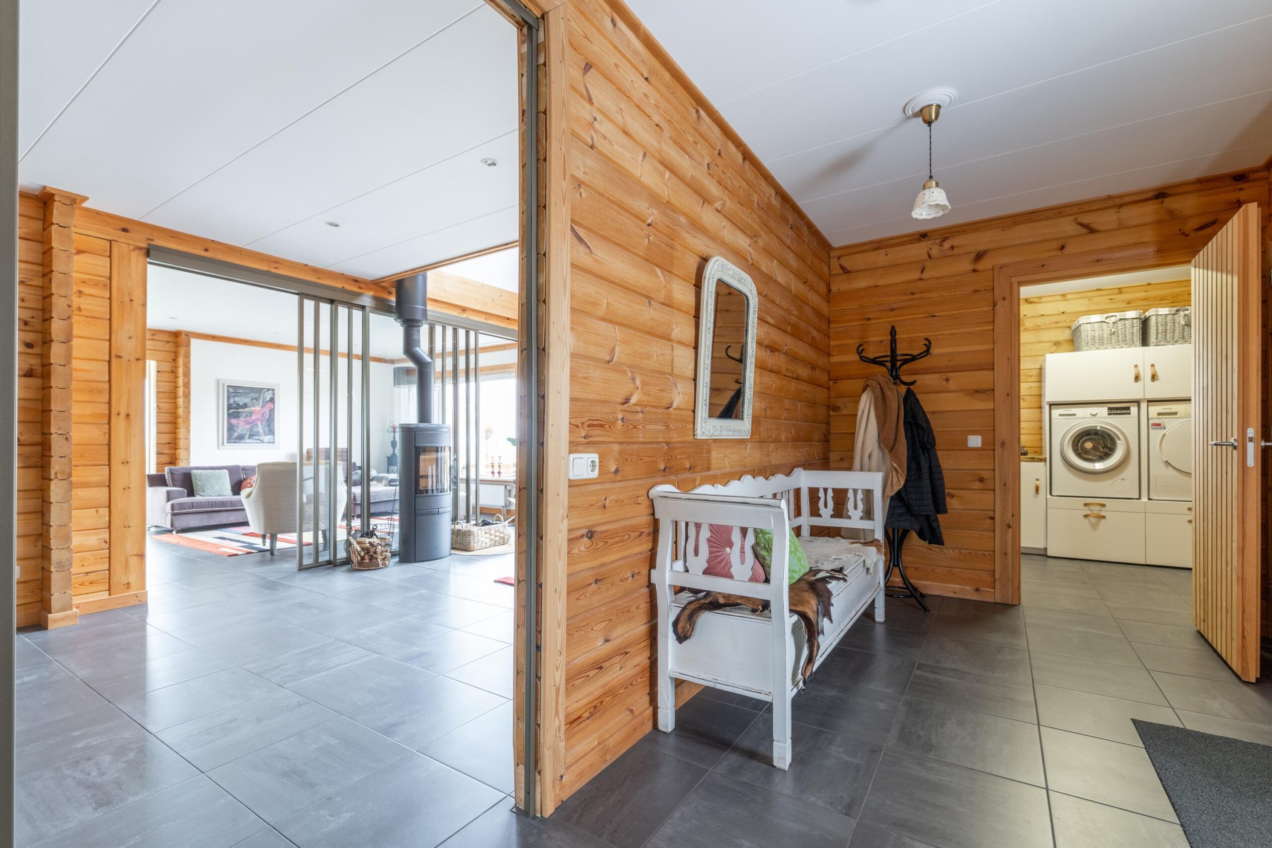 Sfeervolle woonkamer met houtkachel en twee zitgedeeltes;