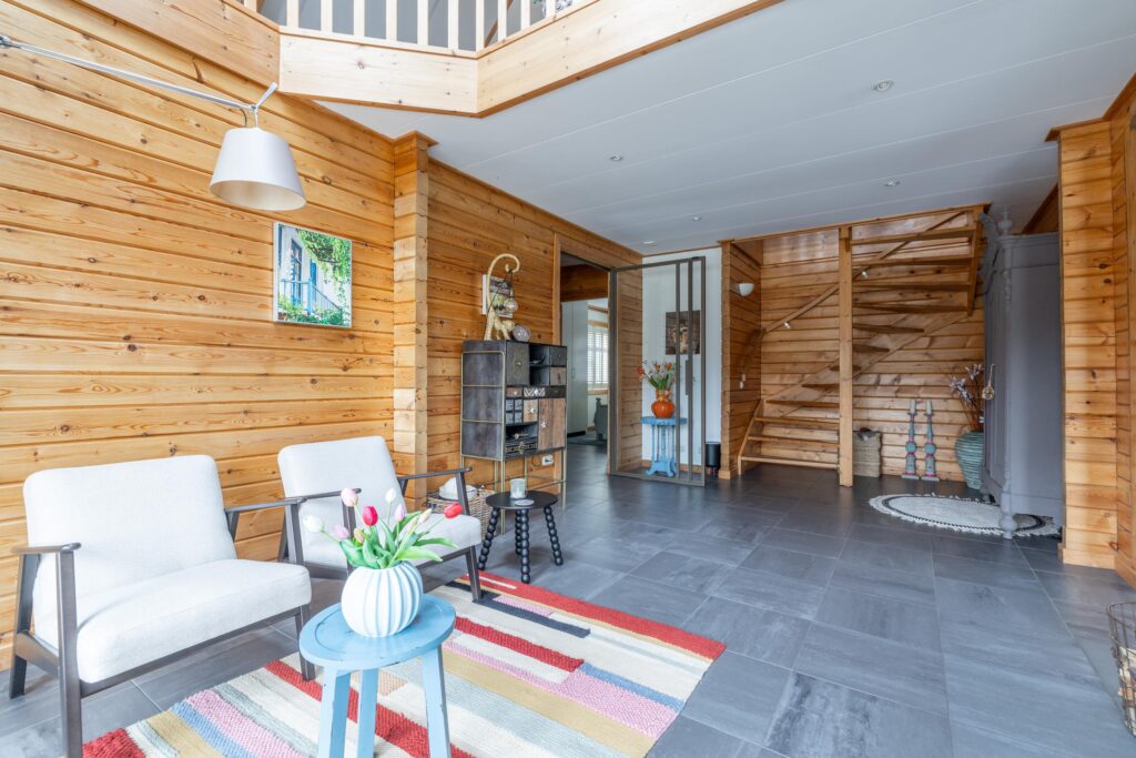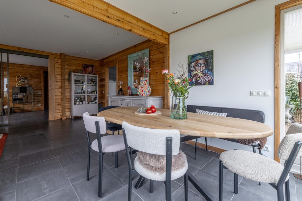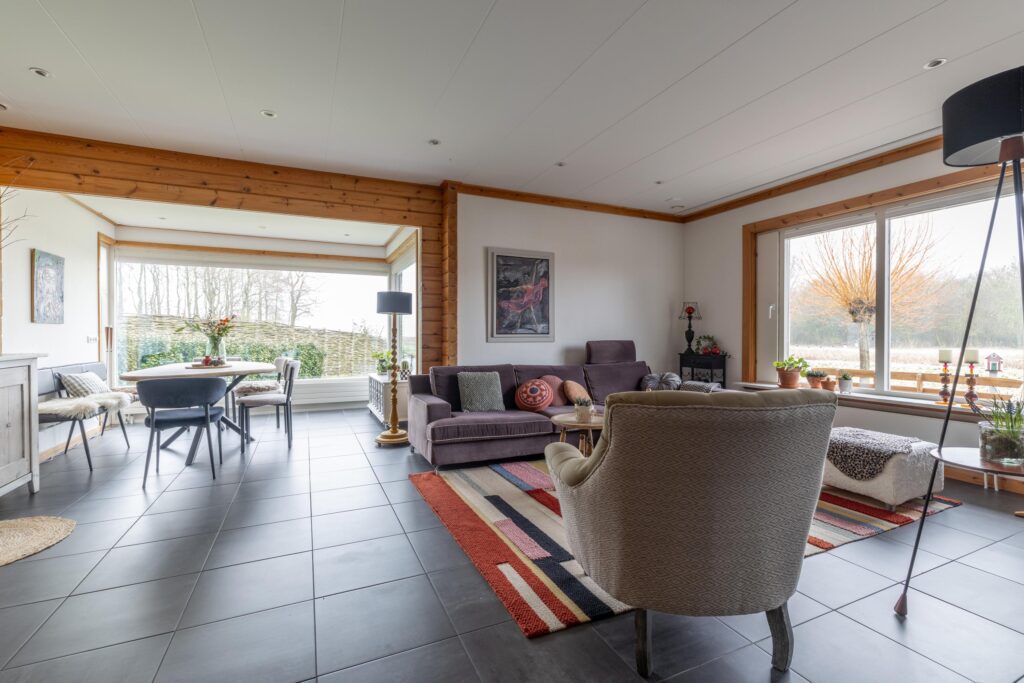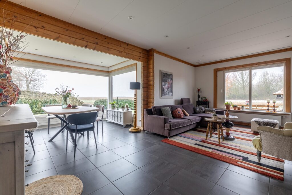 De woning is levensloopbestendig ingericht, met een slaapkamer en aangrenzende badkamer op de begane grond. De woonkamer is royaal opgezet en kenmerkt zich door een diepe erker, twee comfortabele zithoeken en een centraal geplaatste open haard die zorgt voor extra sfeer. Grote raampartijen en een schuifpui versterken het contact met de tuin en creëren een prettige overgang tussen binnen en buiten.