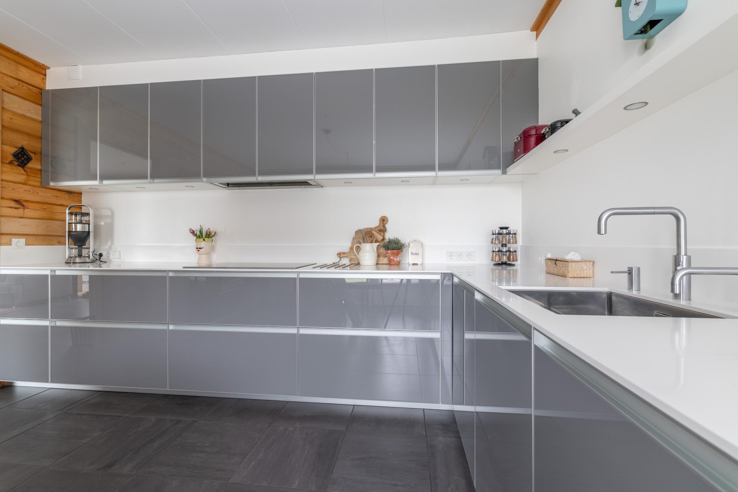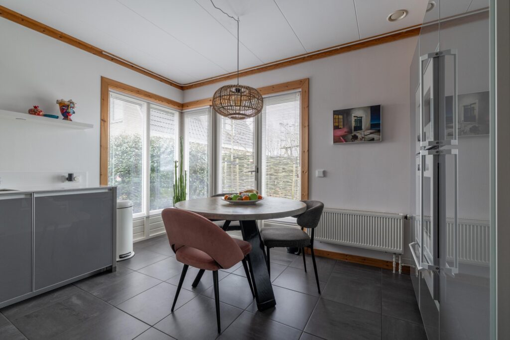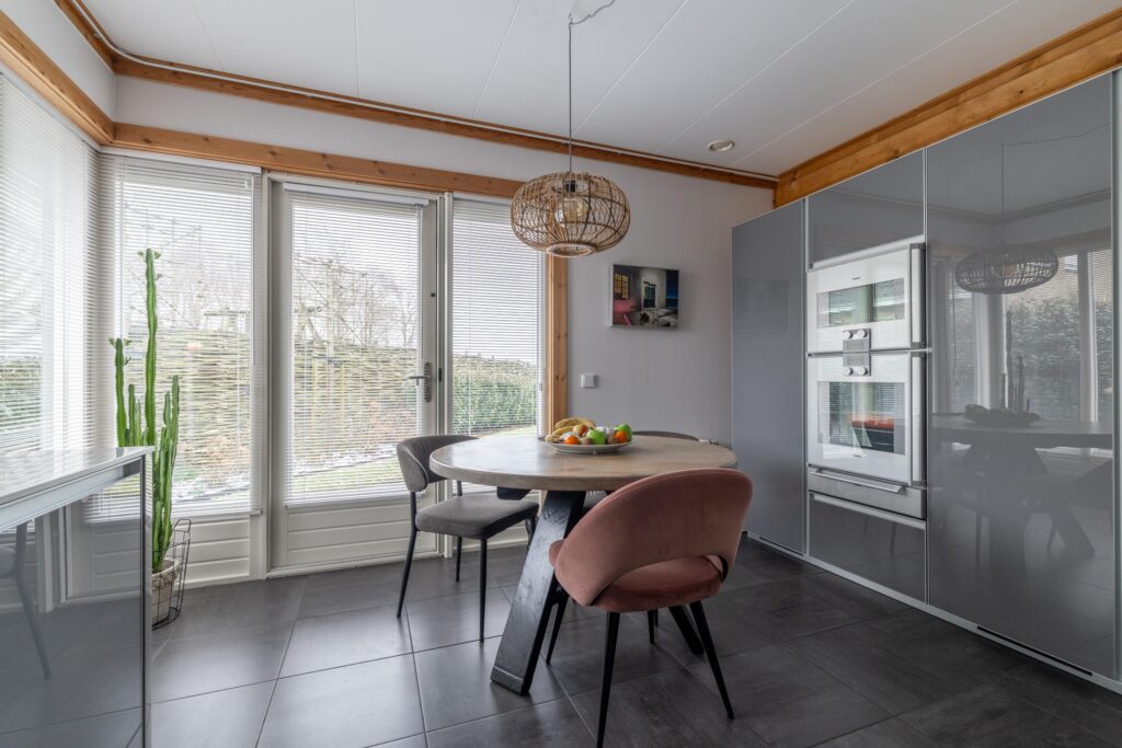 De ruime leefkeuken is uitgevoerd met hoogwaardige materialen en apparatuur. Zo beschikt deze over een Coriander werkblad, inbouwapparatuur van Gaggenau en een Quooker. Vanuit de keuken is er eveneens toegang tot de tuin. Praktisch is de inpandige, verwarmde garage met elektrische deur en doorgang naar de zolder. De gehele begane grond, met uitzondering van de garage, is voorzien van vloerverwarming.
