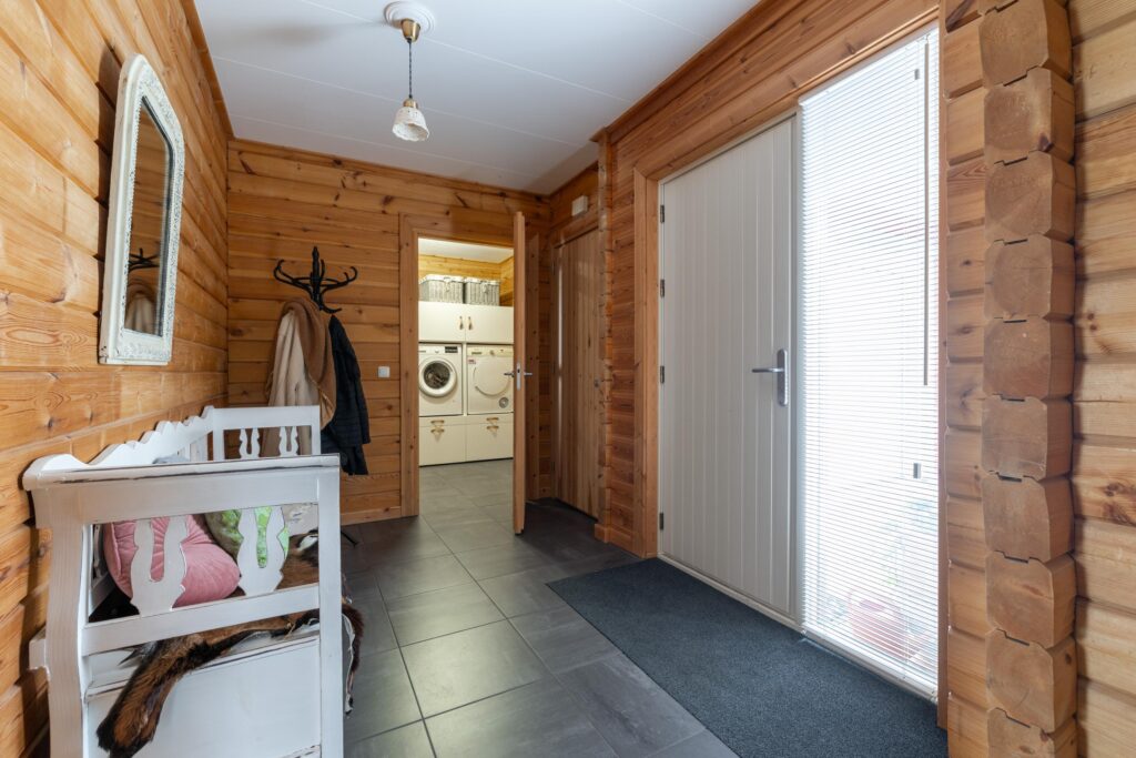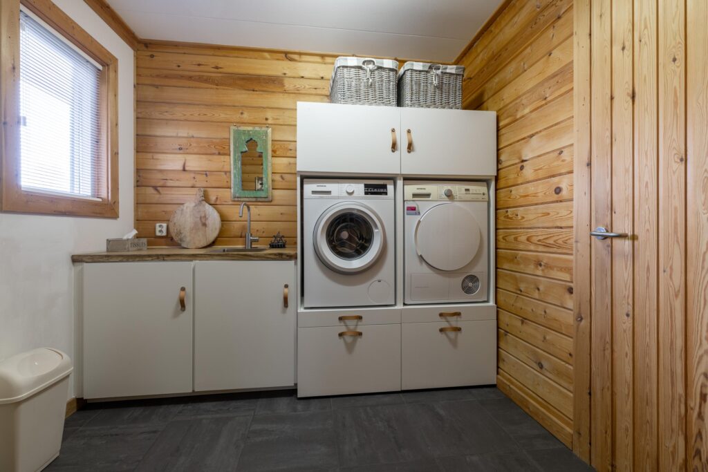 Bijkeuken met wastafel en koelkast en kast voor wasmachine en droger.