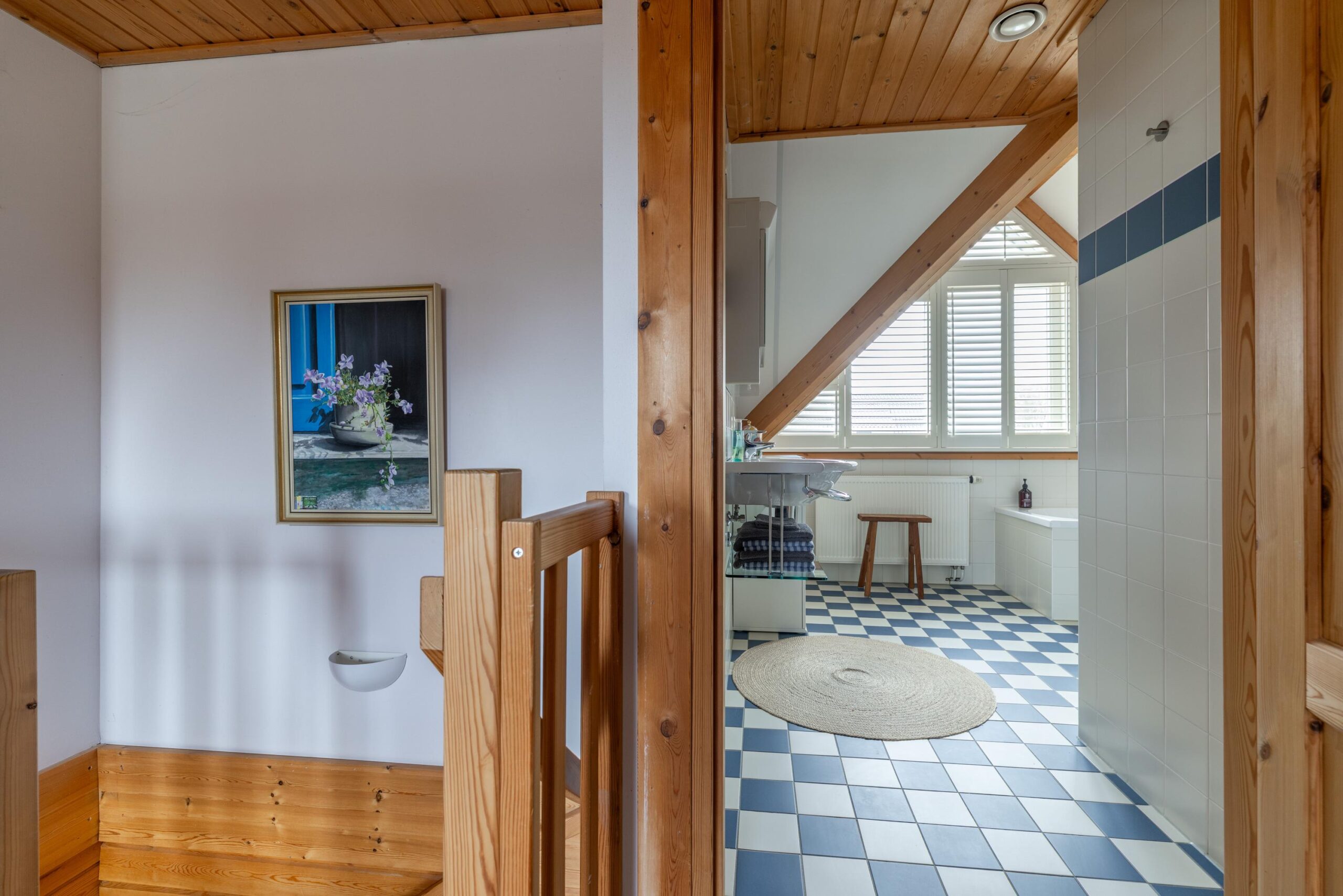 Eerste verdieping: ruime overloop met vide, twee slaapkamers, berging met cv-installatie, badkamer voorzien van wastafel, douche, toilet en ligbad.