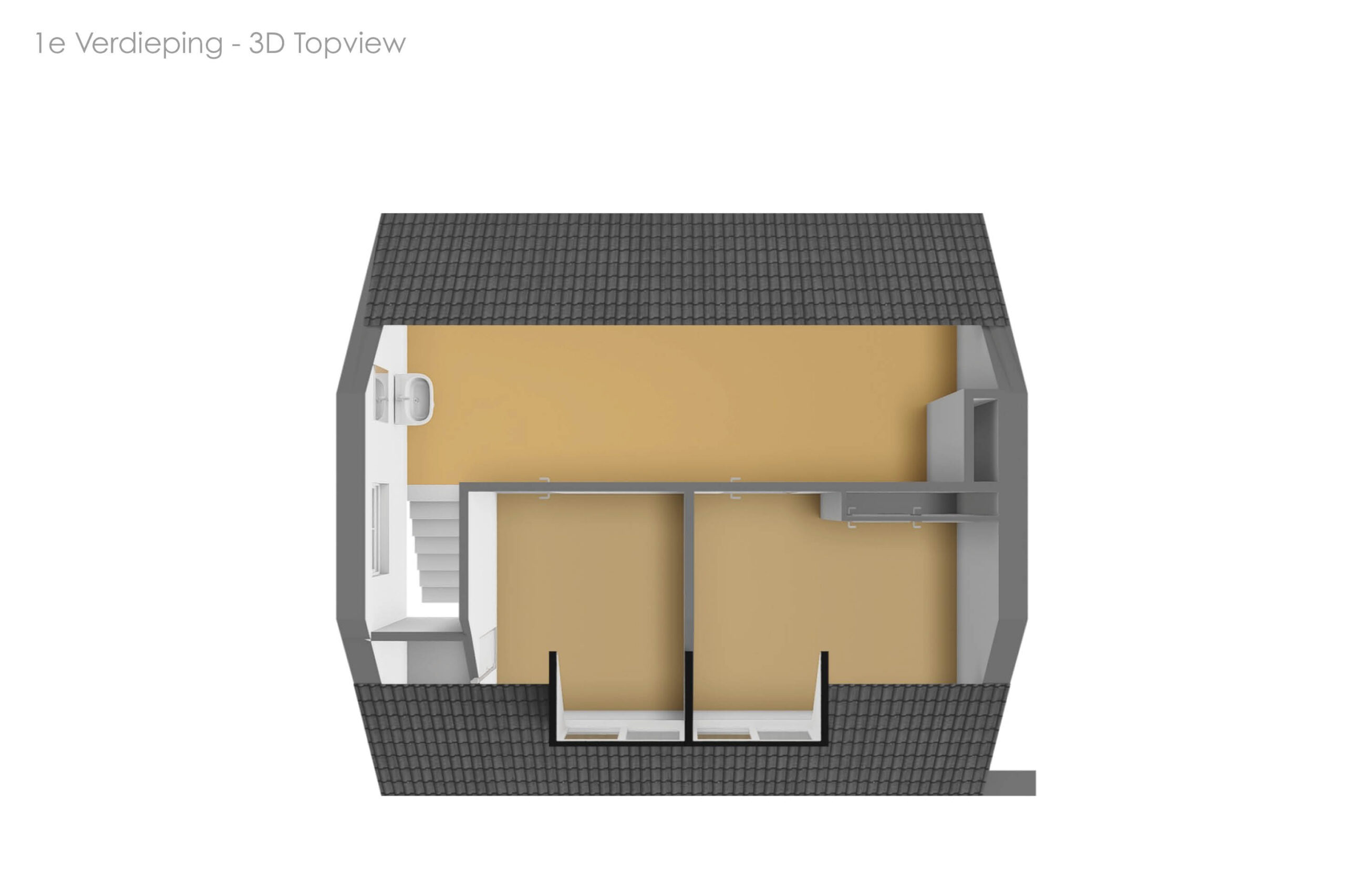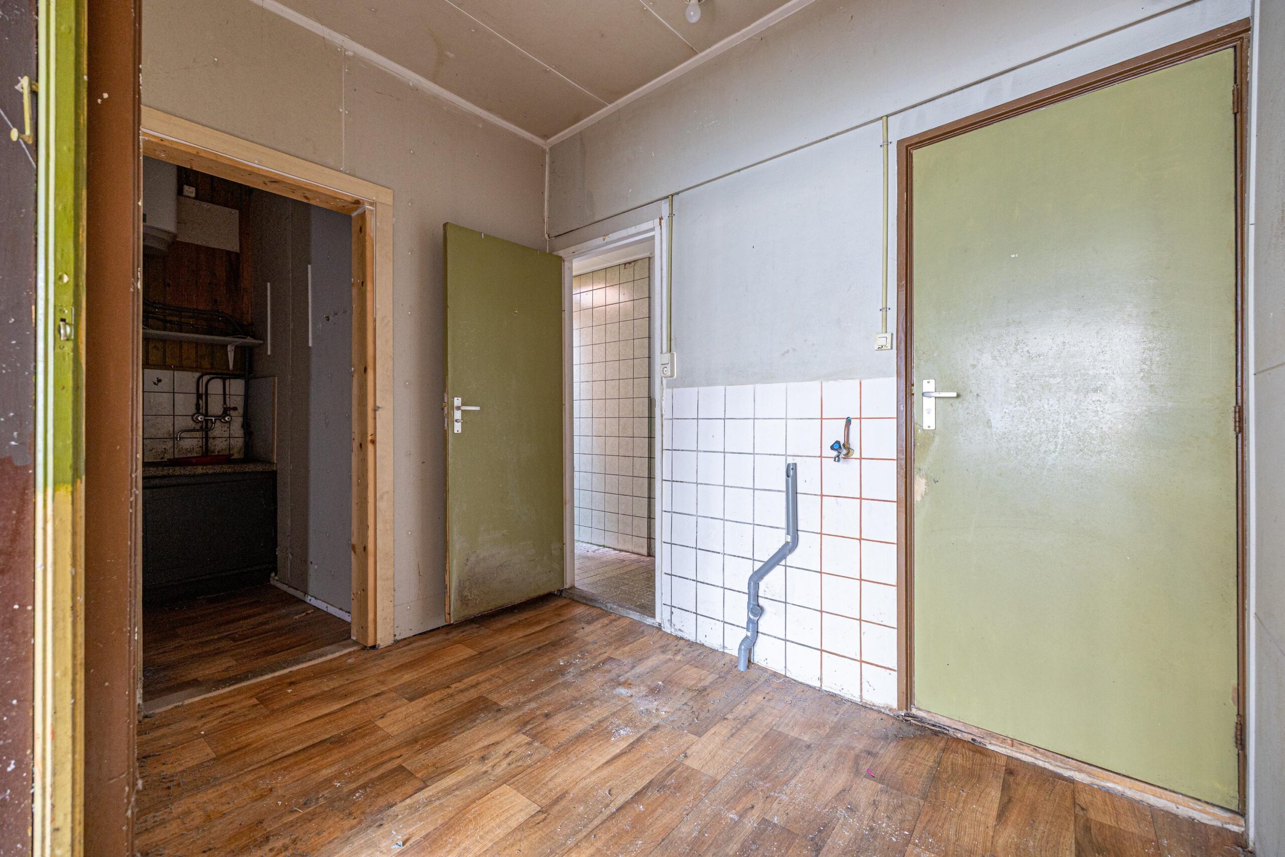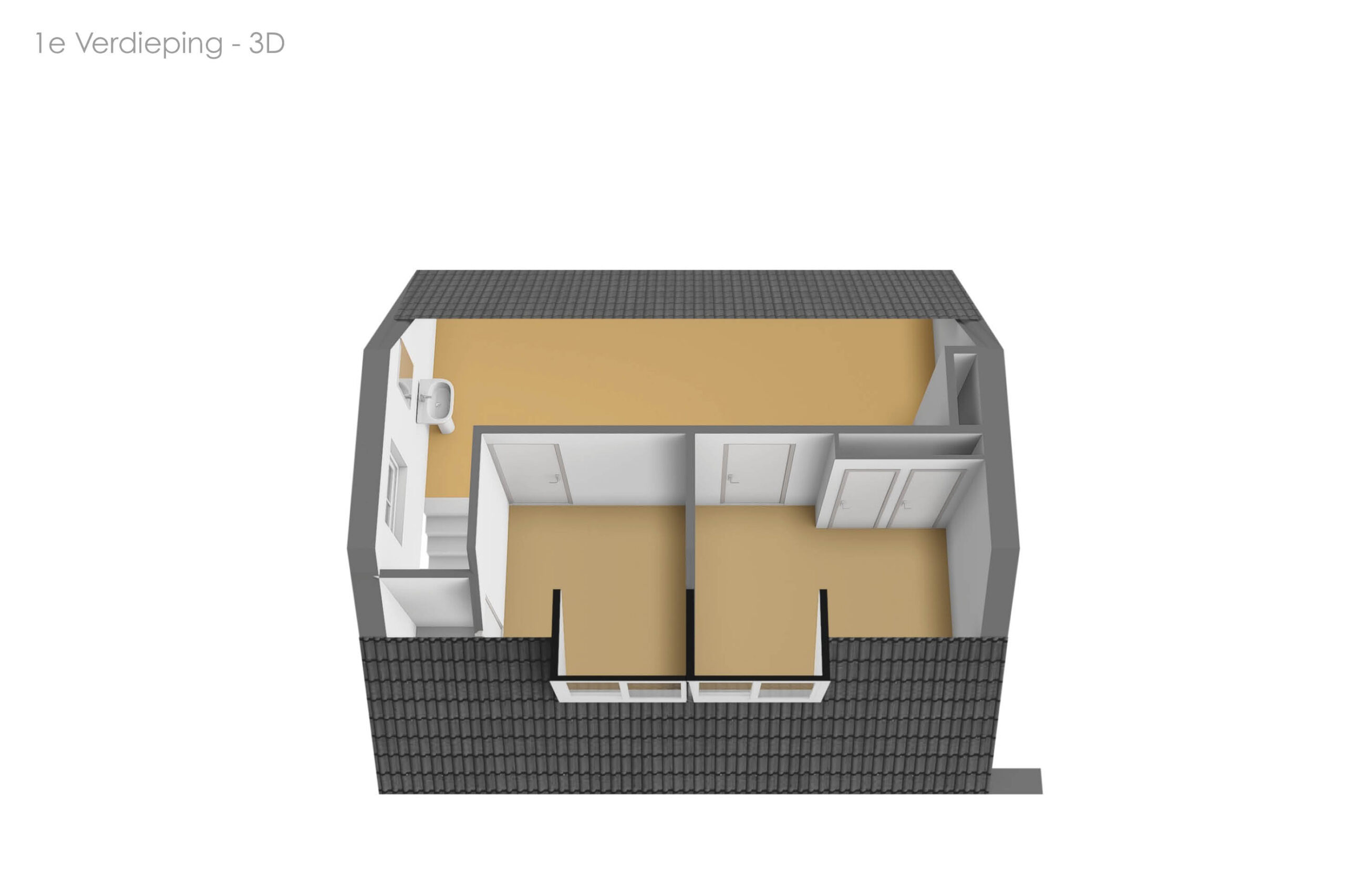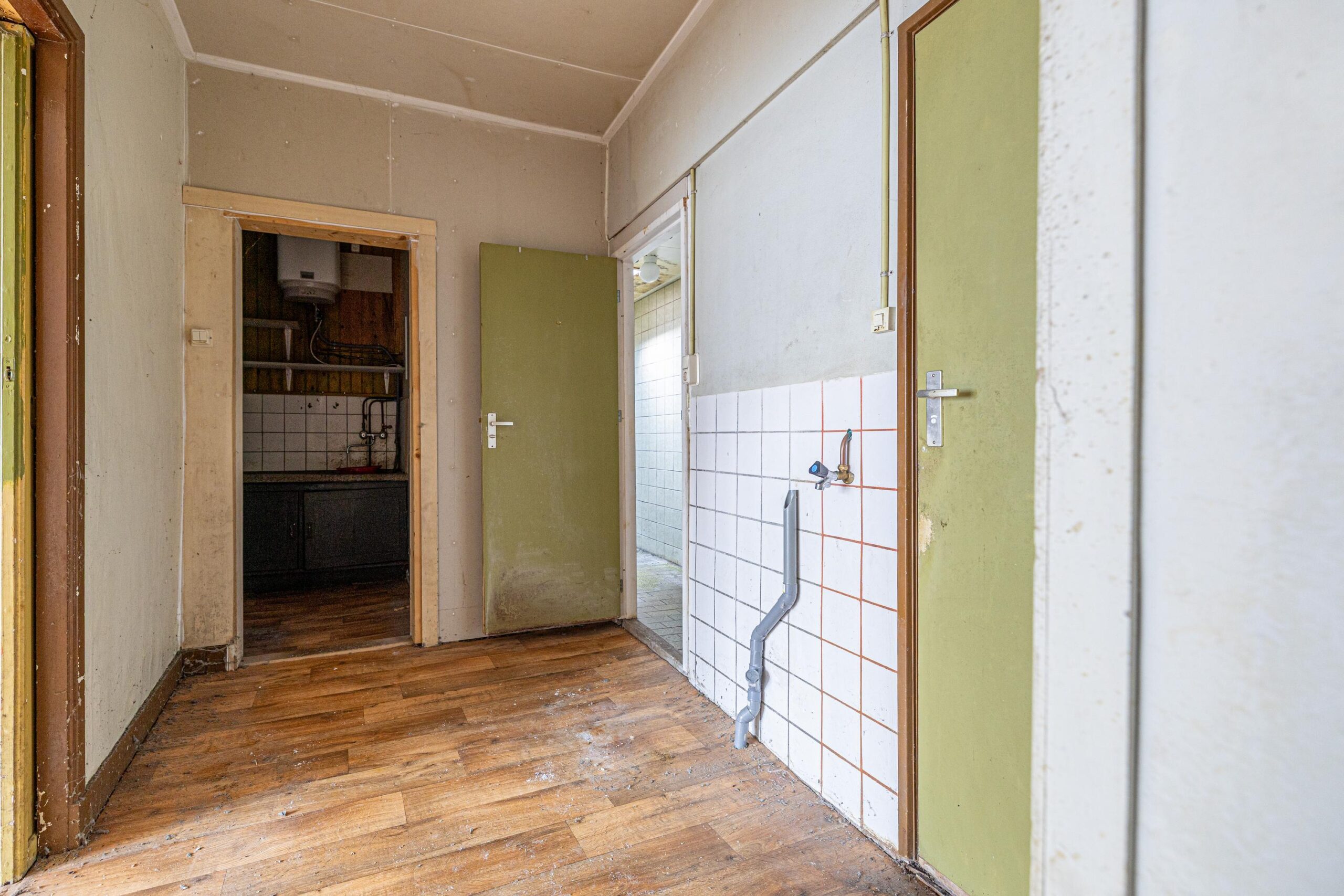 Je komt binnen in de hal met trapopgang naar de verdieping en toegang tot de kelder. Vanuit de hal loop je door naar de woonkamer en de keuken. Een deel van de woonkamer staat in halfopen verbinding met de keuken, schuifdeuren zorgen ervoor dat de ruimten kunnen worden gescheiden. Via de woonkamer bereik je tevens het toilet en de badkamer, die is voorzien van een ligbad en douche. De eerste verdieping biedt een overloop met toegang tot twee slaapkamers.
