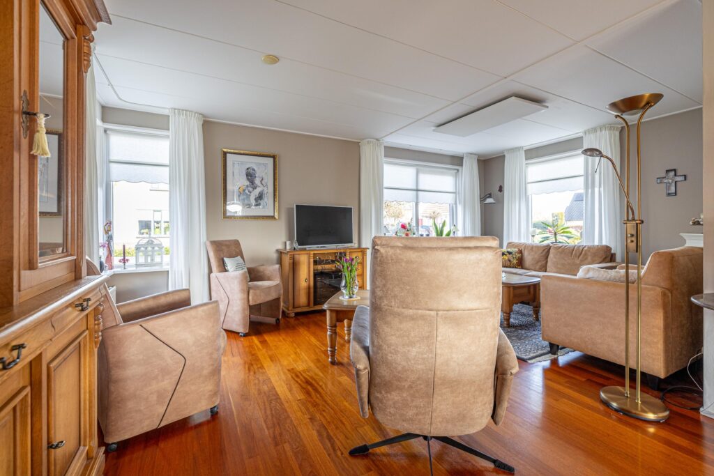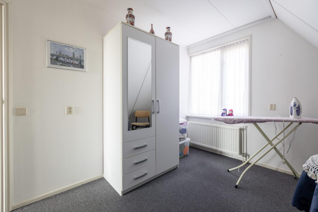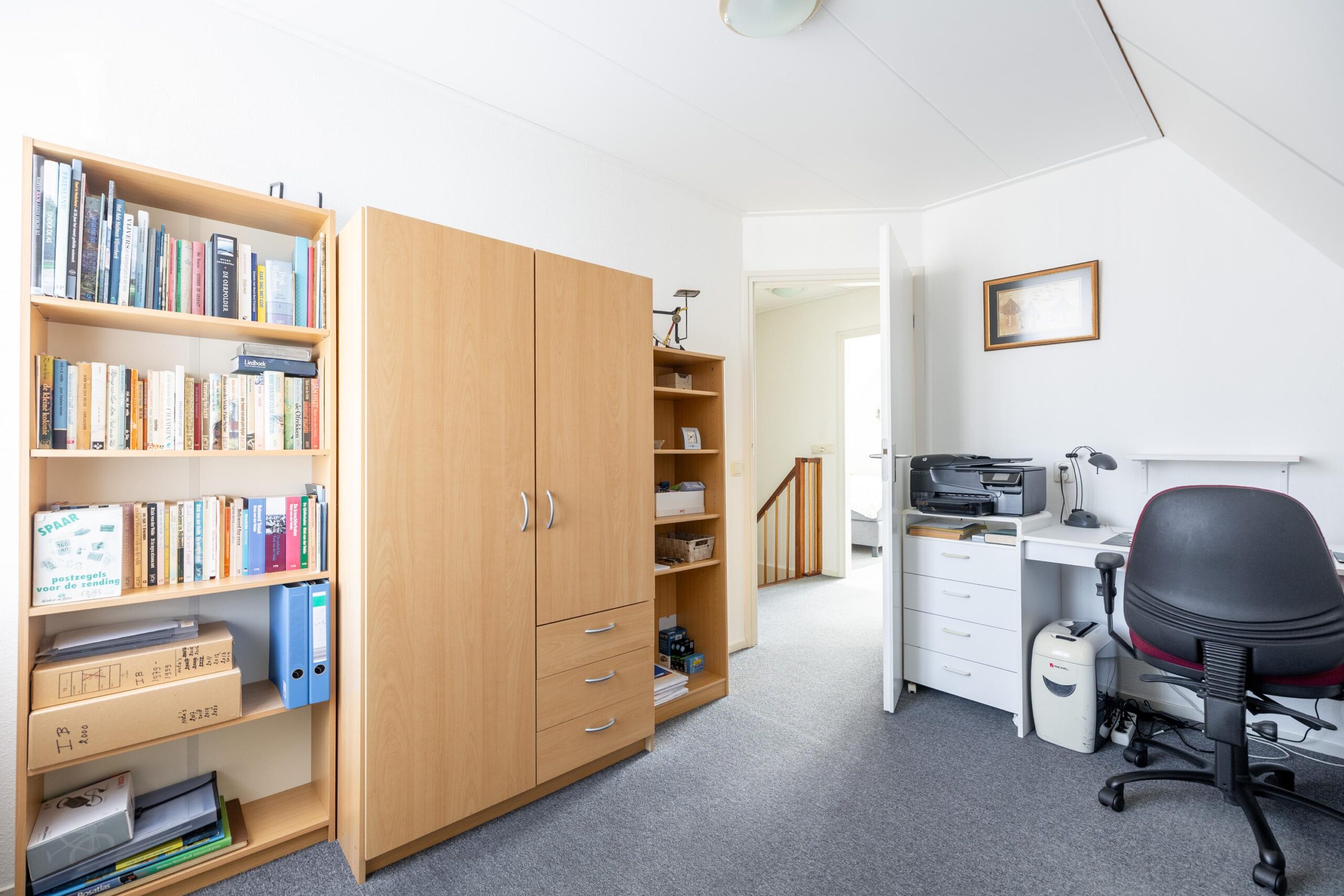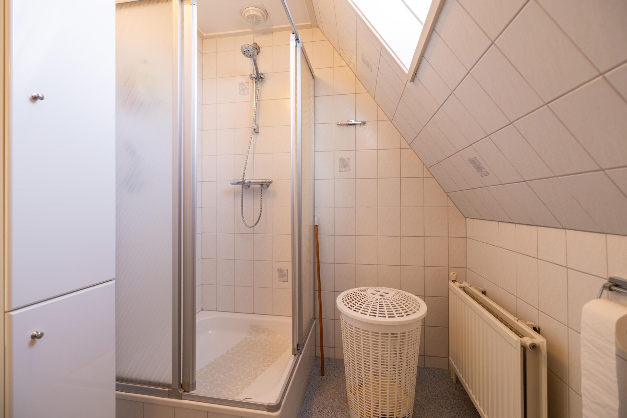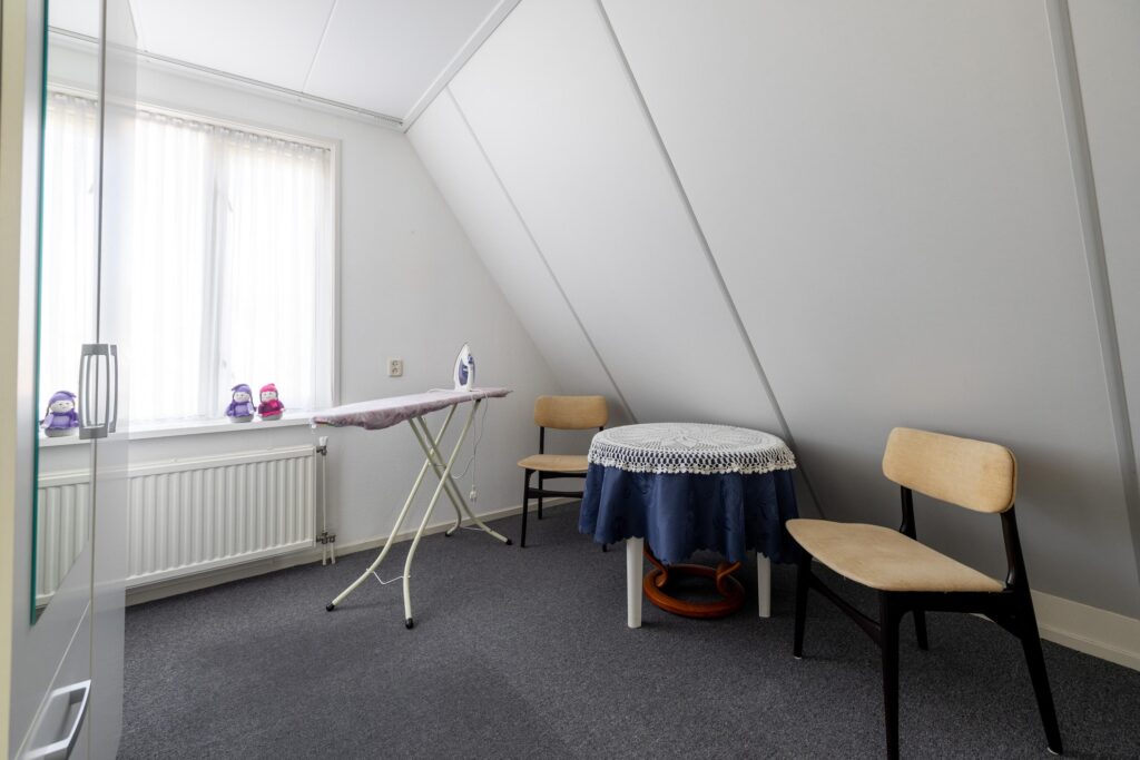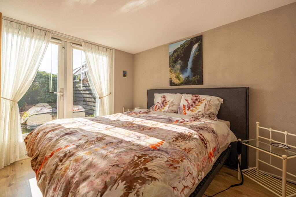 Entree met trapopgang naar de eerste verdieping, woonkamer met eethoek en uitbouw. De lichte woonkamer beschikt over een schuifpui naar de fraai aangelegde achtertuin op het zuiden. De woning is in 2005 uitgebouwd, waardoor op de begane grond een ruime slaapkamer met openslaande deuren naar de tuin en een badkamer zijn gerealiseerd. Ideaal voor levensloopbestendig wonen of werken aan huis. De lichte keuken is voorzien van deels vernieuwde apparatuur (2025), waaronder een koelkast, inductiekookplaat, vaatwasser en magnetron. Daarnaast is er een praktische bijkeuken met witgoedaansluitingen en een cv-ketel.