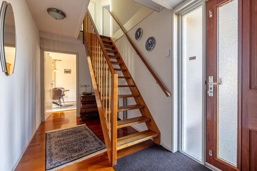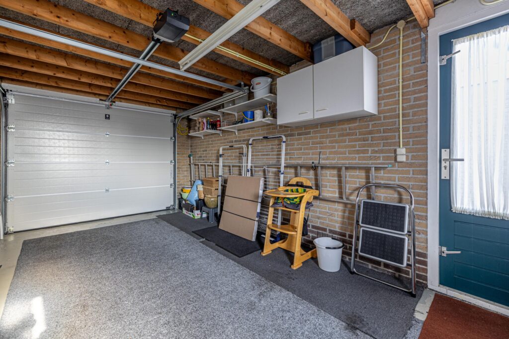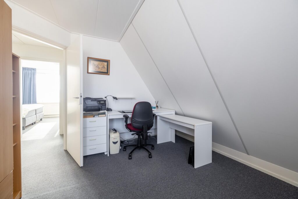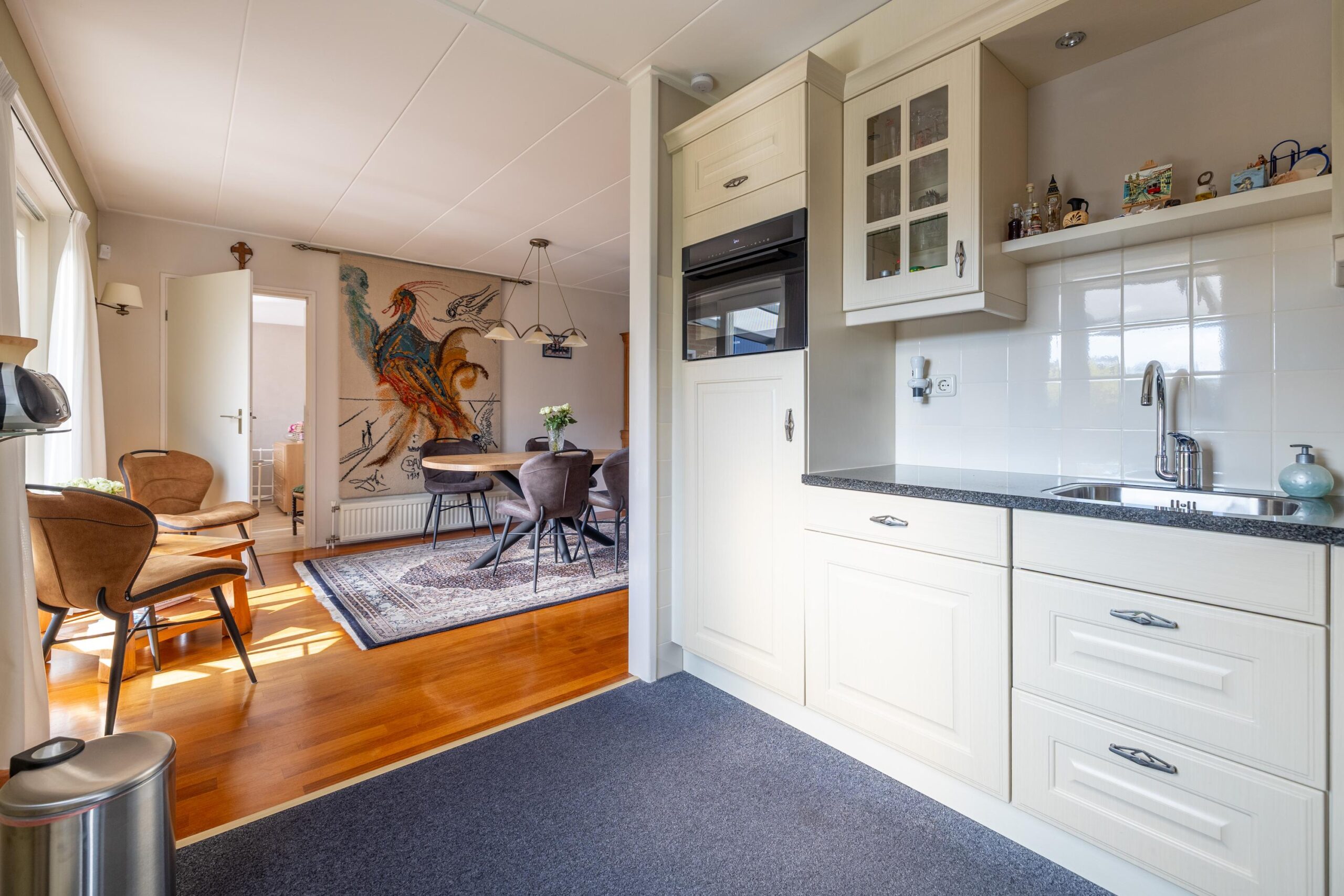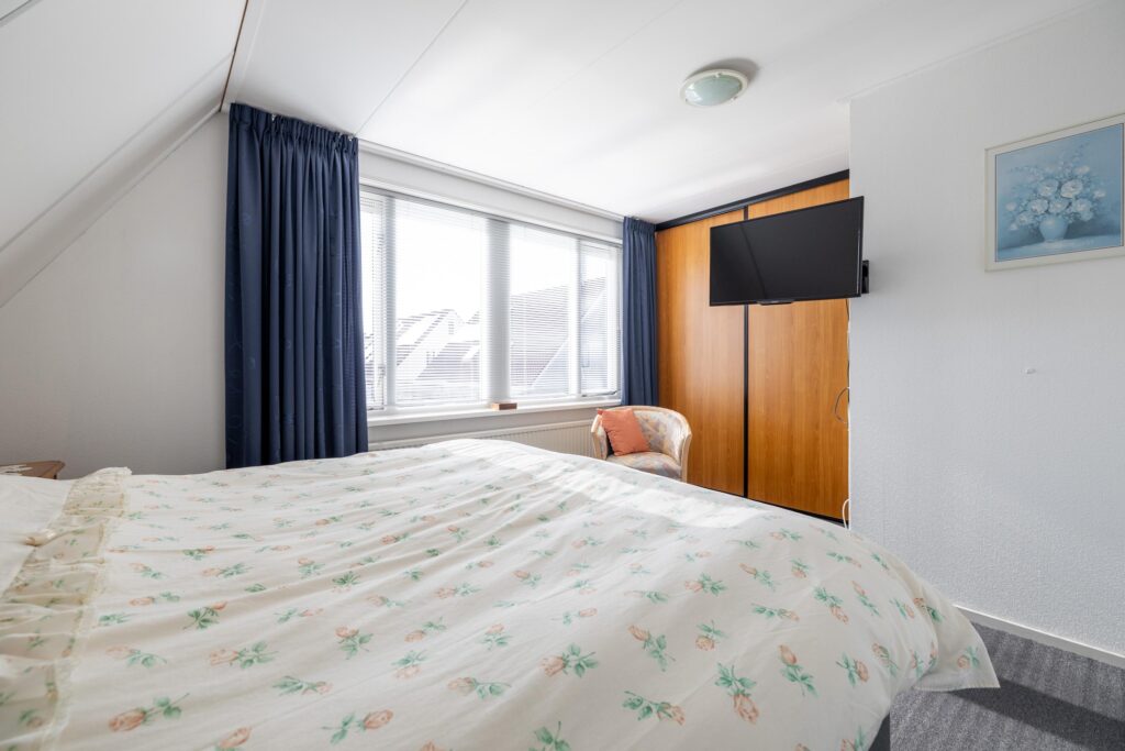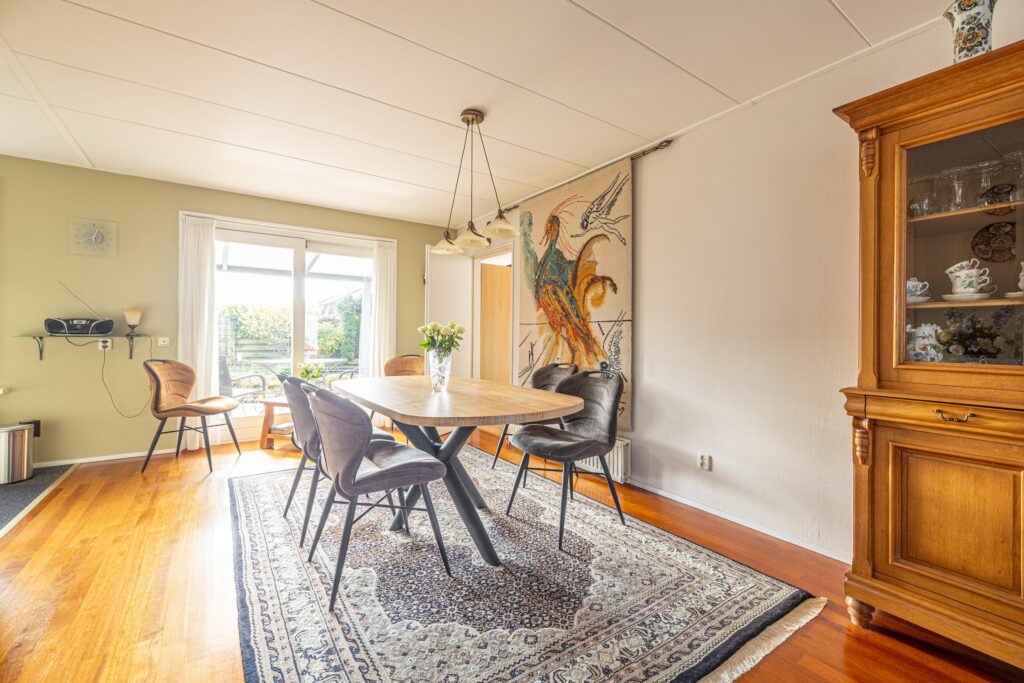 Entree met trapopgang naar de eerste verdieping, woonkamer met eethoek en uitbouw. De lichte woonkamer beschikt over een schuifpui naar de fraai aangelegde achtertuin op het zuiden. De woning is in 2005 uitgebouwd, waardoor op de begane grond een ruime slaapkamer met openslaande deuren naar de tuin en een badkamer zijn gerealiseerd. Ideaal voor levensloopbestendig wonen of werken aan huis. De lichte keuken is voorzien van deels vernieuwde apparatuur (2025), waaronder een koelkast, inductiekookplaat, vaatwasser en magnetron. Daarnaast is er een praktische bijkeuken met witgoedaansluitingen en een cv-ketel.