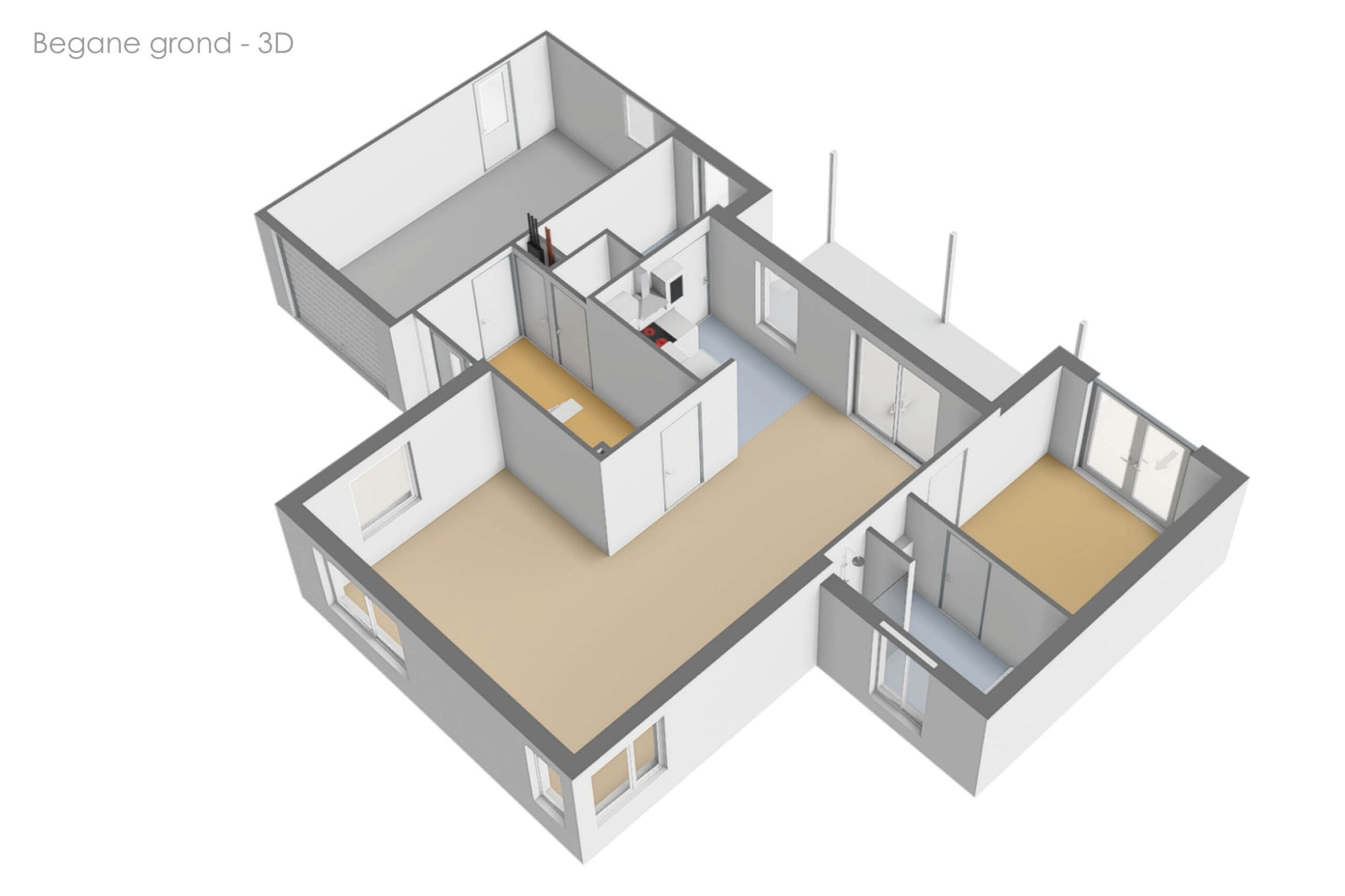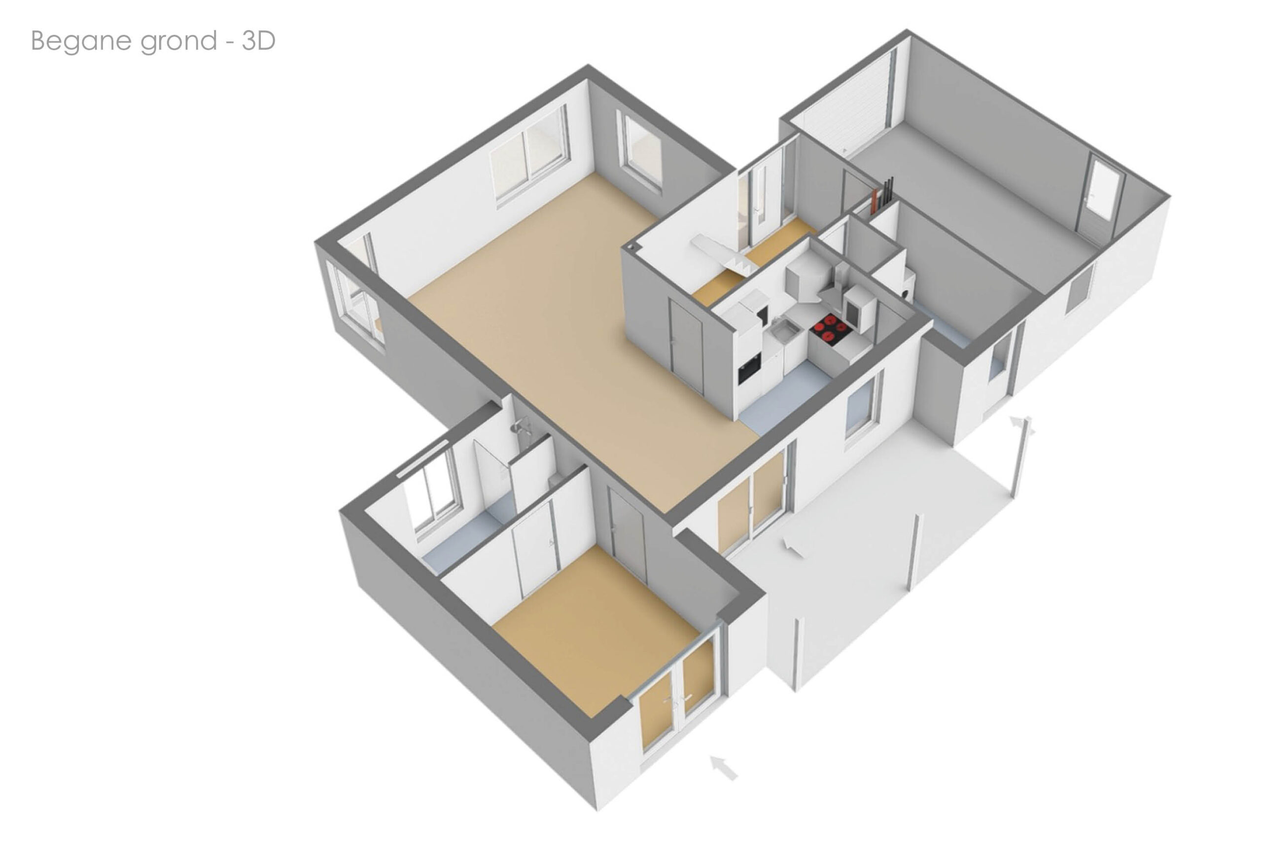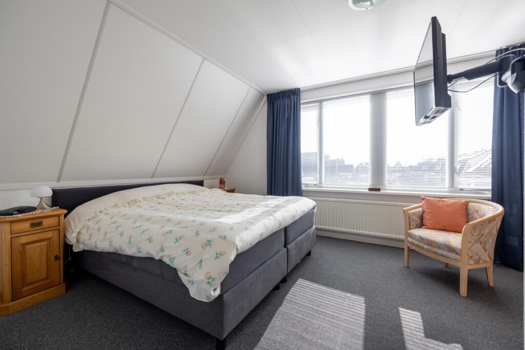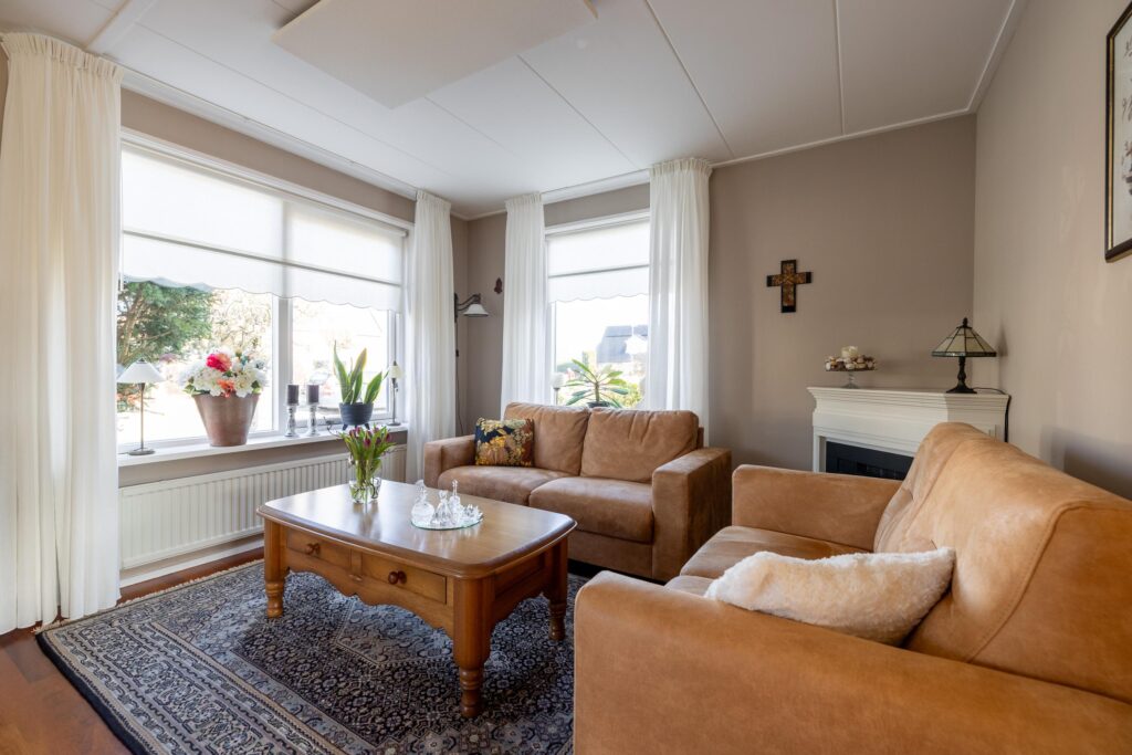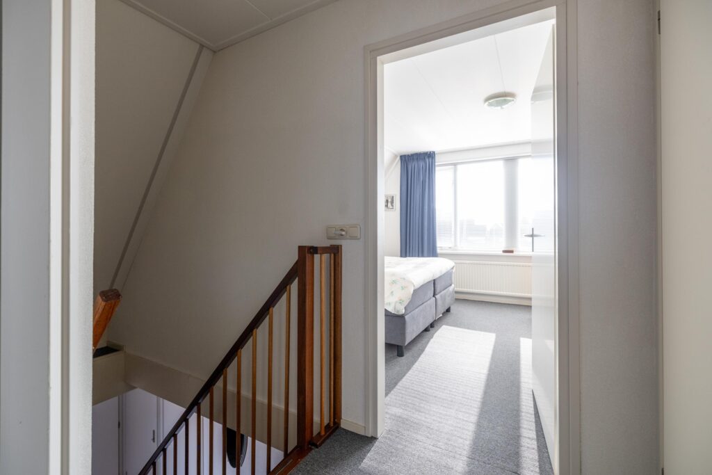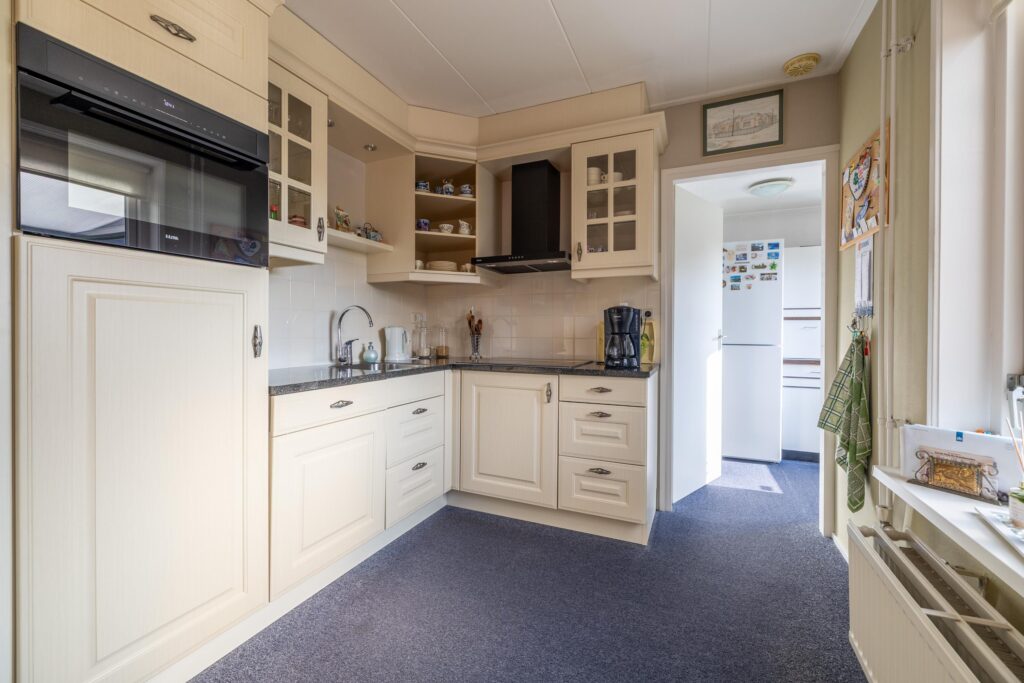 Entree met trapopgang naar de eerste verdieping, woonkamer met eethoek en uitbouw. De lichte woonkamer beschikt over een schuifpui naar de fraai aangelegde achtertuin op het zuiden. De woning is in 2005 uitgebouwd, waardoor op de begane grond een ruime slaapkamer met openslaande deuren naar de tuin en een badkamer zijn gerealiseerd. Ideaal voor levensloopbestendig wonen of werken aan huis. De lichte keuken is voorzien van deels vernieuwde apparatuur (2025), waaronder een koelkast, inductiekookplaat, vaatwasser en magnetron. Daarnaast is er een praktische bijkeuken met witgoedaansluitingen en een cv-ketel.