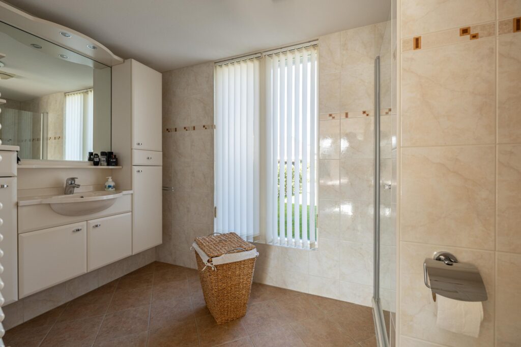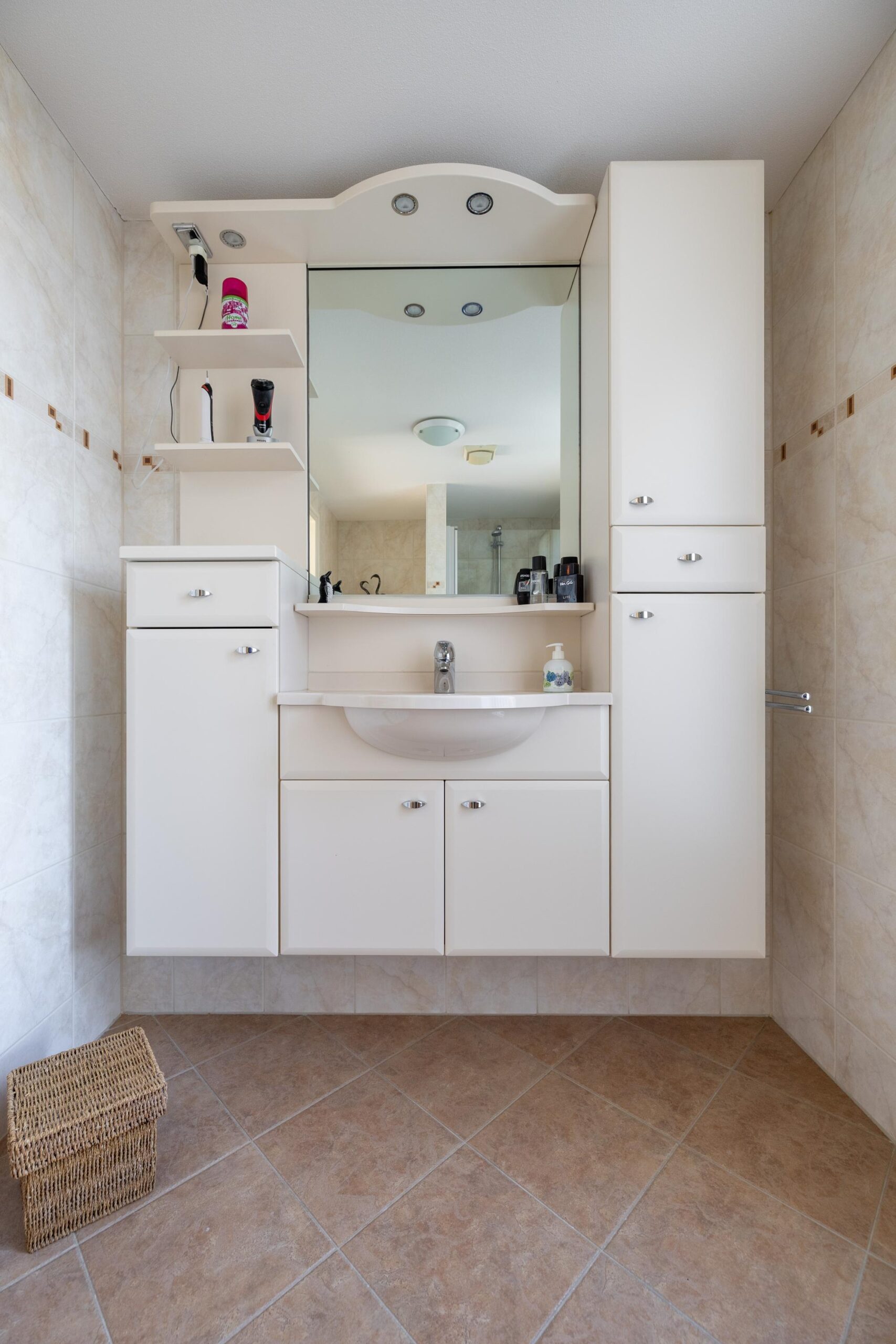 Overloop met toegang tot drie slaapkamers en een tweede badkamer met douche, toilet en badkamermeubel.