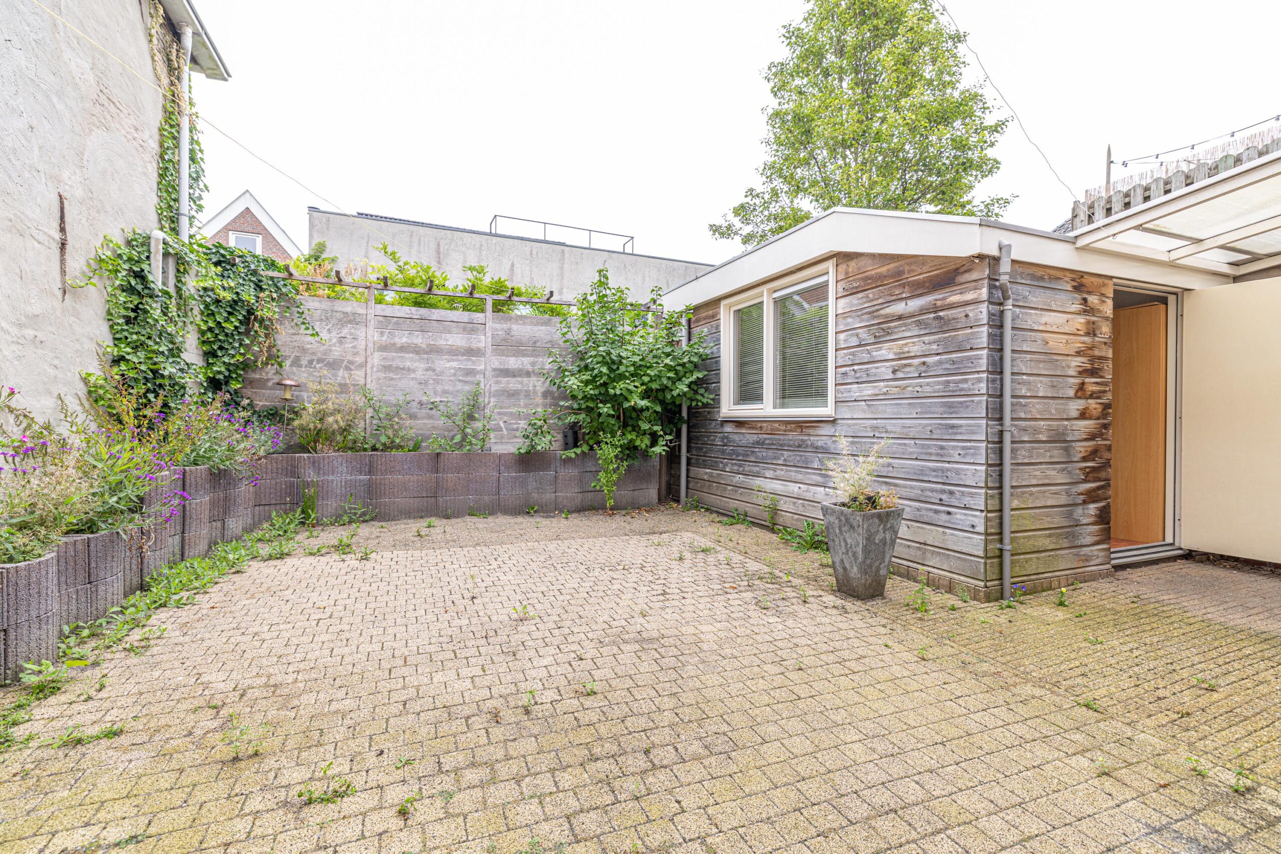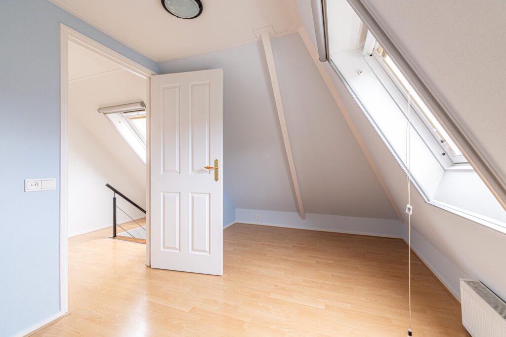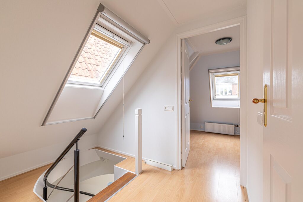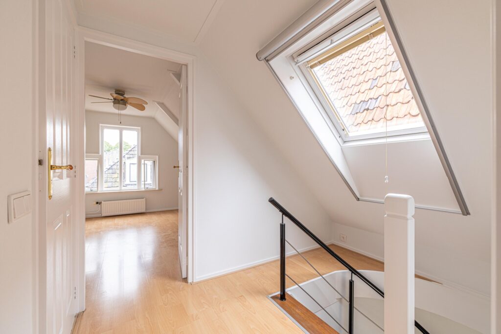 Op de verdieping bevinden zich een overloop, twee slaapkamers en de badkamer. De badkamer is uitgerust met een ligbad, douche, wastafel en toilet. De achtertuin is bereikbaar via de openslaande deuren en via de bijkeuken/achterom. Achterin de tuin staat een vrijstaande houten berging. Deze berging is voorzien van een eigen verwarming en een keukenblok.