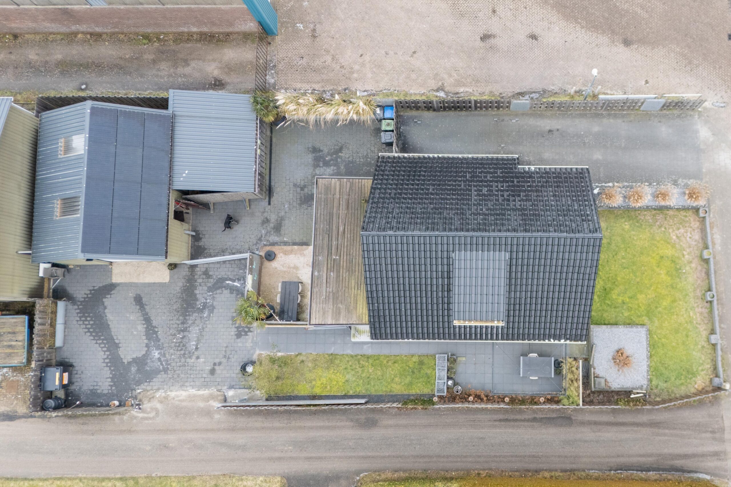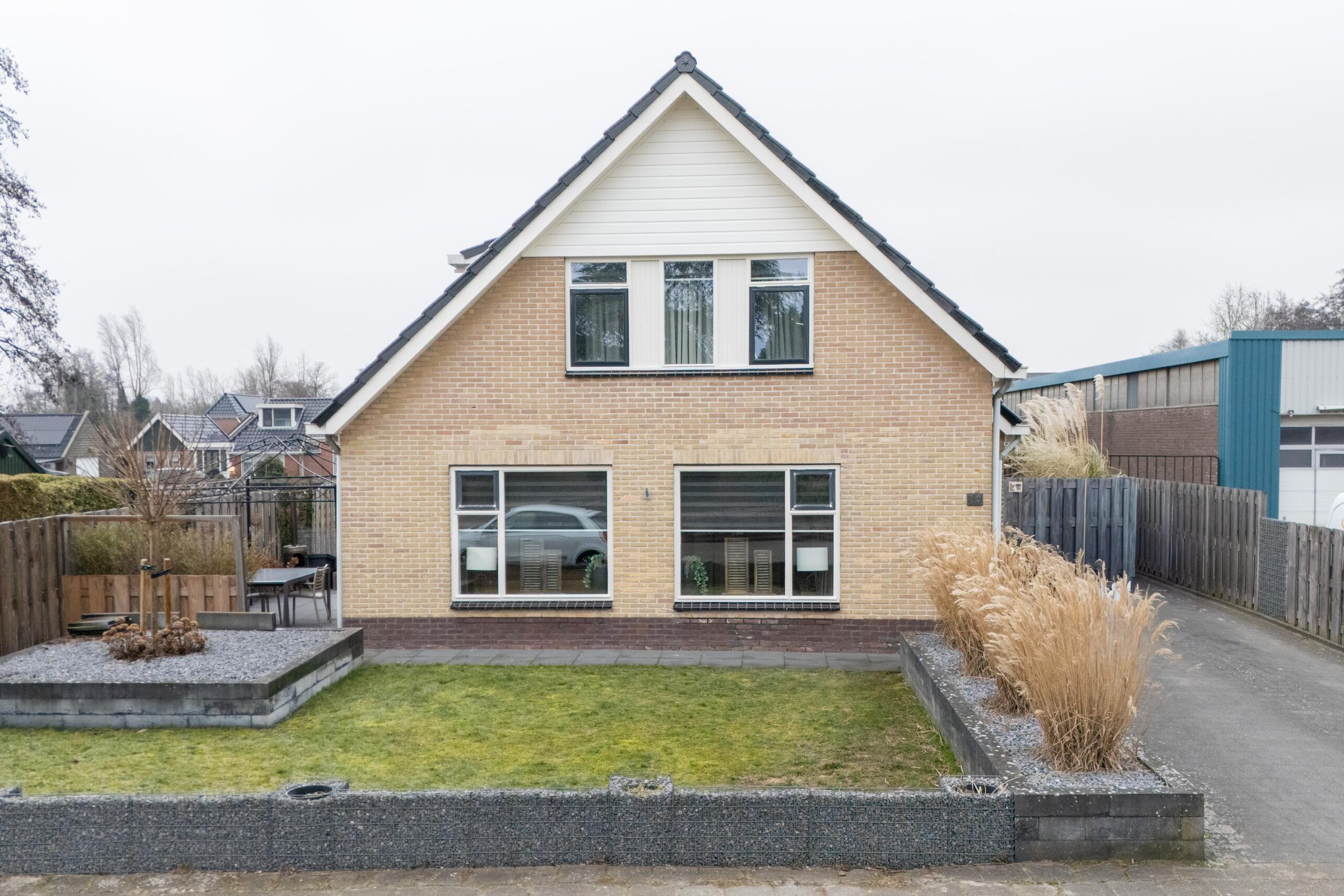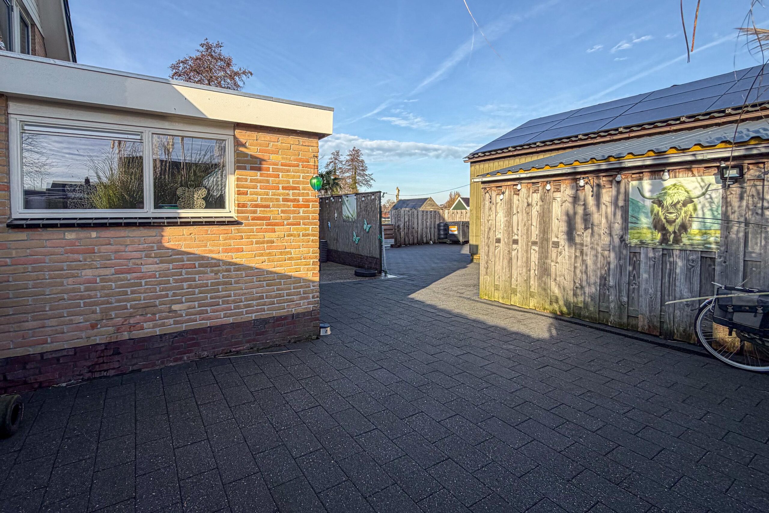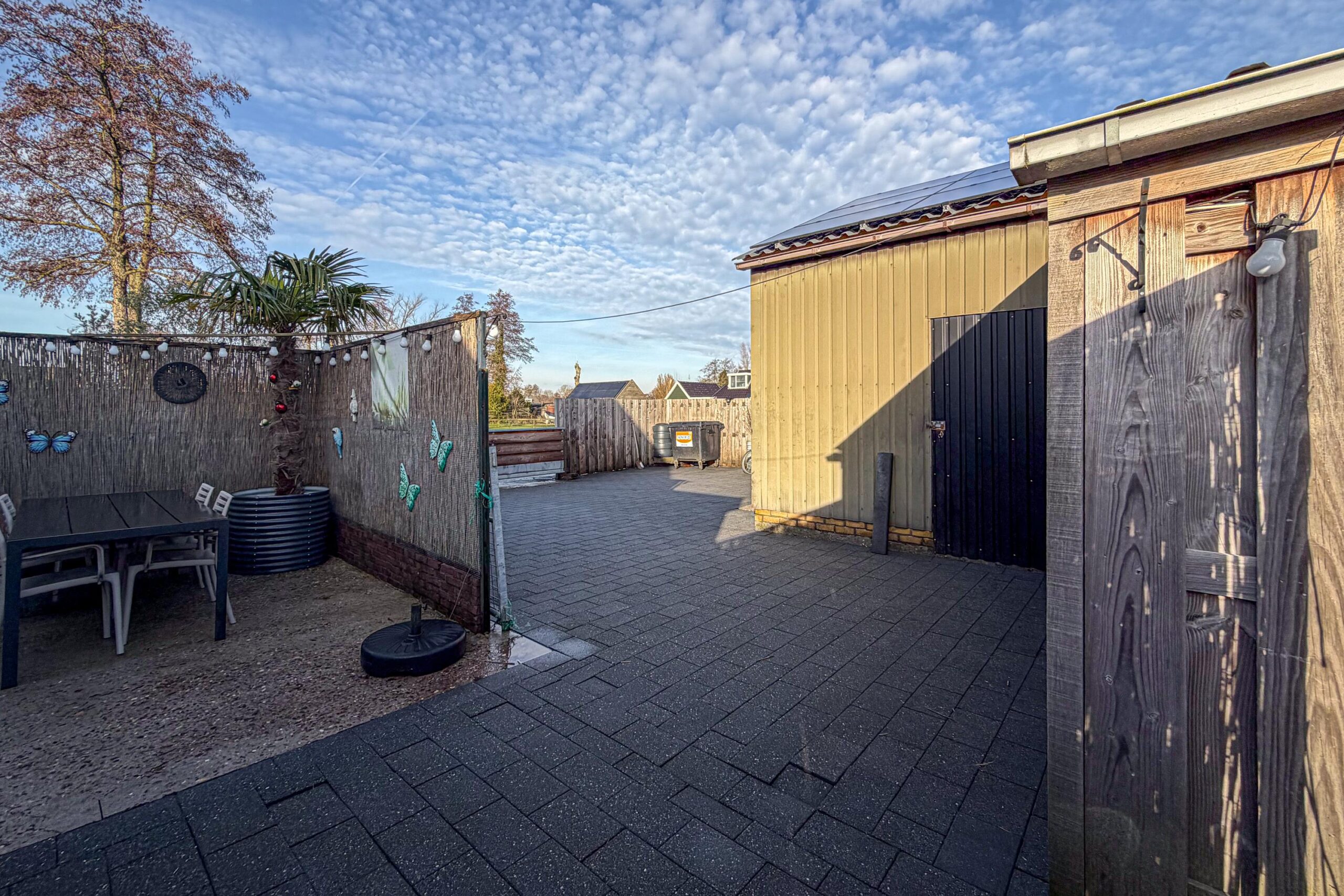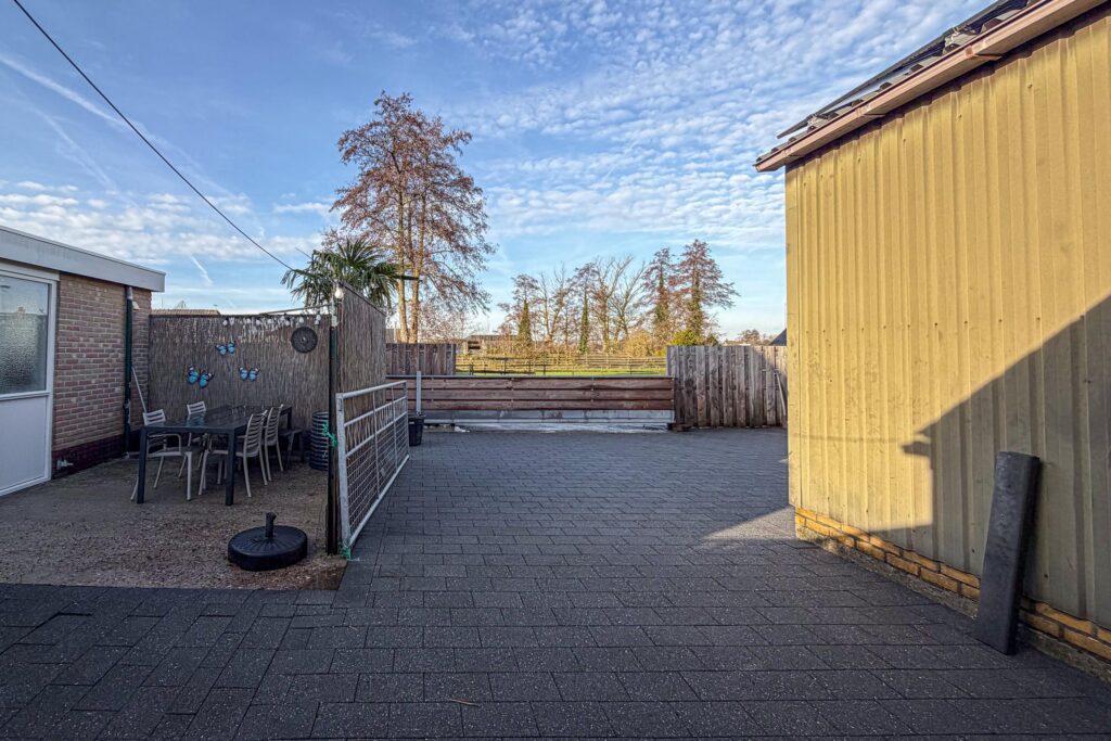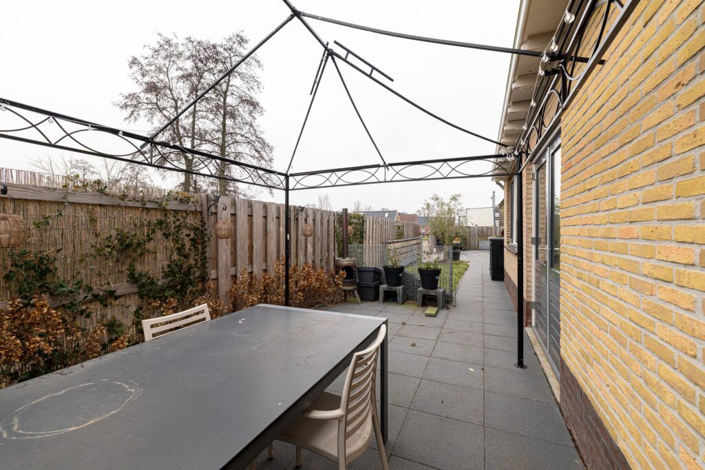 De tuin rondom de woning biedt volop privacy en ruimte om meerdere zitplekken te creëren. Het pad tussen de woningen behoort deels tot het perceel.