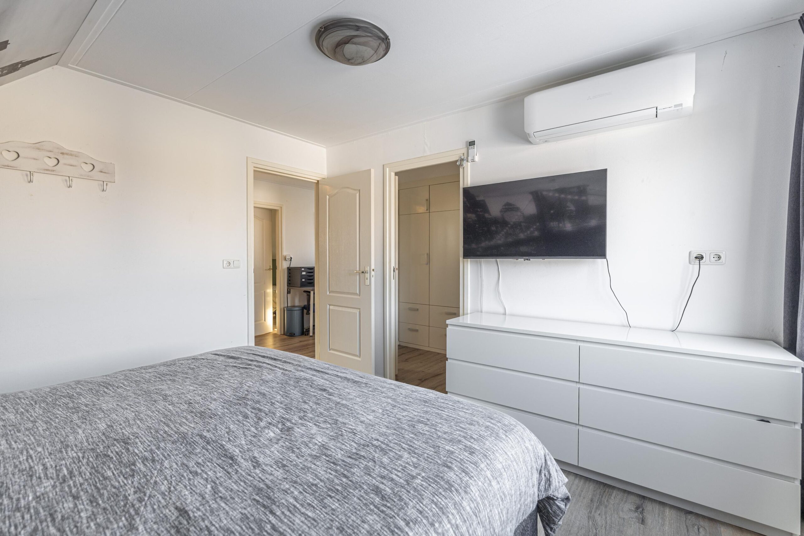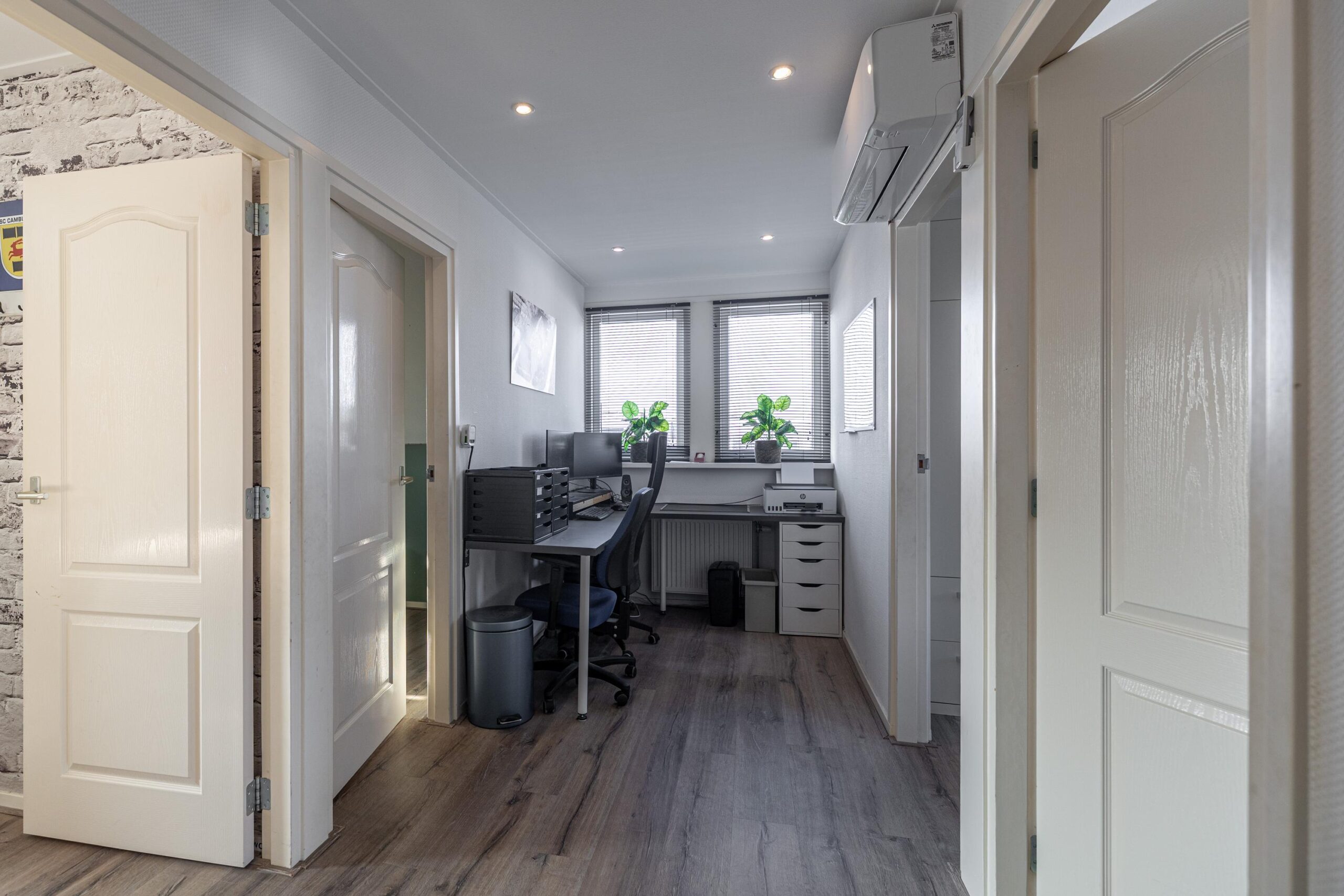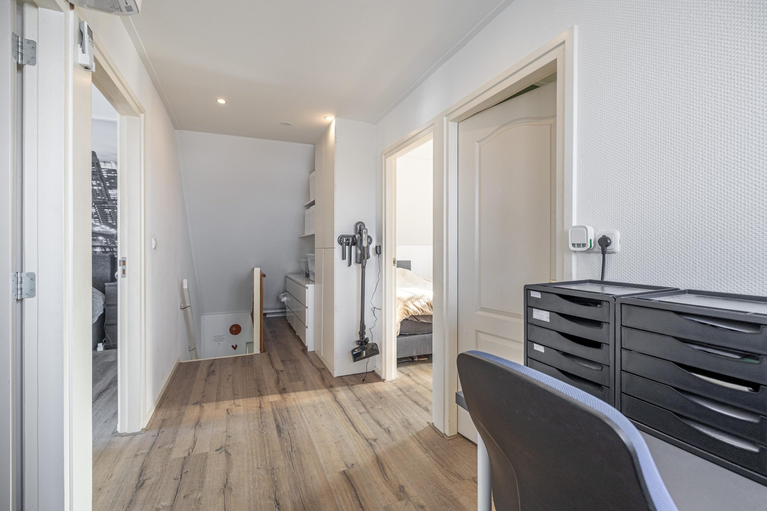 Overloop met toegang tot vier slaapkamers. De vierde slaapkamer is momenteel ingericht als inloopkast, deze kast is gemakkelijk weer te demonteren zodat deze kamer ook kan dienen als slaapkamer. Op deze verdieping zijn twee airco-units aanwezig, wat zorgt voor een comfortabel binnenklimaat in alle seizoenen.