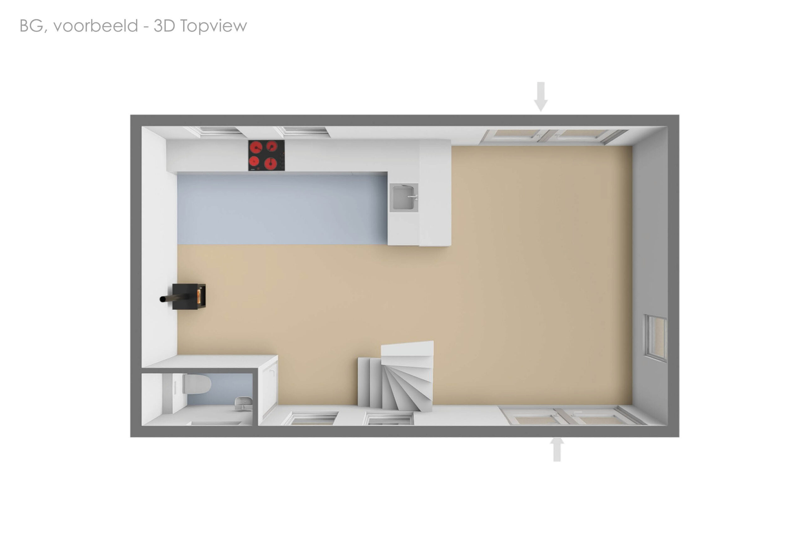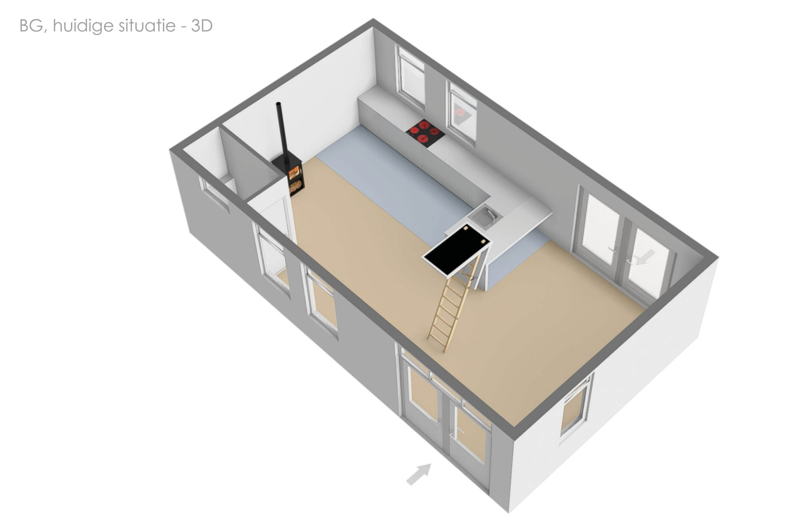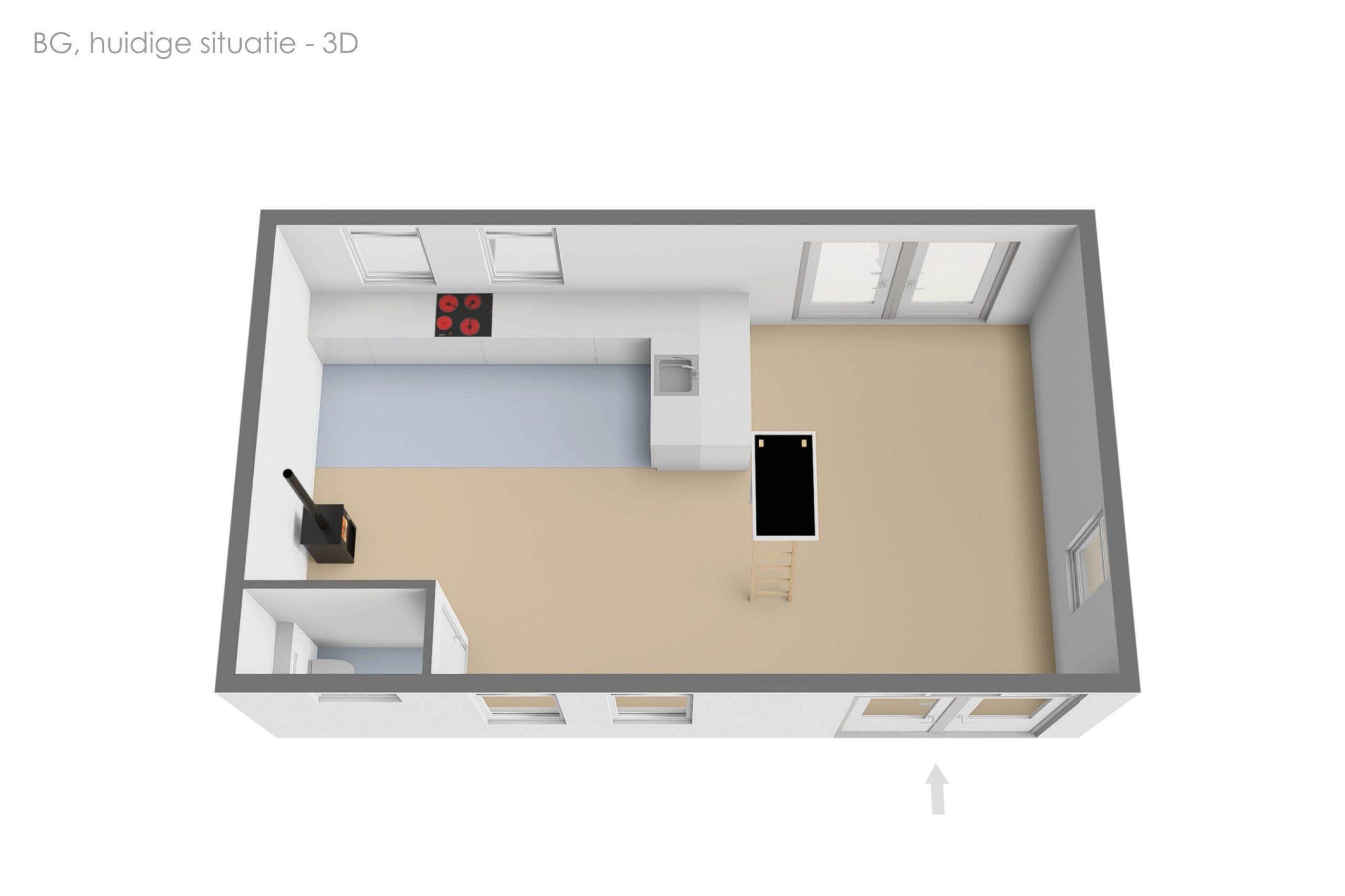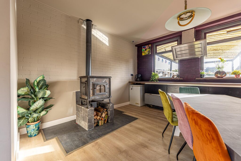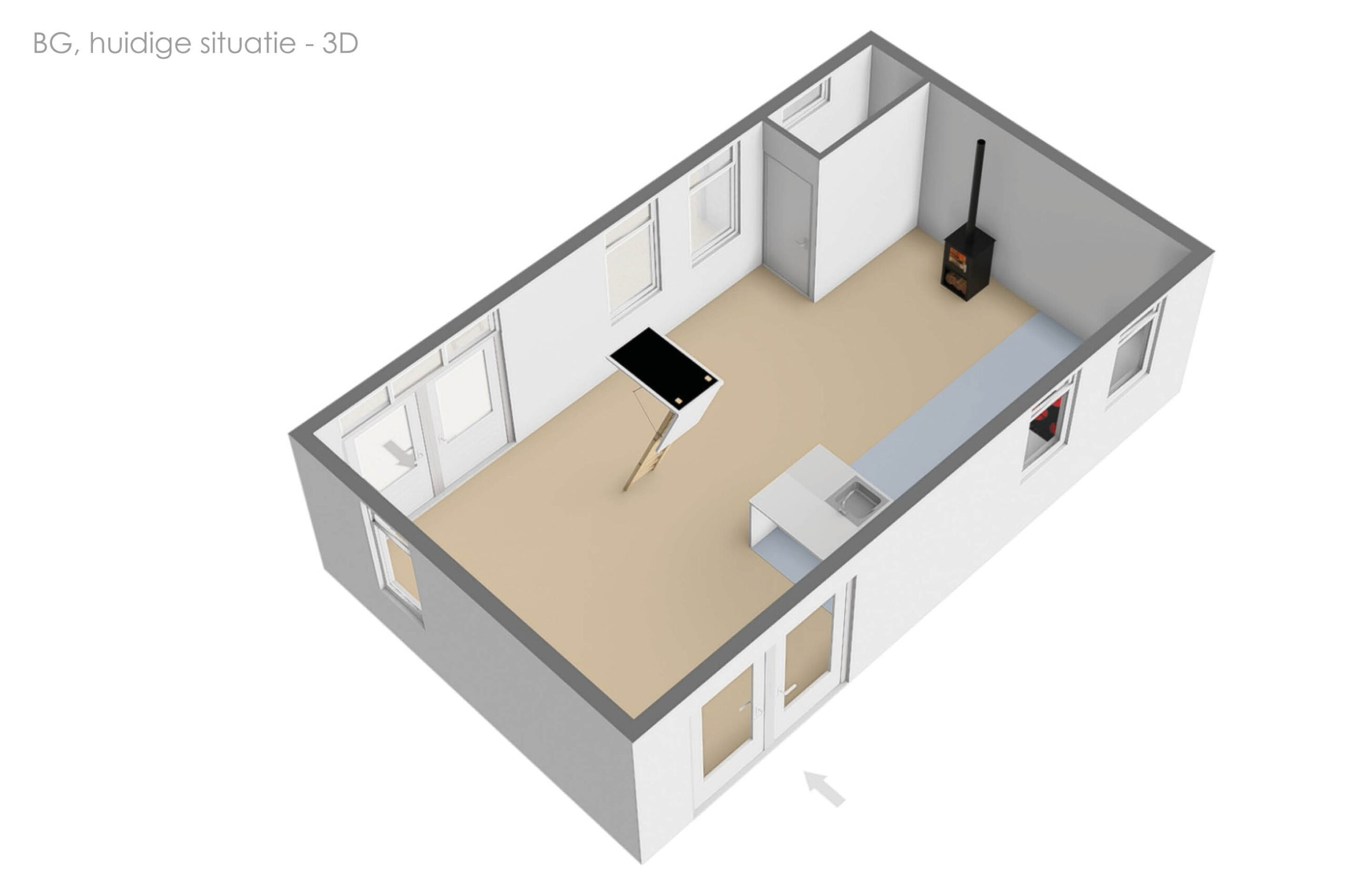 Binnen, op de begane grond zijn al een keuken en een toilet aanwezig. Via de openslaande deuren in de woonkamer stap je direct de tuin in. De verdieping is momenteel nog bereikbaar via een vlizotrap, en biedt ruimte om bijvoorbeeld twee slaapkamers en een badkamer te realiseren (zie ook de plattegronden voor een mogelijke indeling). Ook kan er eventueel nog een dakkapel geplaatst worden voor extra ruimte. Verder is het dak al geïsoleerd en is er een houtkachel aanwezig, kortom er ligt al een goede basis.
