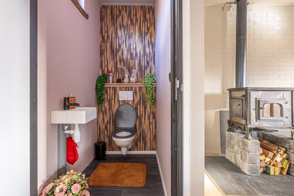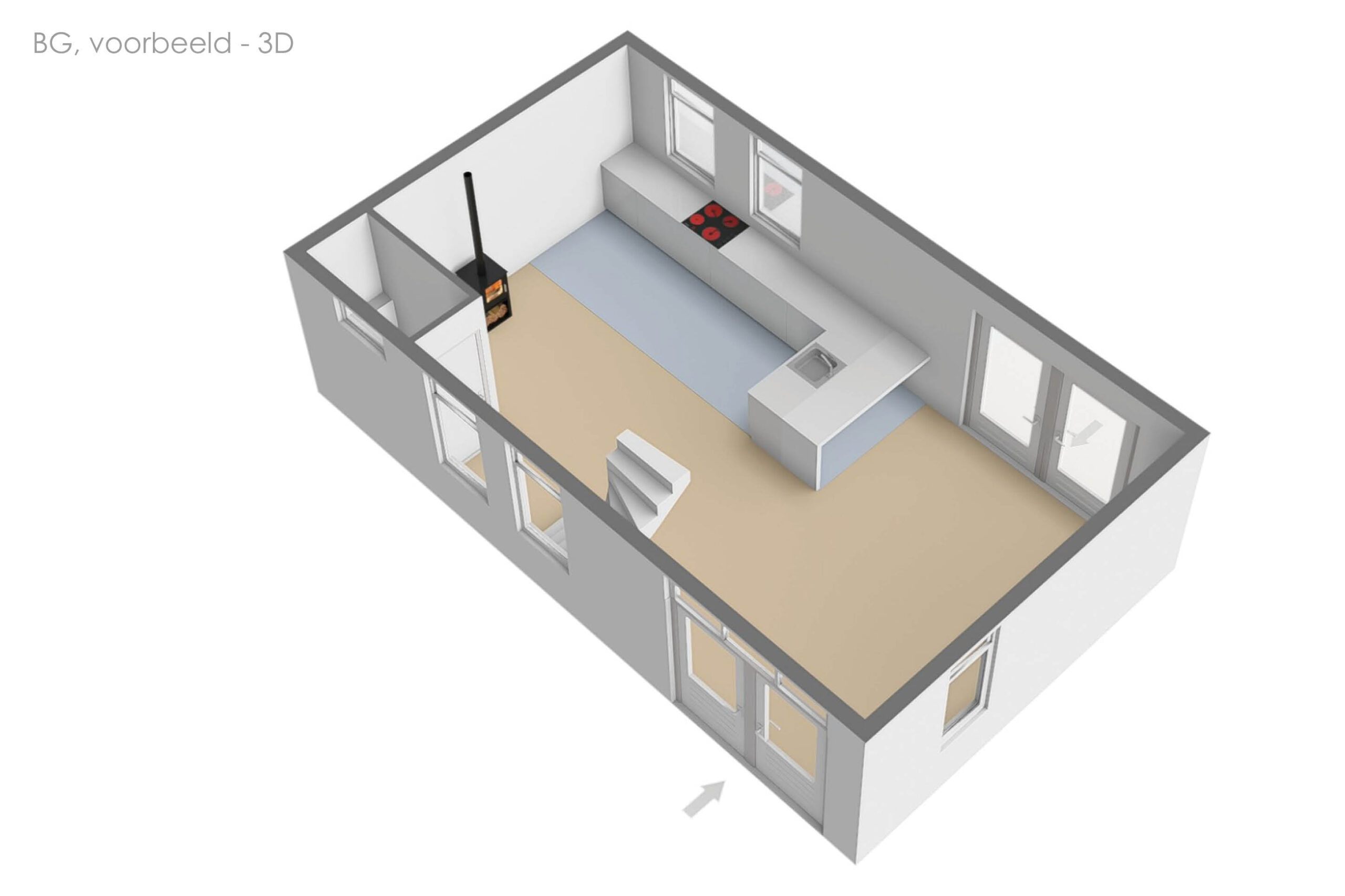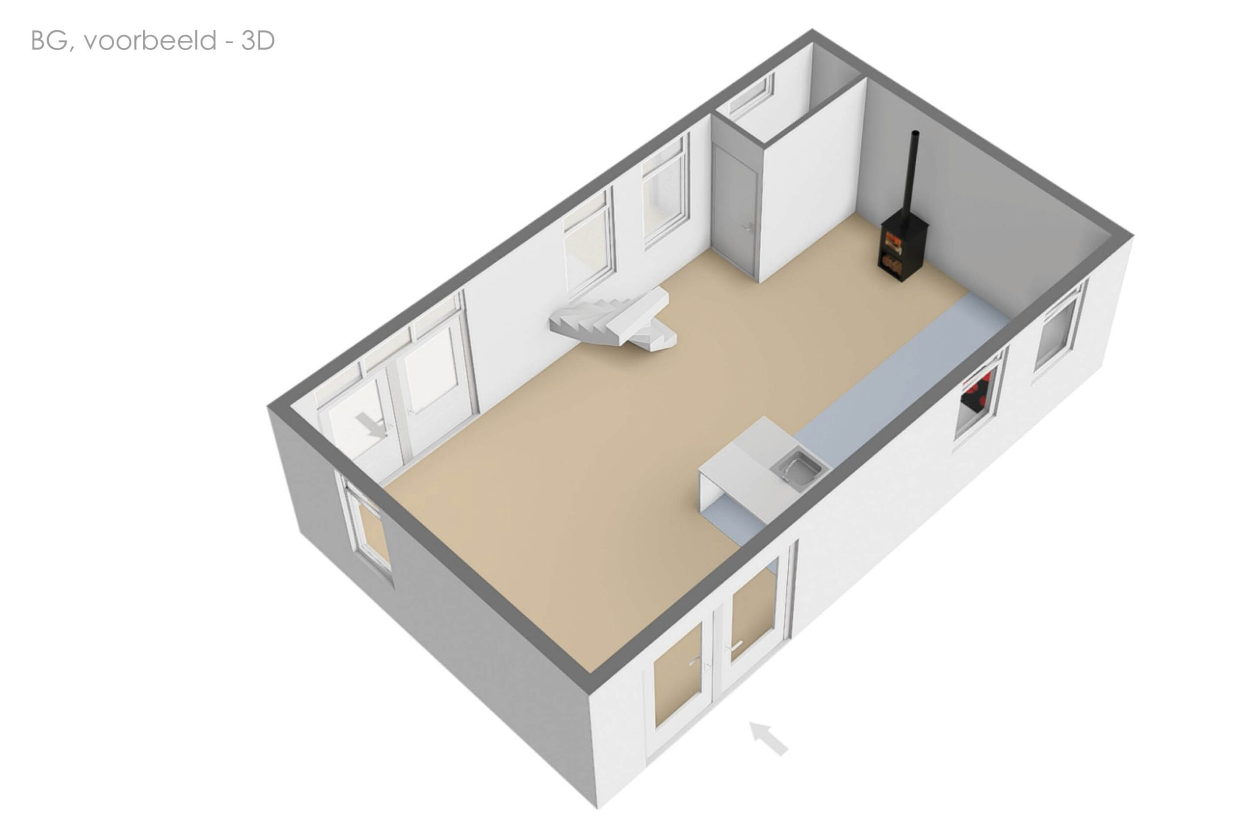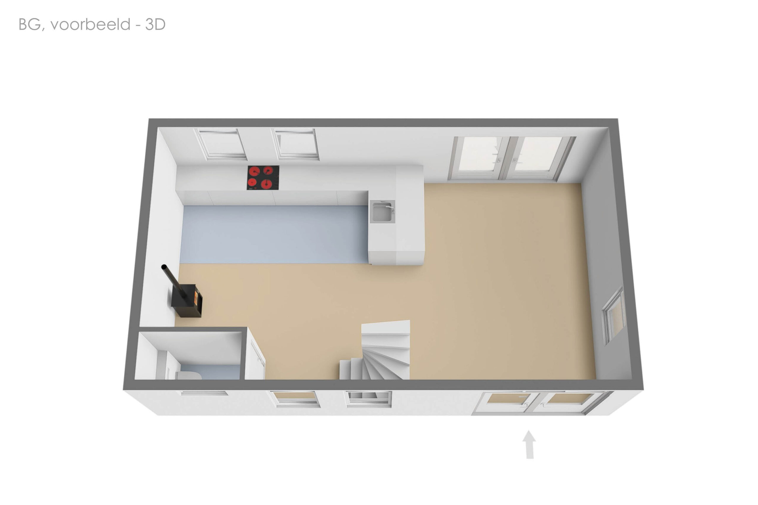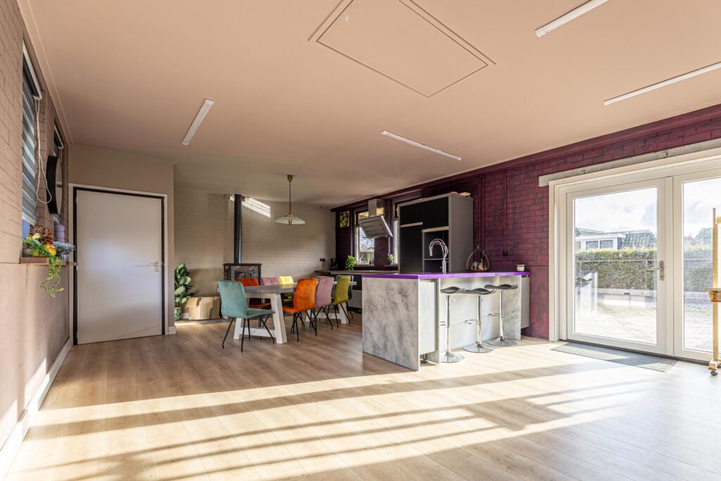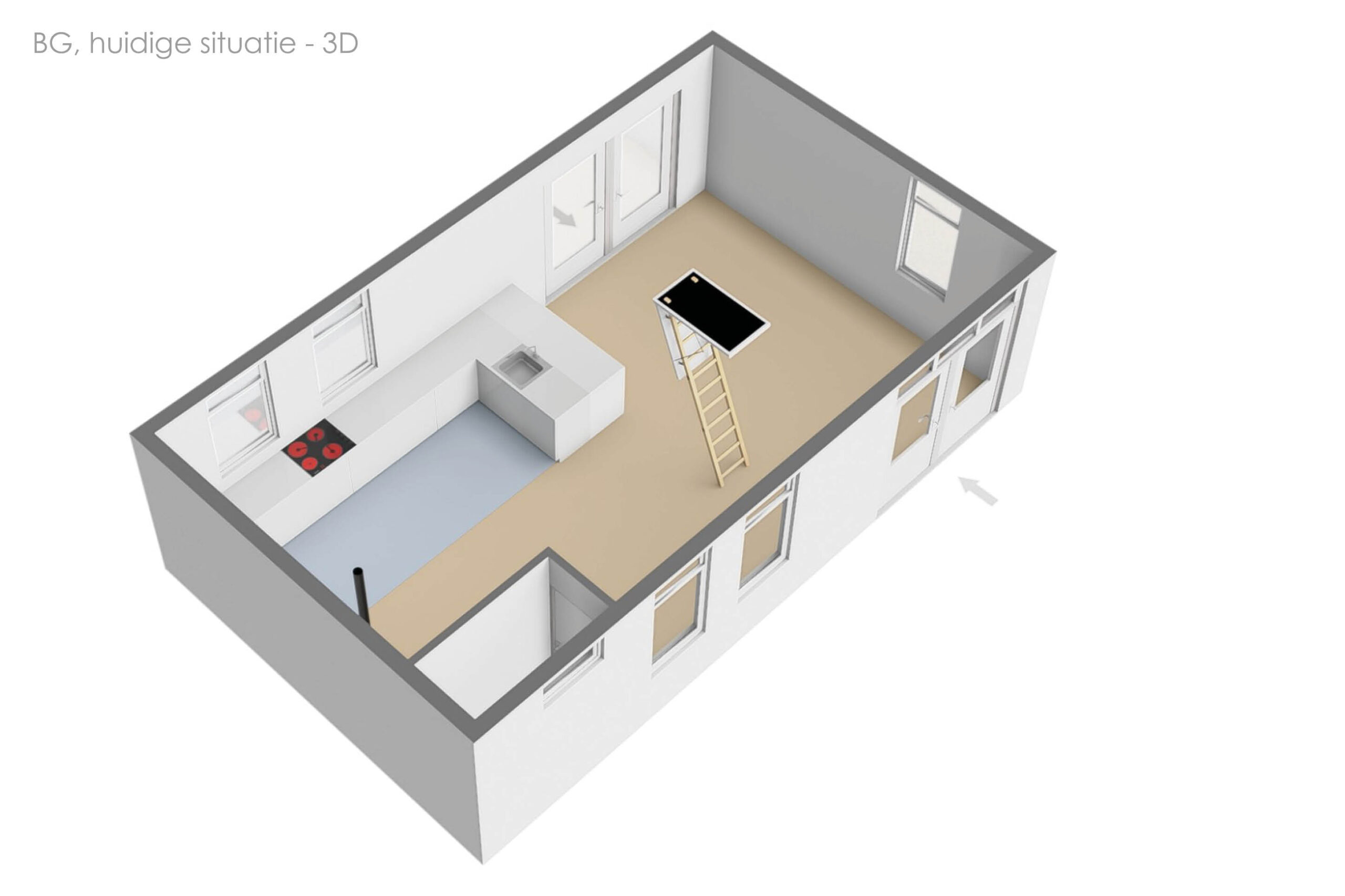 Binnen, op de begane grond zijn al een keuken en een toilet aanwezig. Via de openslaande deuren in de woonkamer stap je direct de tuin in. De verdieping is momenteel nog bereikbaar via een vlizotrap, en biedt ruimte om bijvoorbeeld twee slaapkamers en een badkamer te realiseren (zie ook de plattegronden voor een mogelijke indeling). Ook kan er eventueel nog een dakkapel geplaatst worden voor extra ruimte. Verder is het dak al geïsoleerd en is er een houtkachel aanwezig, kortom er ligt al een goede basis.