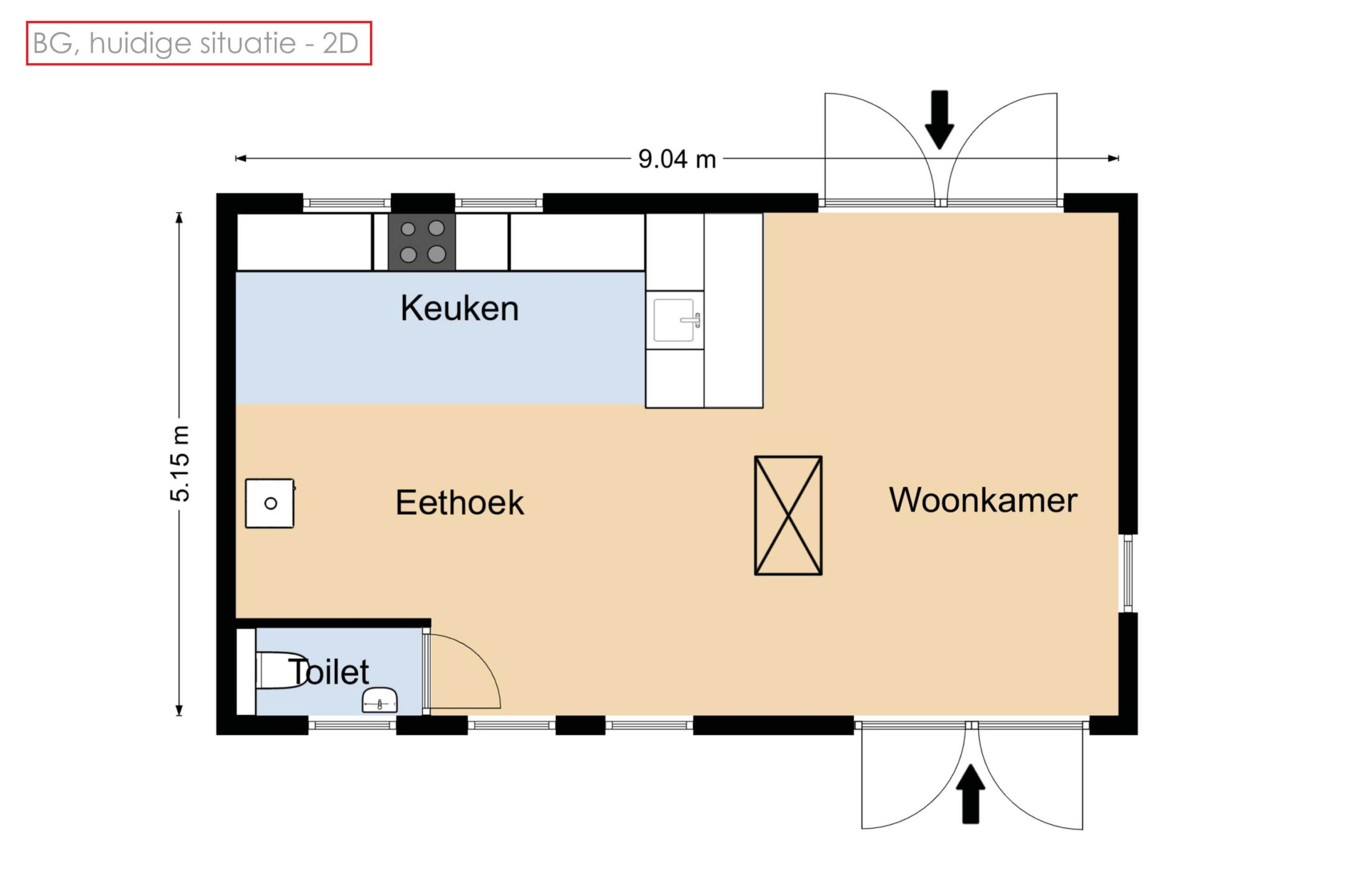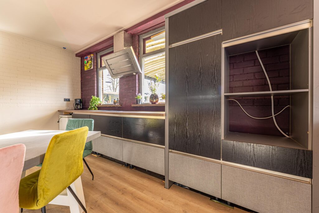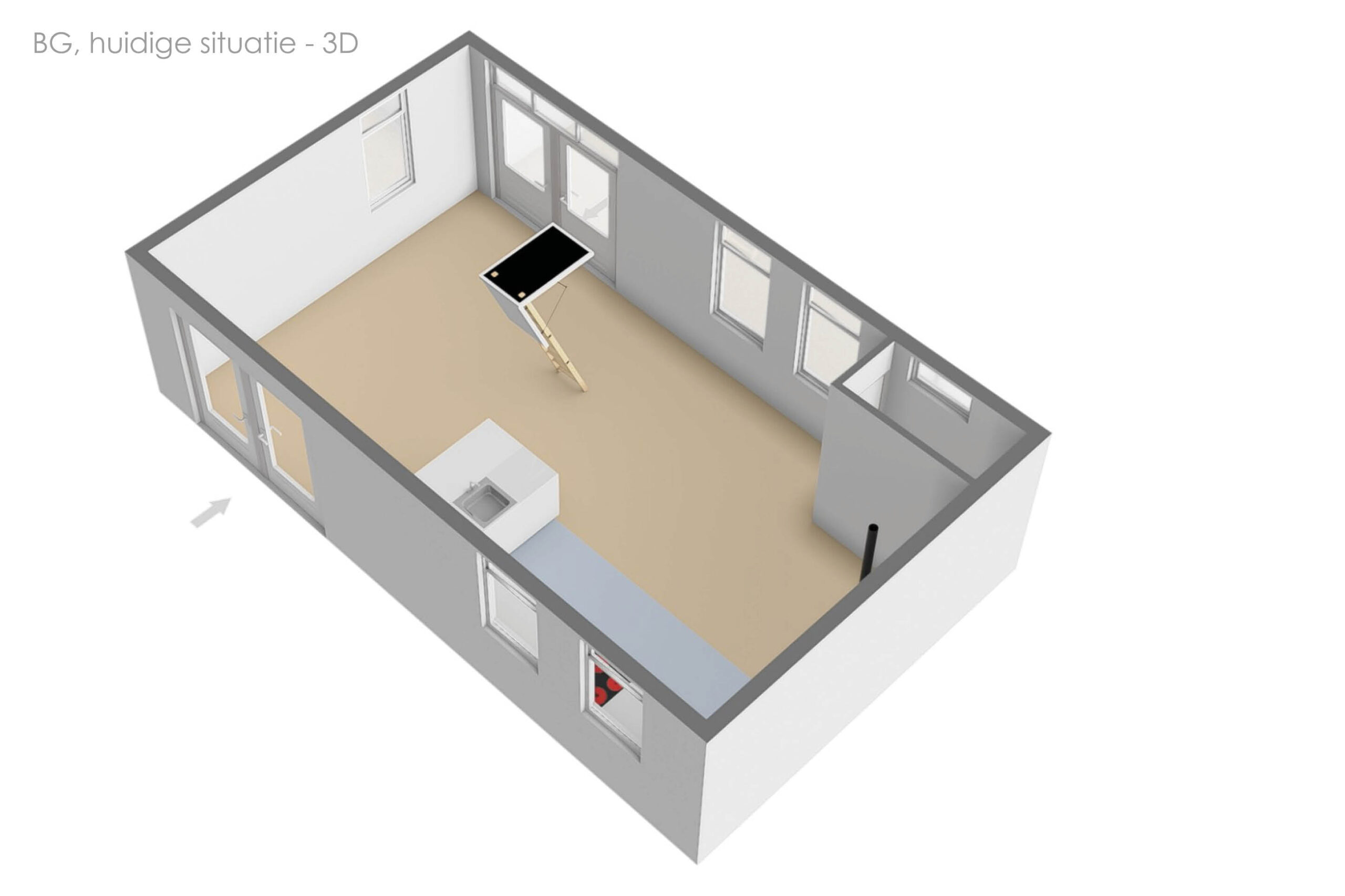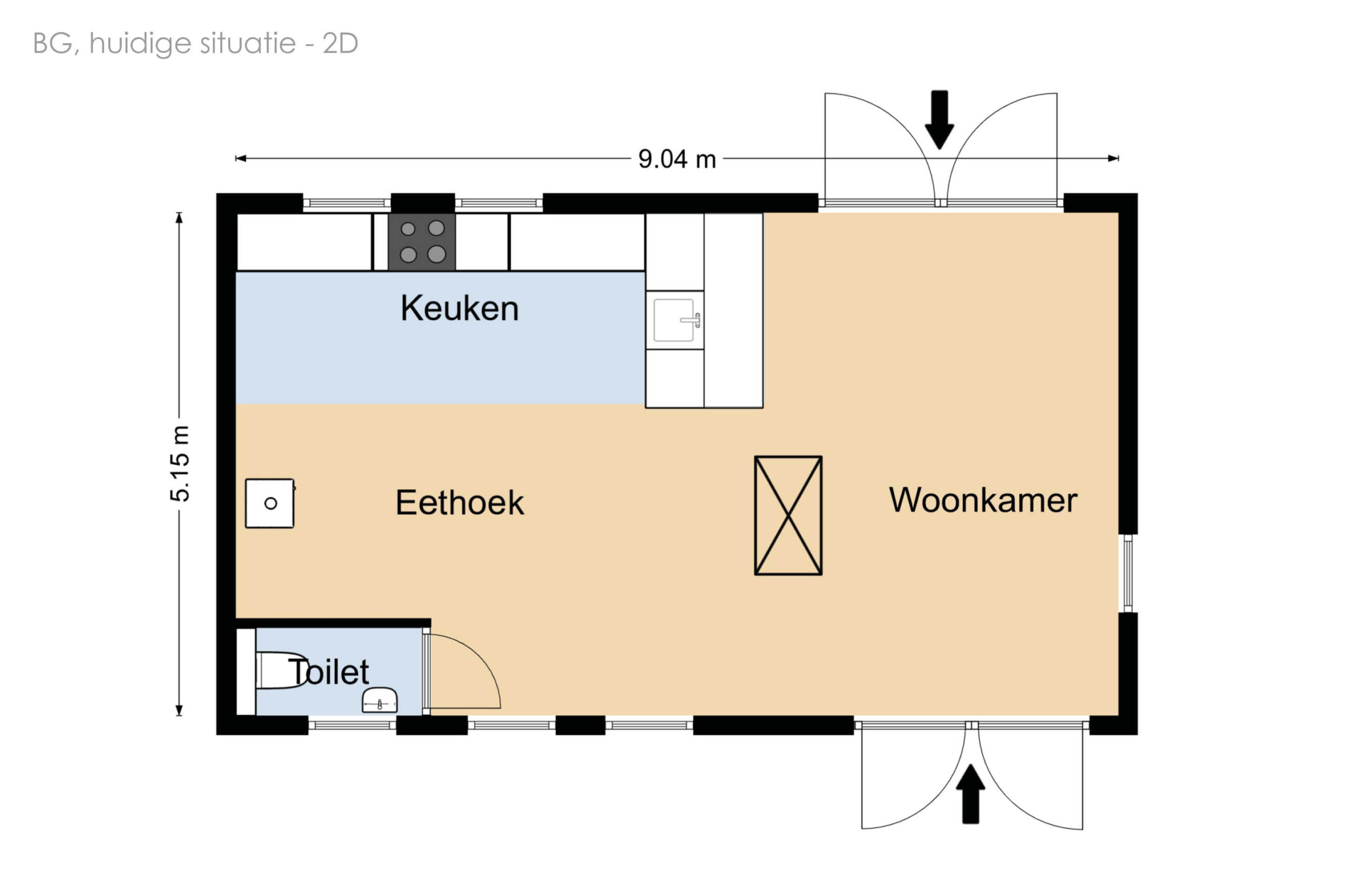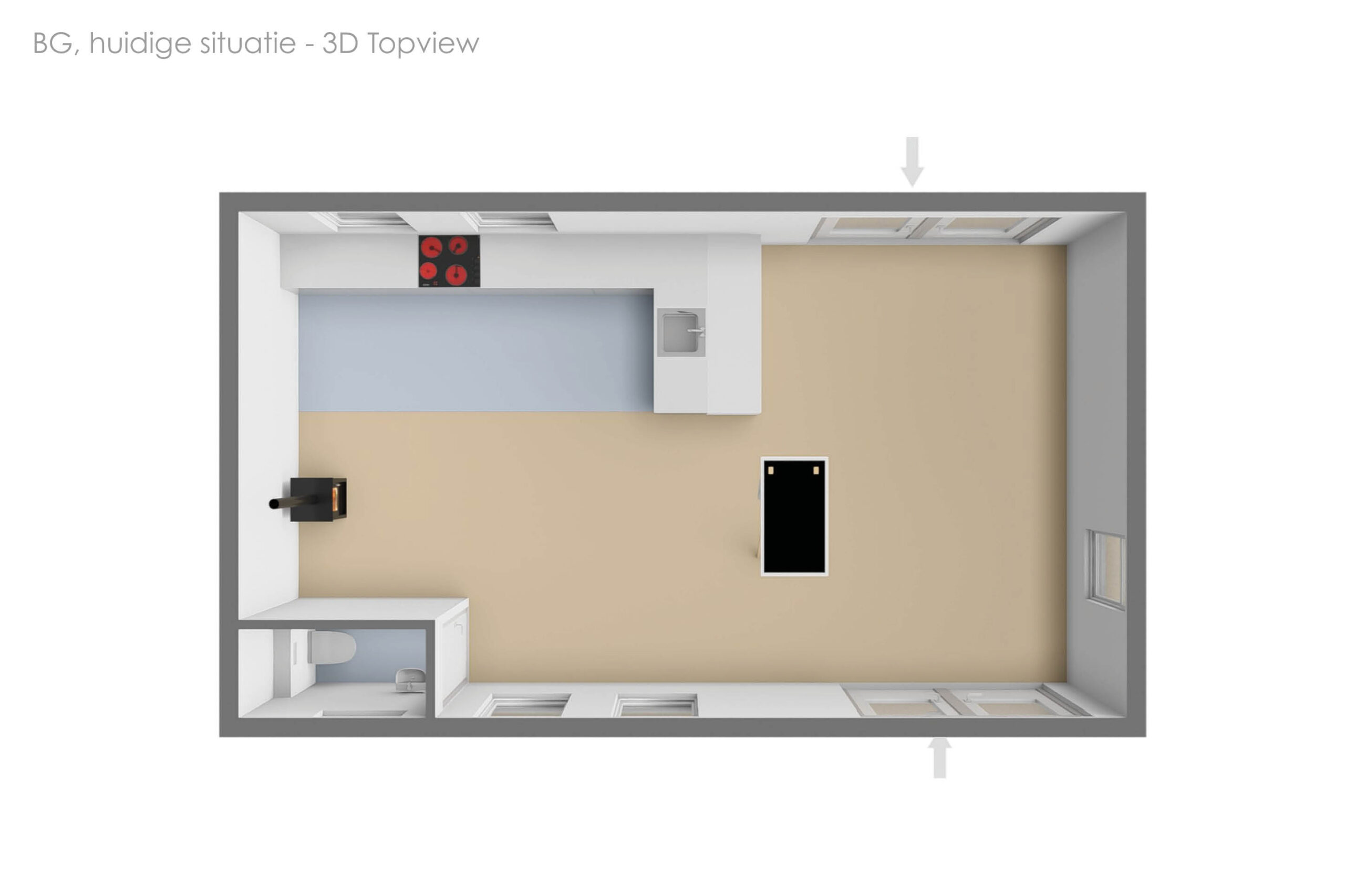 Binnen, op de begane grond zijn al een keuken en een toilet aanwezig. Via de openslaande deuren in de woonkamer stap je direct de tuin in. De verdieping is momenteel nog bereikbaar via een vlizotrap, en biedt ruimte om bijvoorbeeld twee slaapkamers en een badkamer te realiseren (zie ook de plattegronden voor een mogelijke indeling). Ook kan er eventueel nog een dakkapel geplaatst worden voor extra ruimte. Verder is het dak al geïsoleerd en is er een houtkachel aanwezig, kortom er ligt al een goede basis.