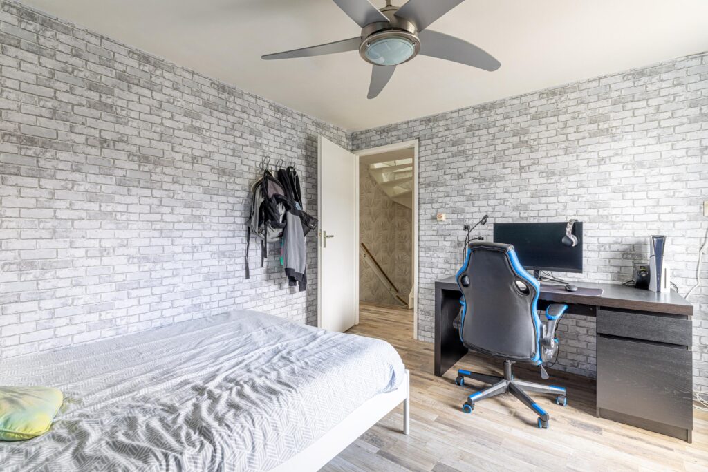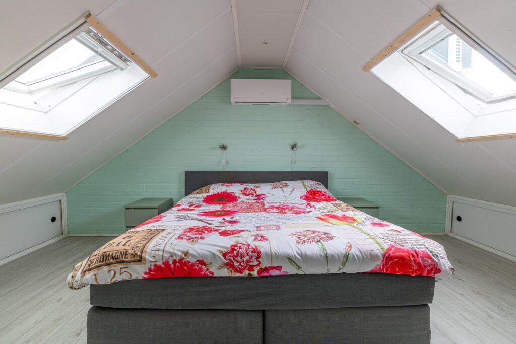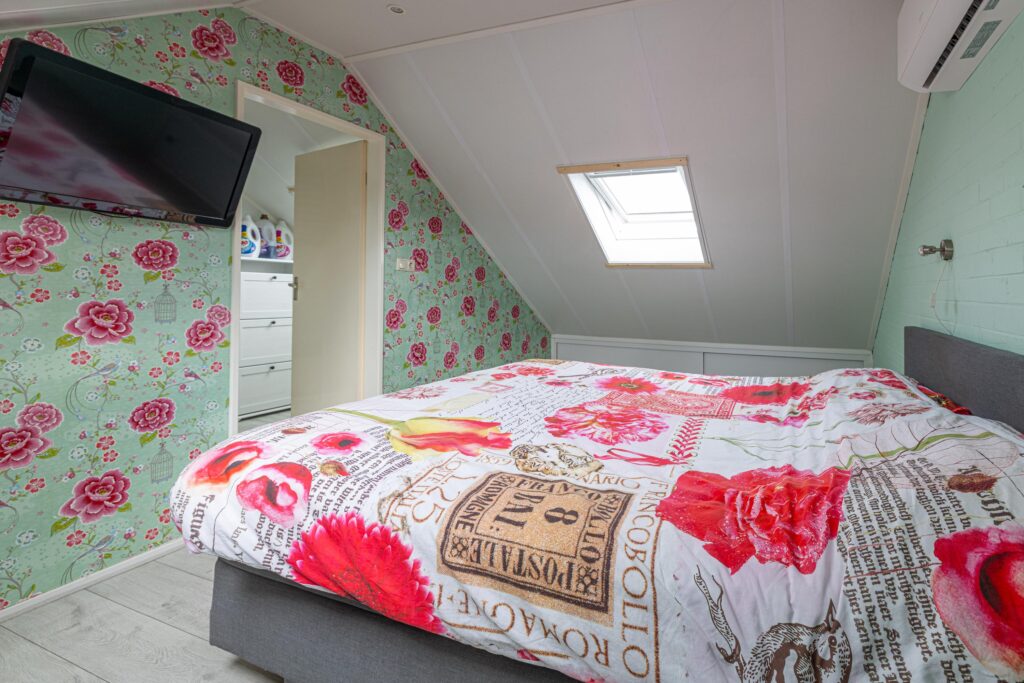Via een vaste trap bereik je de tweede verdieping. Hier vind je een overloop met praktische inbouwkast en de vierde slaapkamer. Deze verdieping is voorzien van een airco die zowel kan koelen als verwarmen. De zonnige achtertuin is gelegen op het zuiden en voorzien van een vrijstaande houten berging.